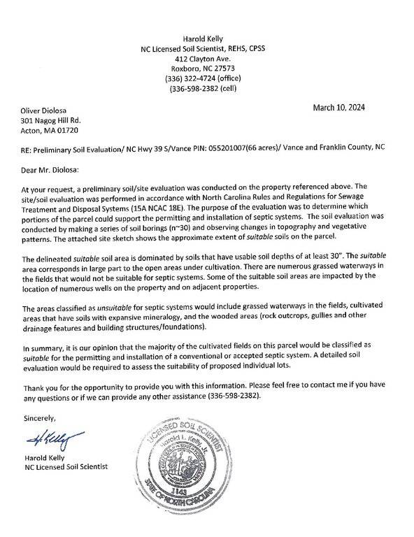 CALL TO OFFER. 40 lot subdivision with approved prelim plat. Soil work complete: all lots will be well and septic and sizes varying from 1-4+ acres. Beautiful, open landscape and setting bordering an active soybean / tobacco farm to the South. 2 ponds on West border of property. Soil report, survey and engineered construction plans (prelim) available by request to listing agent. Expected date to receive authorization for construction is mid-summer 2026. County will require Road Maintenance agreement and mild HOA to ensure integrity of aggregate road. Walking distance to brand new public park, Family Dollar, Edward’s Grocery, fire department and local ministries.