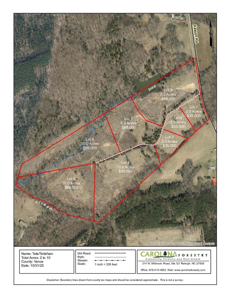 One of three 10 acre lots for sale near Kerr Lake in Vance Co. Property is open and wooded with several level building sites. Ideal for horses, farming, and recreation with Island Creek boat ramp 5 minutes away. Access is via a 60ft easement on a private gravel road. Soil report shows suitable soil for a conventional septic system. Minimal restrictions. No time limit to build. Convenient to Henderson, Oxford, Kerr Lake and I-85. Broker interest.