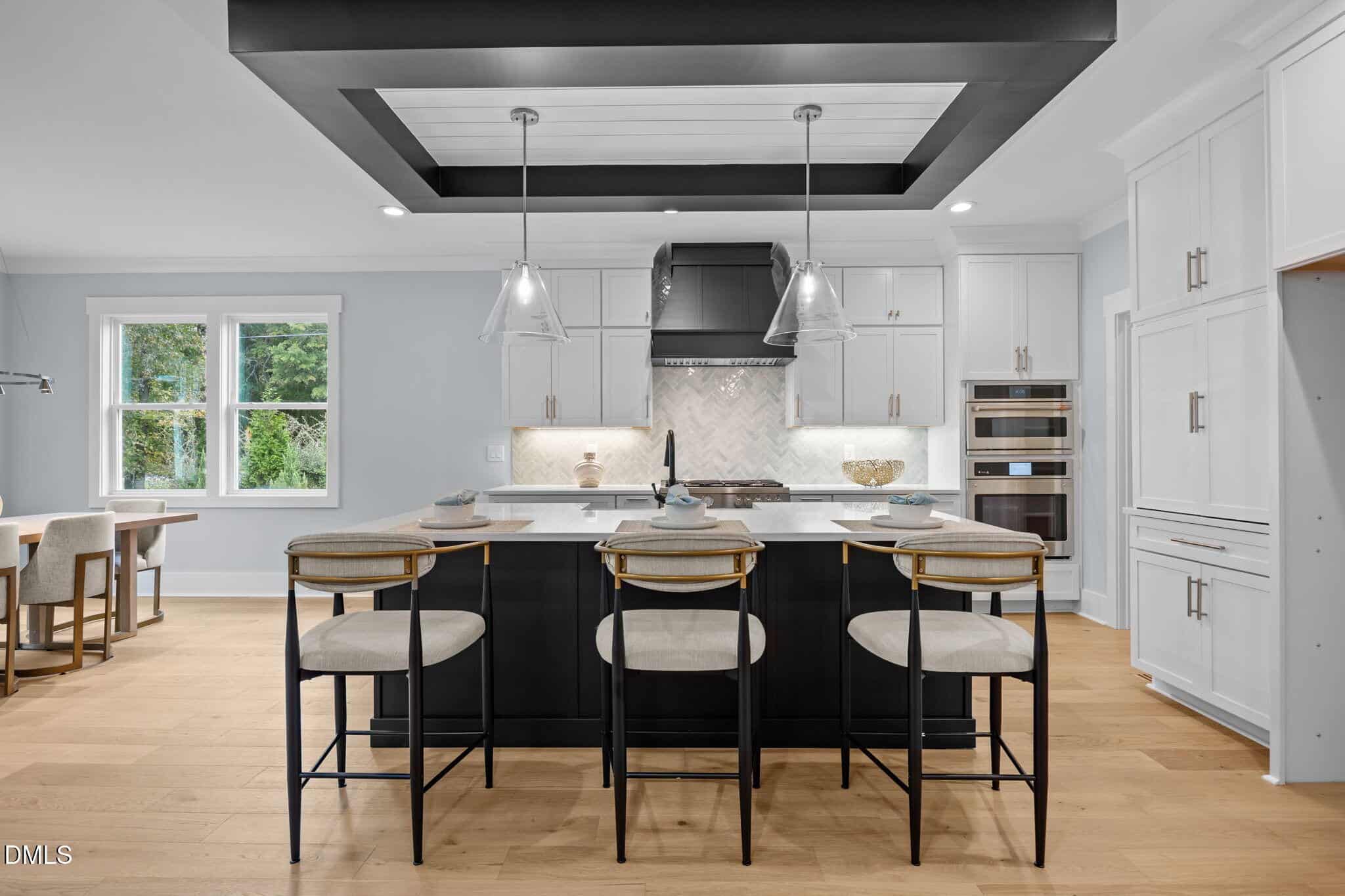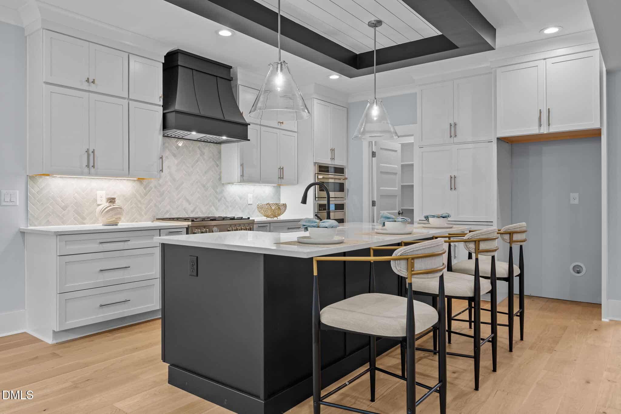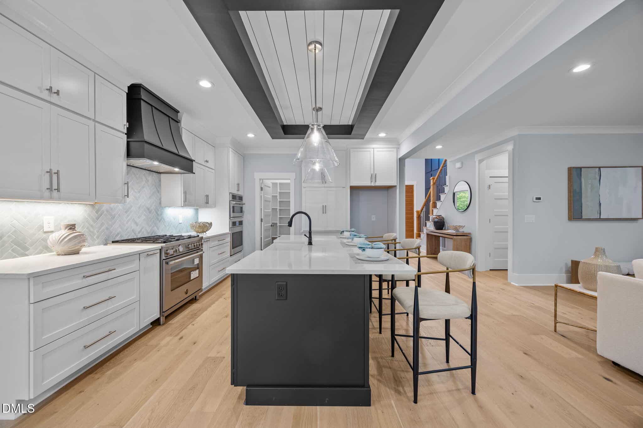 The gourmet kitchen: features a reverse tray ceiling with shiplap, timeless white quartz countertops, custom white cabinetry to ceiling, elegant herringbone laid tile backsplash, stainless appliances including gas range and painted hood range, accent painted island with barstool seating and white farm sink and spacious walk-in pantry!