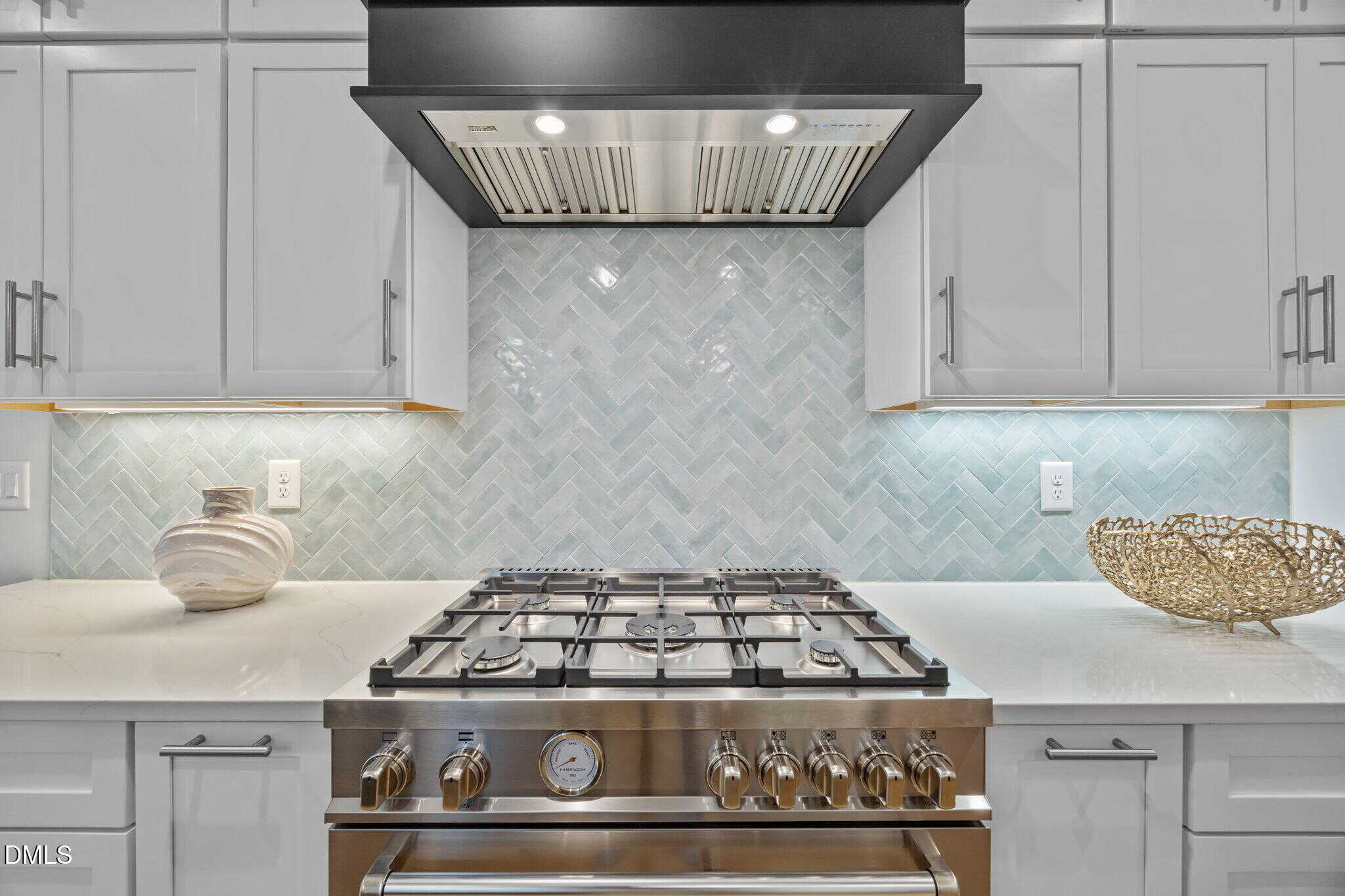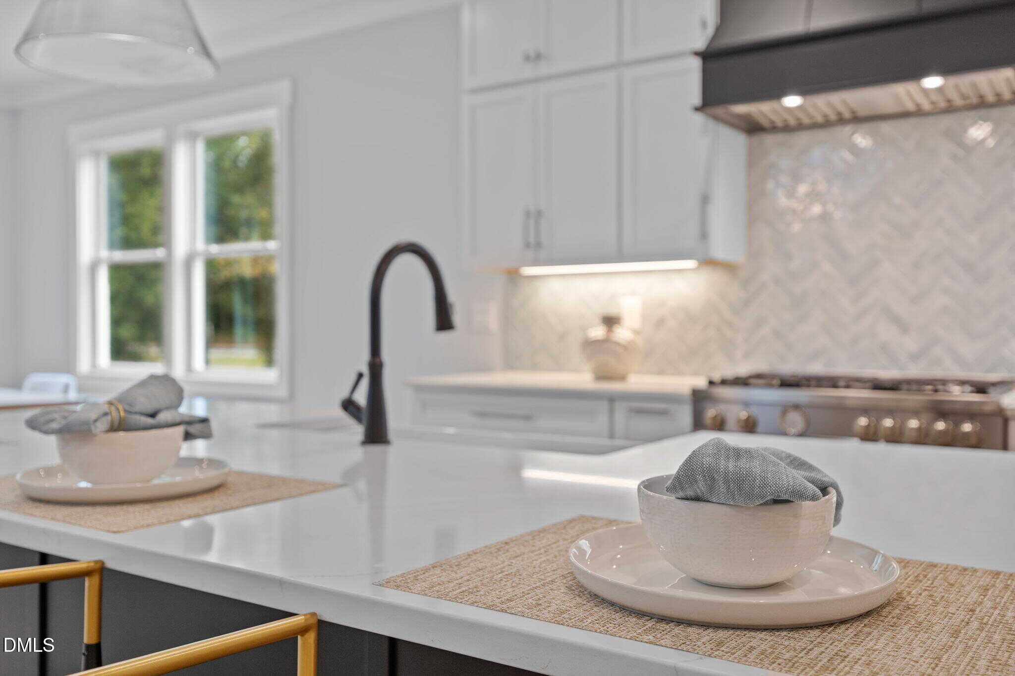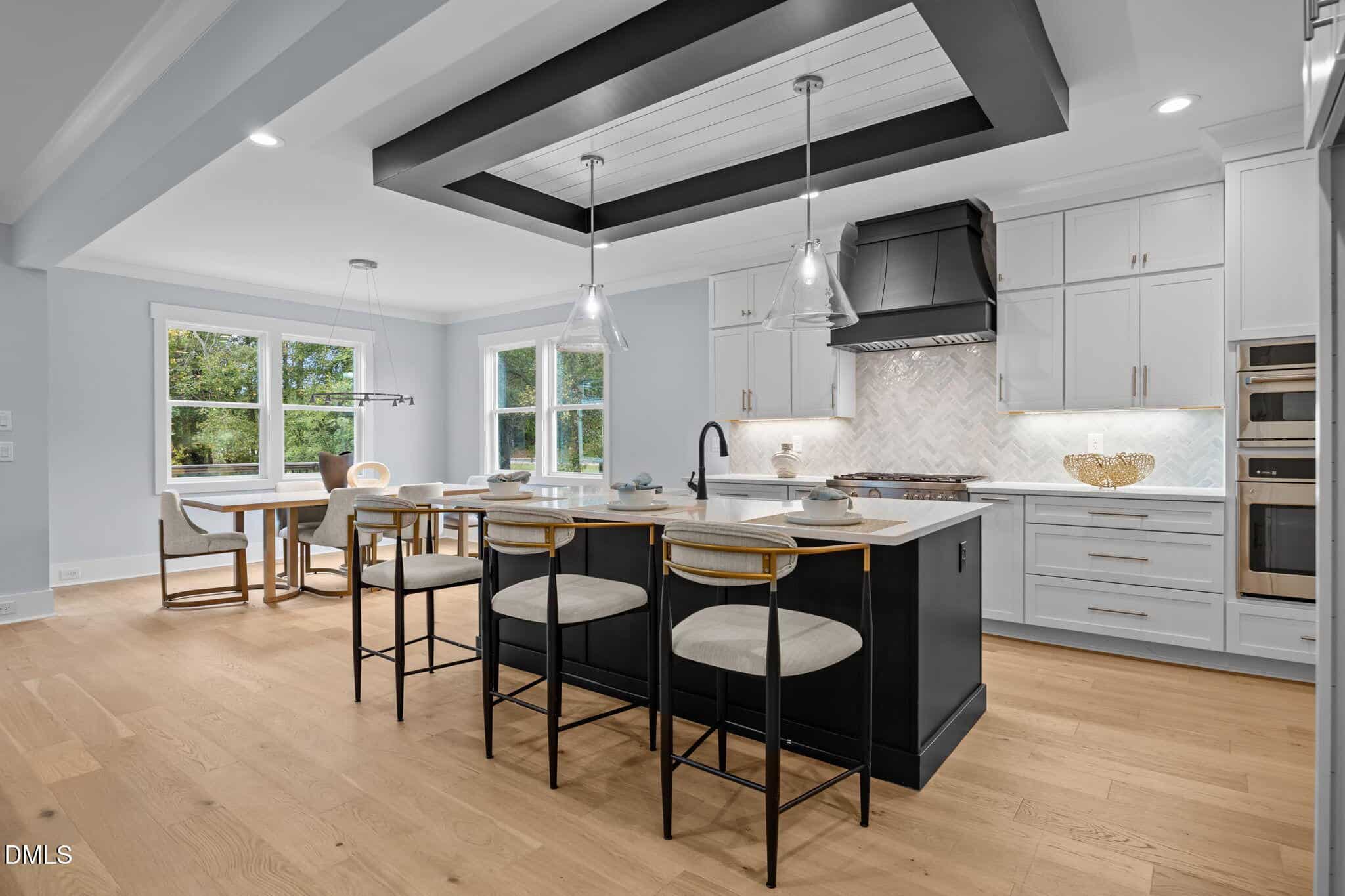 The gourmet kitchen: features a reverse tray ceiling with shiplap, timeless white quartz countertops, custom white cabinetry to ceiling, elegant herringbone laid tile backsplash, stainless appliances including gas range and painted hood range, accent painted island with barstool seating and white farm sink and spacious walk-in pantry!