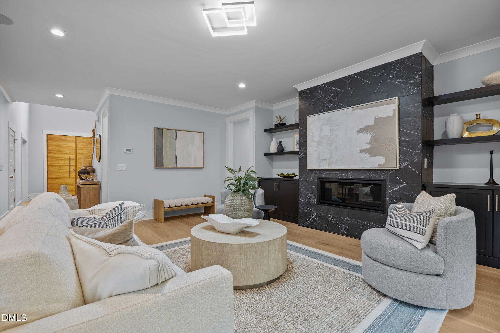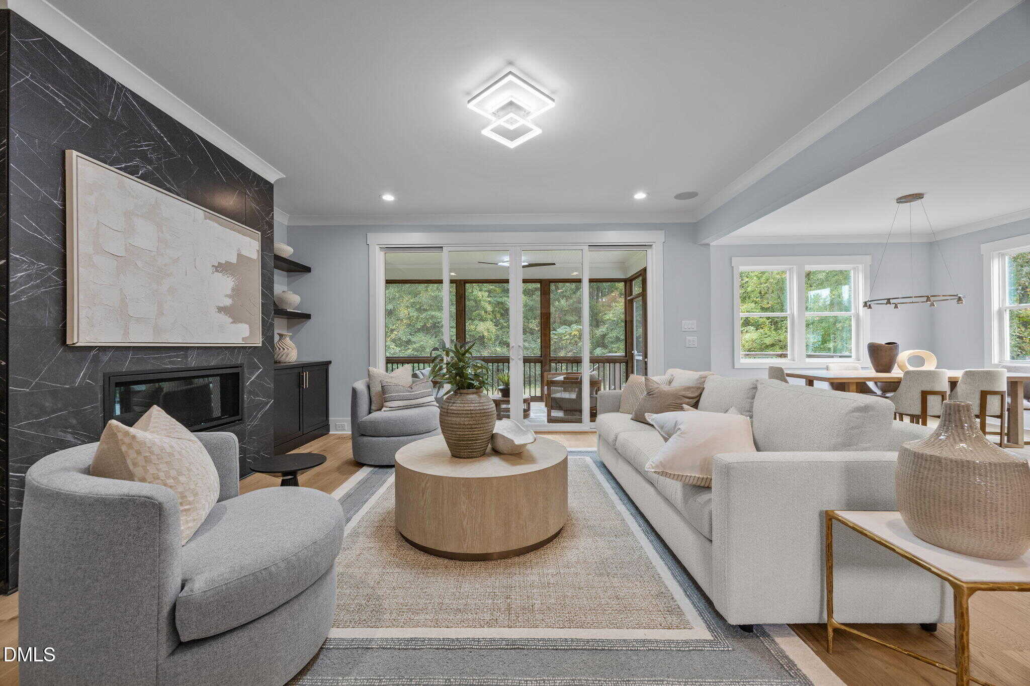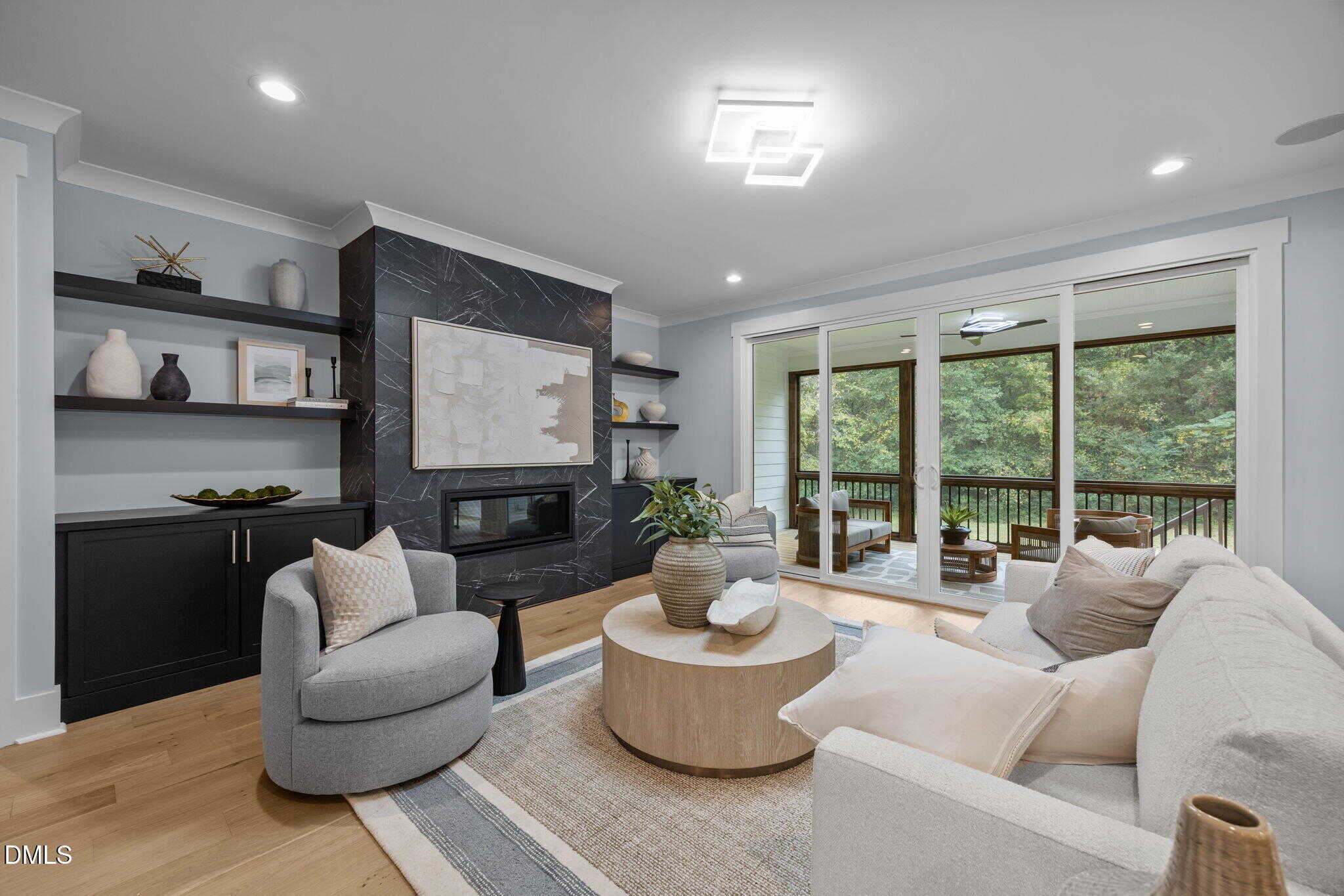 The family room: features a linear fireplace wrapped in ceiling height black granite with flanking built-in cabinets and floating shelves and glass sliders to the rear screened porch and grilling deck.