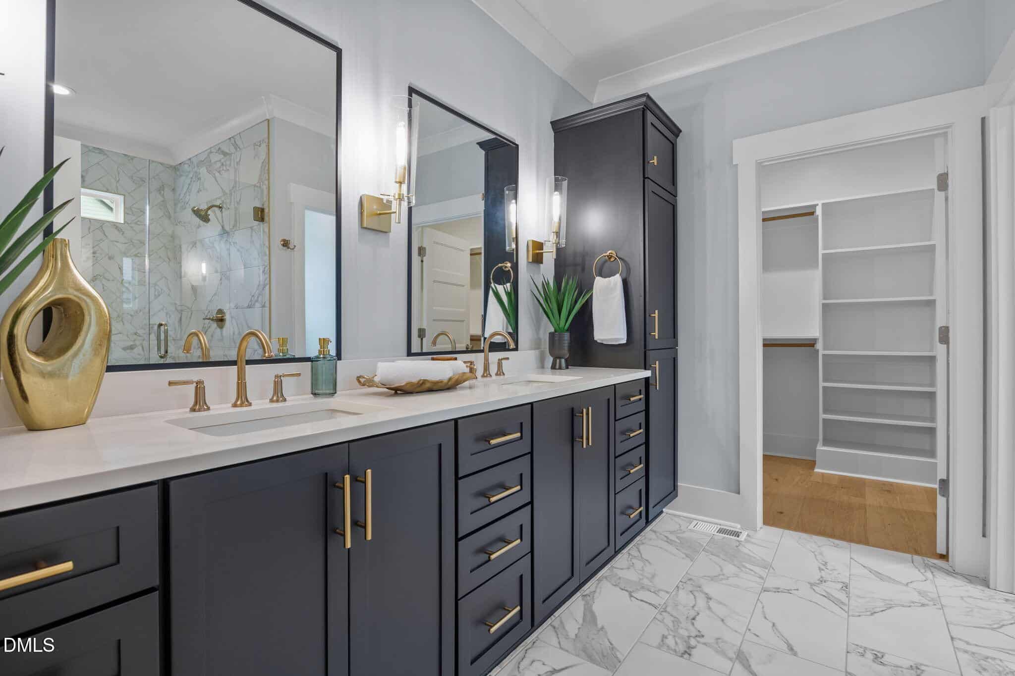 Owner’s suite: offers hardwoods, accent painted ceiling and luxuriou spa-style bath with painted dual vanity with sconce lighting and linen tower, tile to ceiling surround shower with full length bench and frameless glass and huge walk-in closet!