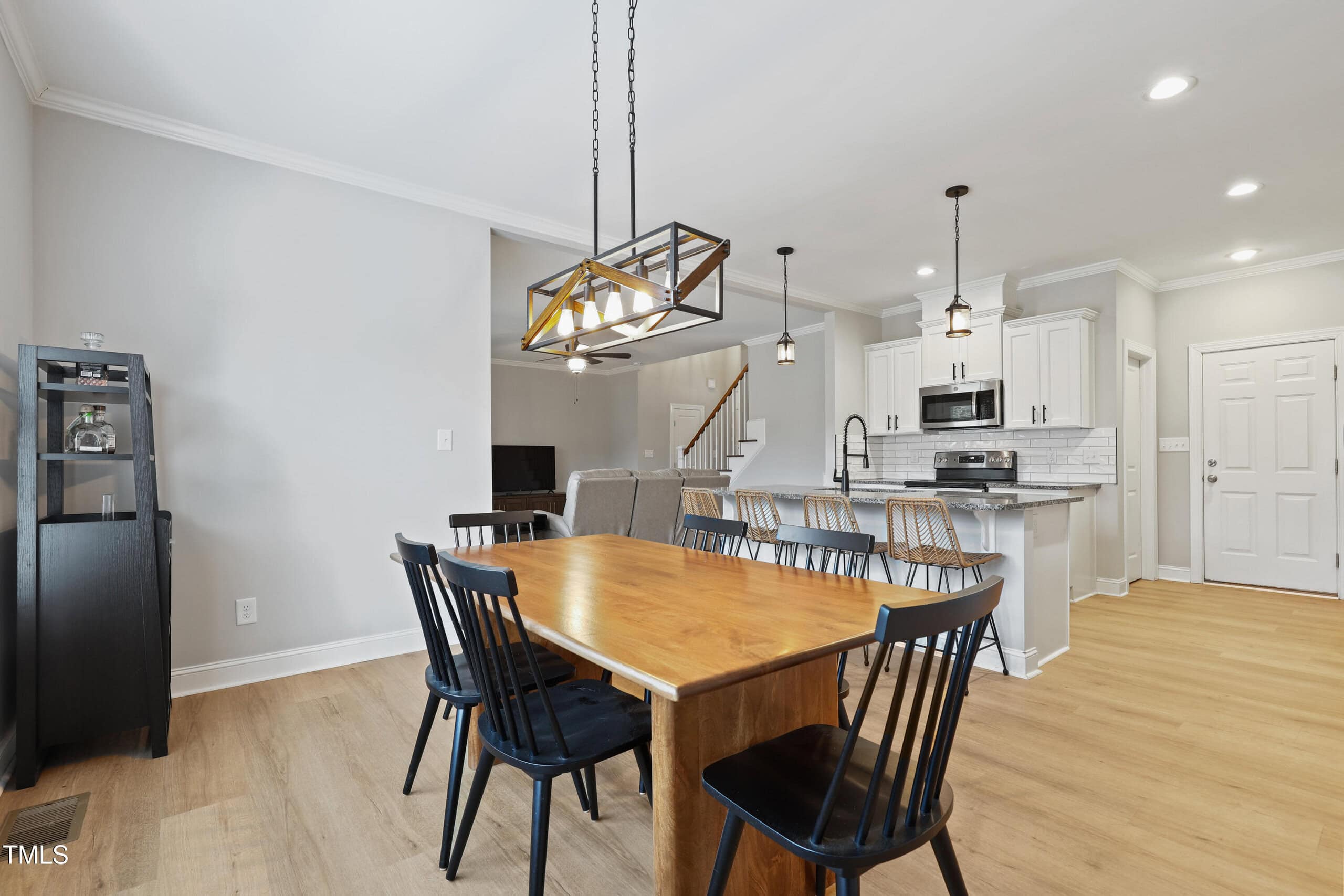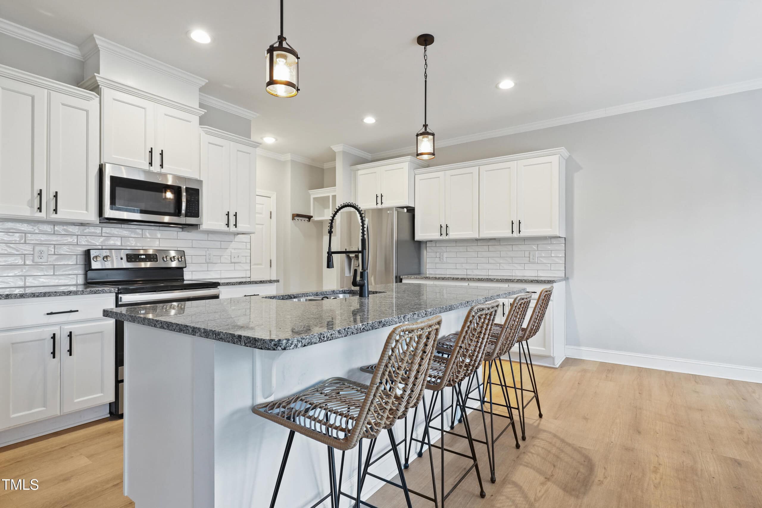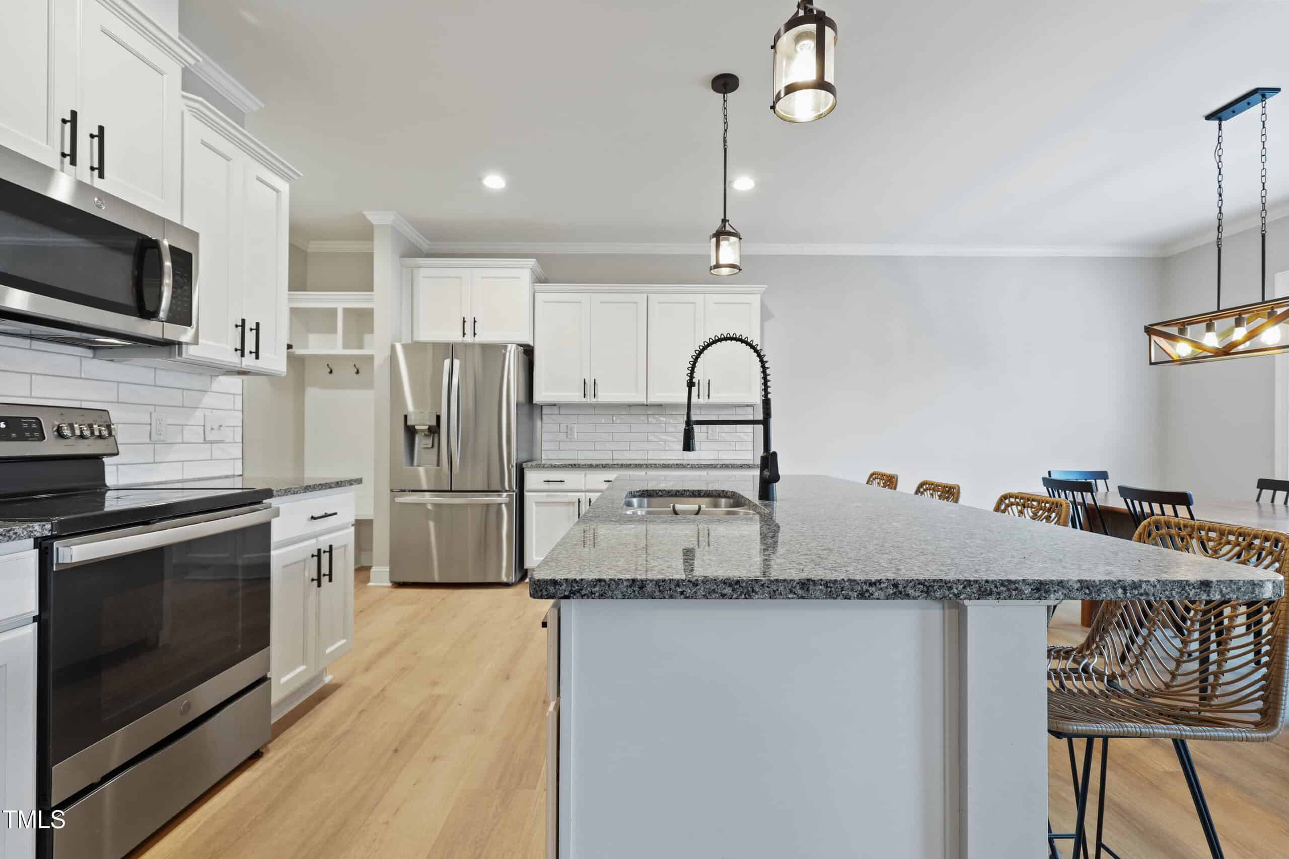 The stunning kitchen is outfitted with crisp white shaker cabinets, granite countertops, stainless steel appliances, and a large island – all complemented by a bright, airy dining area. For added convenience, the home includes a walk-in pantry and a mudroom for extra storage.