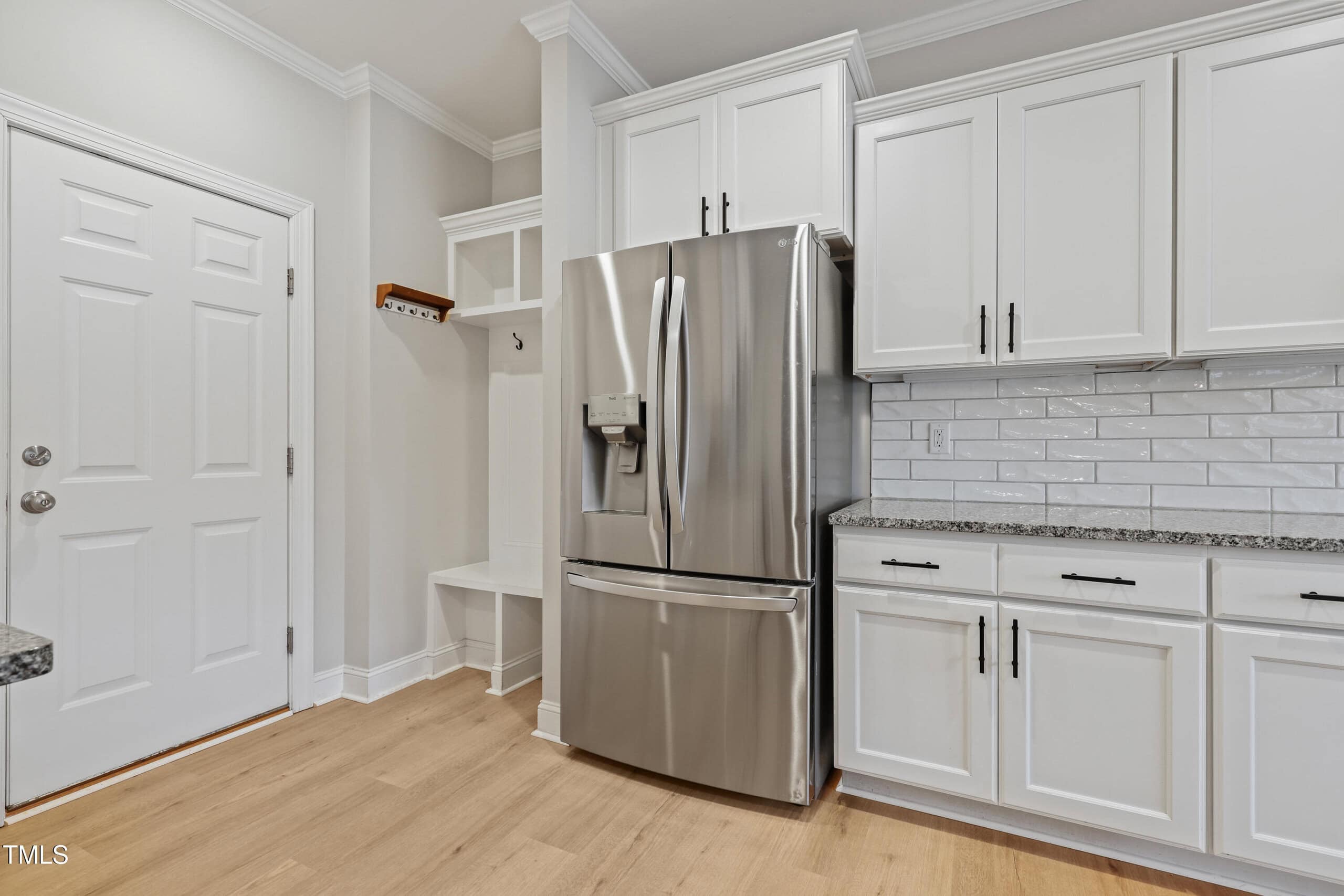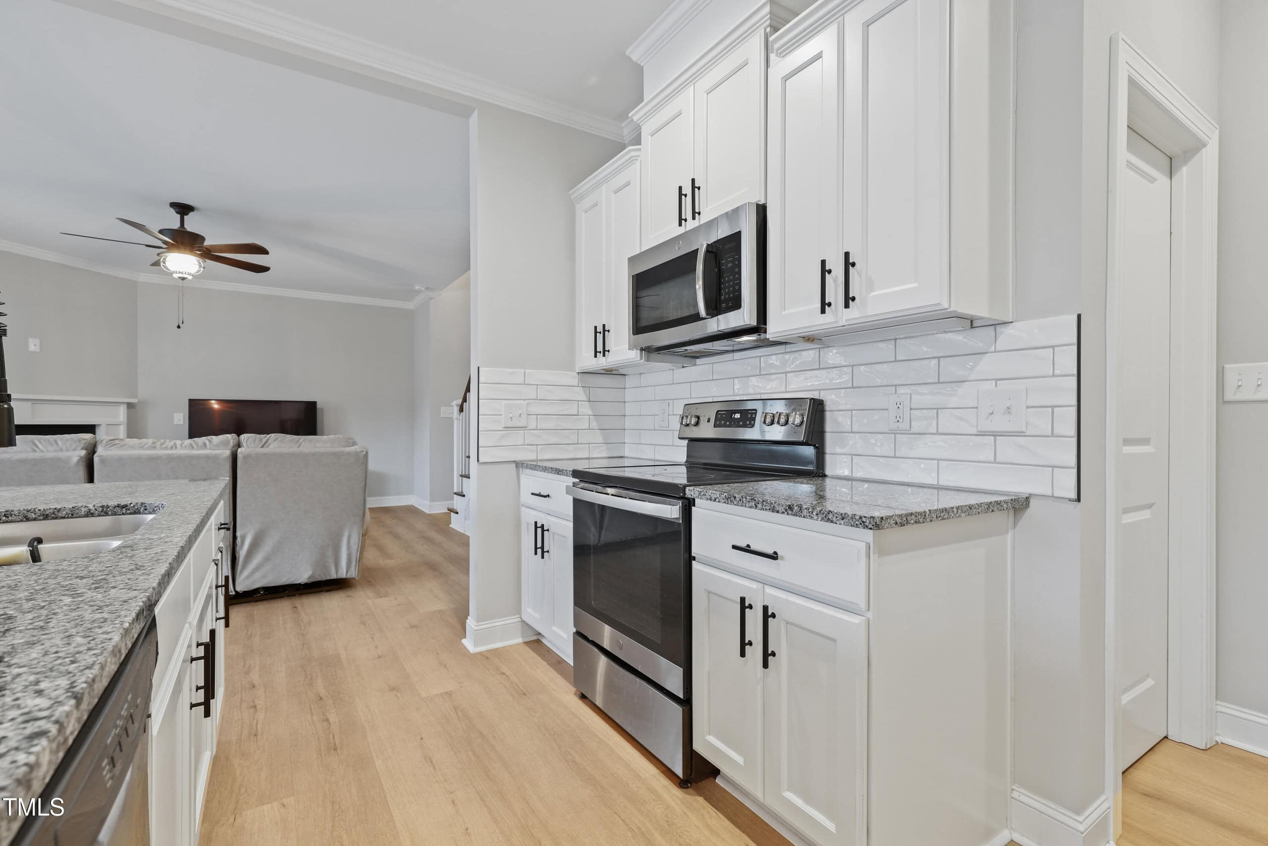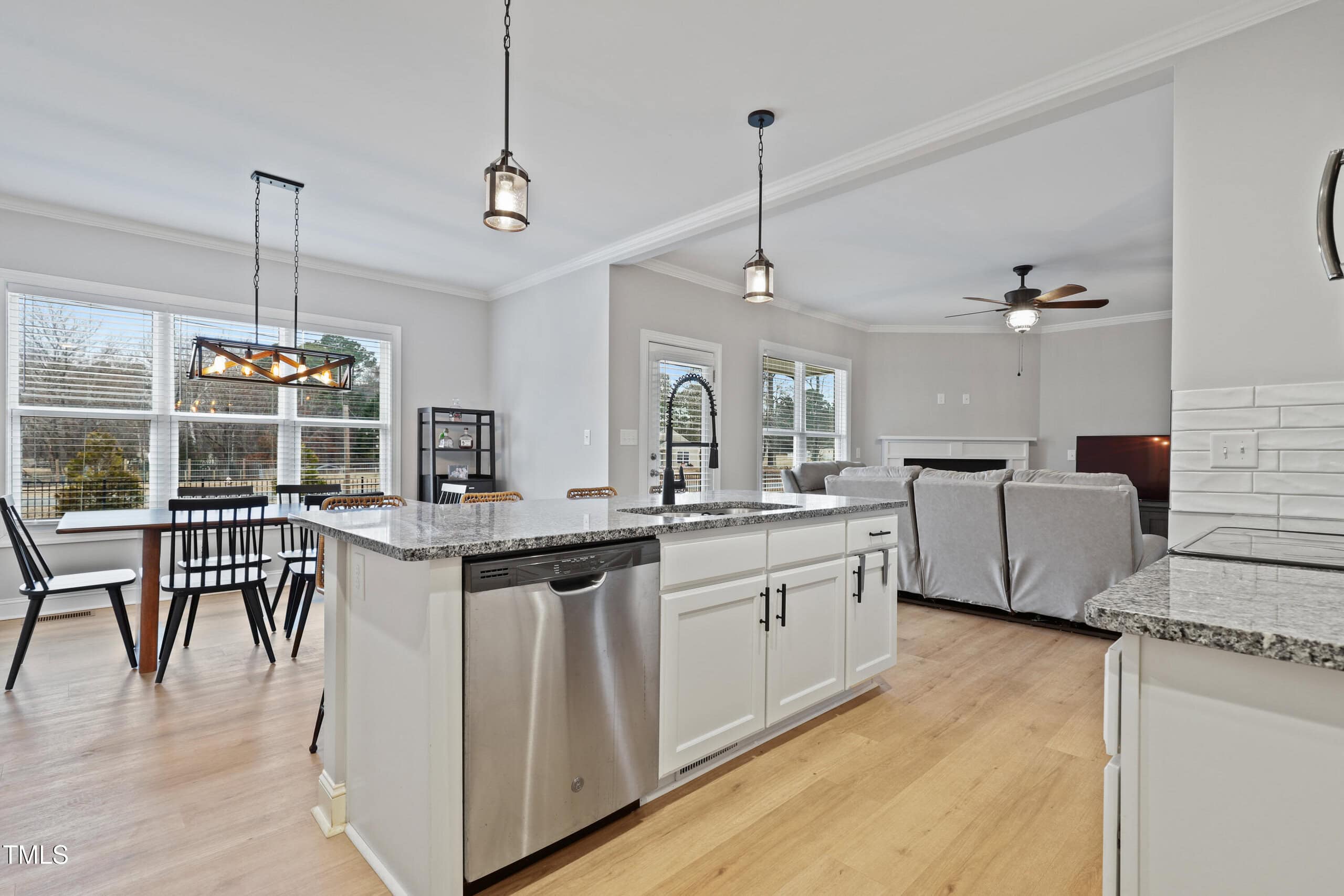 The stunning kitchen is outfitted with crisp white shaker cabinets, granite countertops, stainless steel appliances, and a large island – all complemented by a bright, airy dining area. For added convenience, the home includes a walk-in pantry and a mudroom for extra storage.