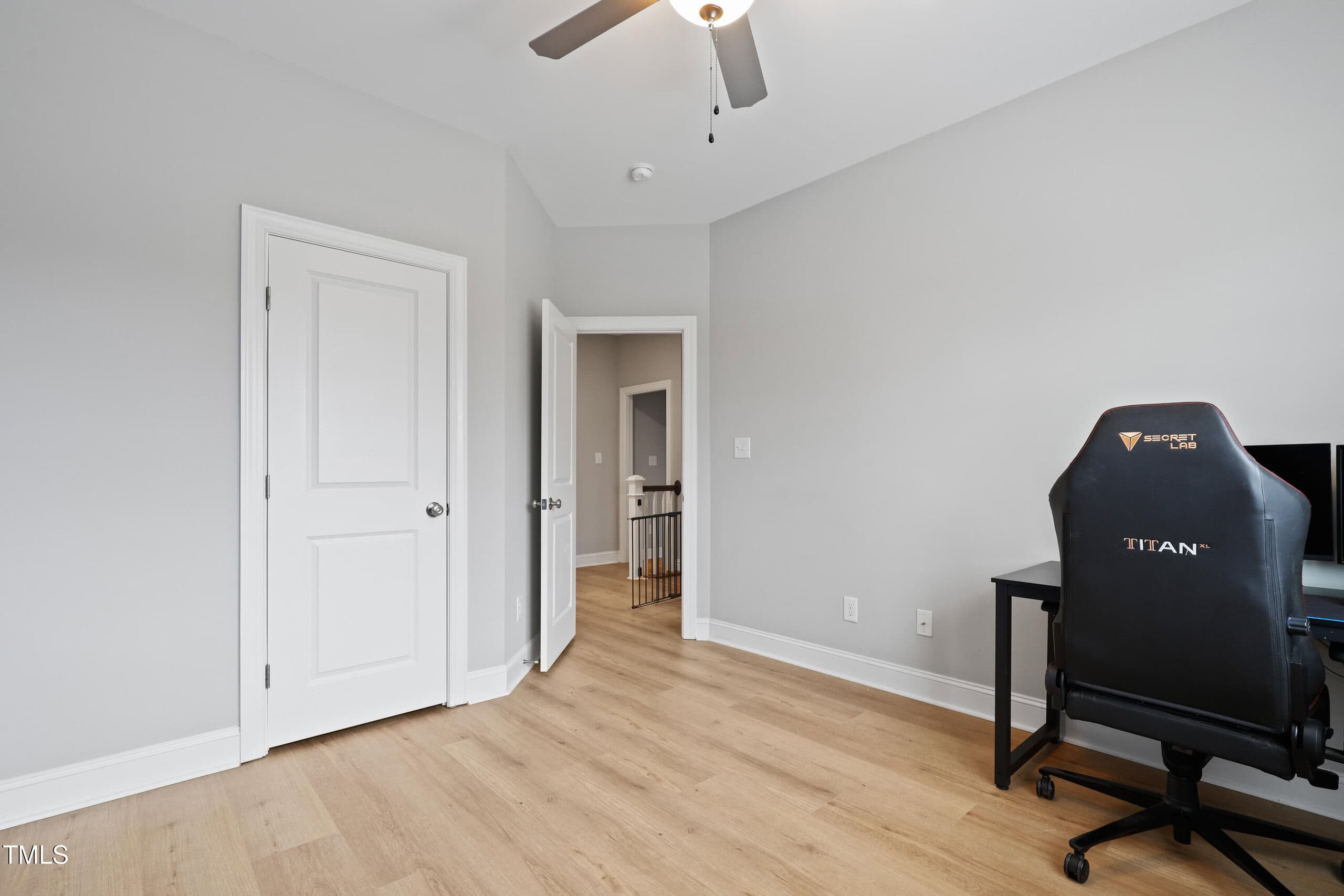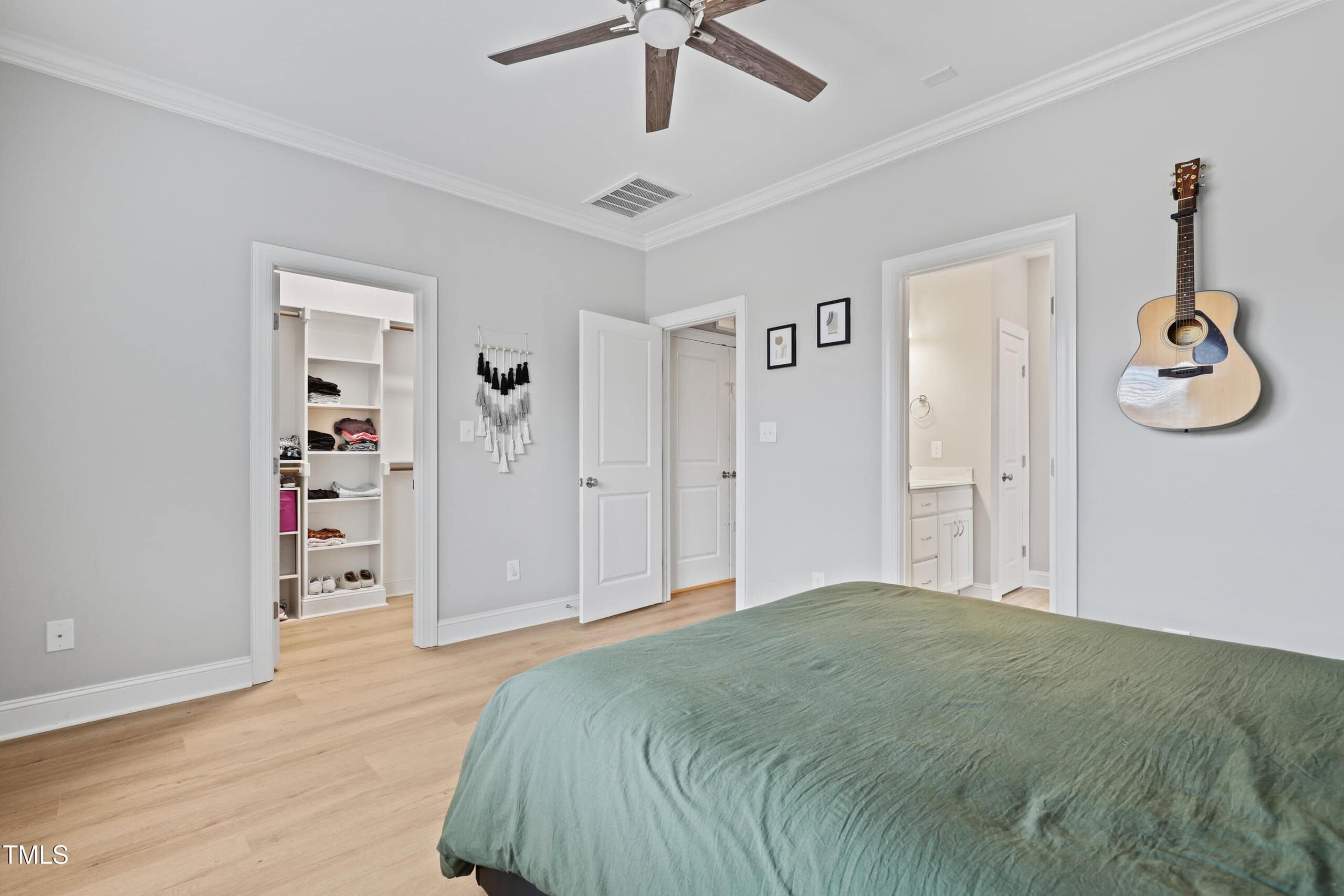 Upstairs, you’ll find LVP flooring throughout, two generously sized secondary bedrooms, and a versatile bonus room. The owner’s suite is a true retreat, featuring crown molding, a ceiling fan, and a large walk-in closet with wood shelving. The owner’s bath is beautifully finished with tile flooring, a tiled walk-in shower, and a dual vanity countertop.