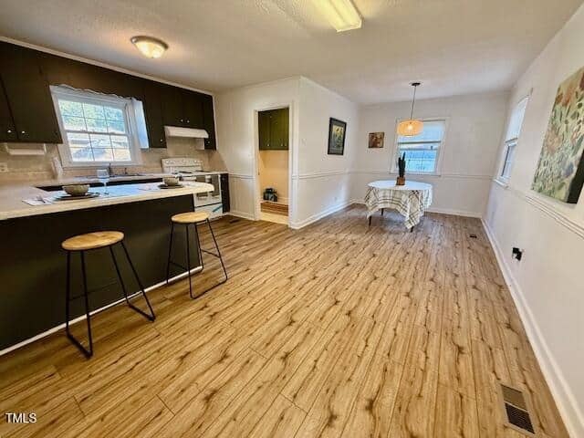 26′ long OPEN kitchen and Dining area has LVP floors, new stove, bar area w/ TV that stays, and extra natural gas wall heater for instant heat or when electricity is off ! Handicap accessible entry from 32×6 covered front porch into 17 x 13.5 LR w/ OAK flrs & opens to Kitchen . Tile flr & surround for tub/shower.. 3 bedrms & TV stays in Primary . Separate Laundry Rm. Freshly painted inside, New sump pump, Moisture Barrier and Trenches! Extra Metal shed for tools. CORNER LT w/ lots of road frontage. READY to MOVE IN!