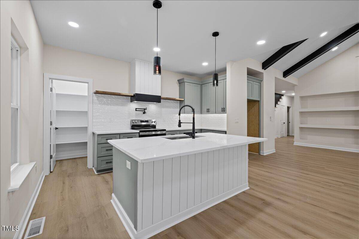The main level features a spacious primary suite with a walk-in closet and luxurious bath, along with two additional bedrooms, a full bath, and a convenient half bath. The open-concept kitchen is equipped with quartz countertops, a walk-in pantry, and a large island, flowing seamlessly into the dining and living areas with soaring ceilings, perfect for everyday living or entertaining. A dedicated office with its own closet adds versatility and can even serve as a fourth bedroom.