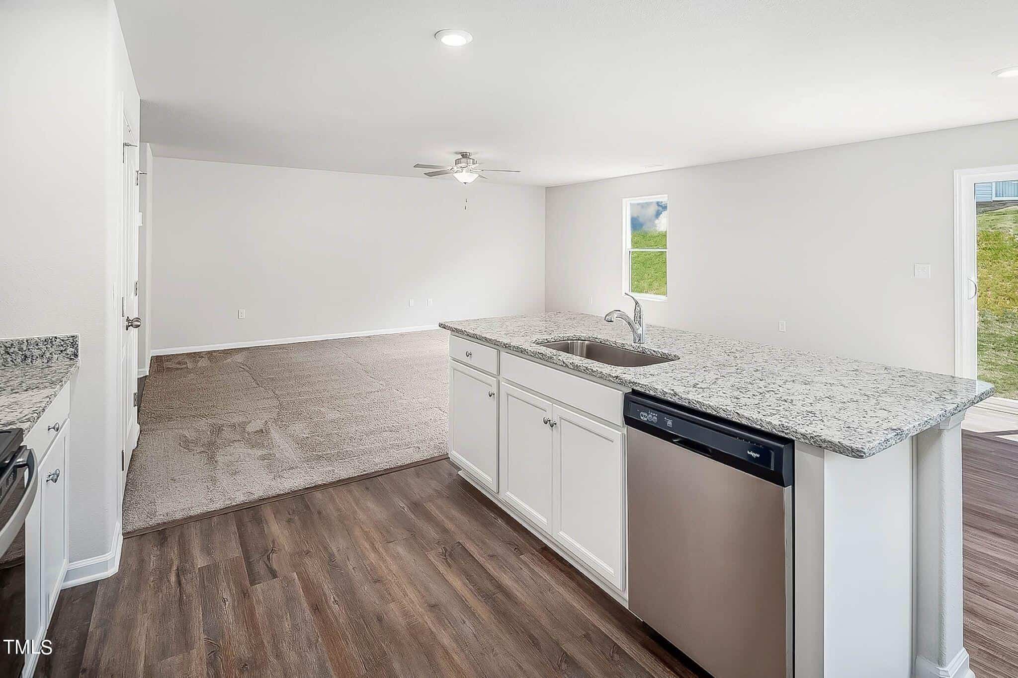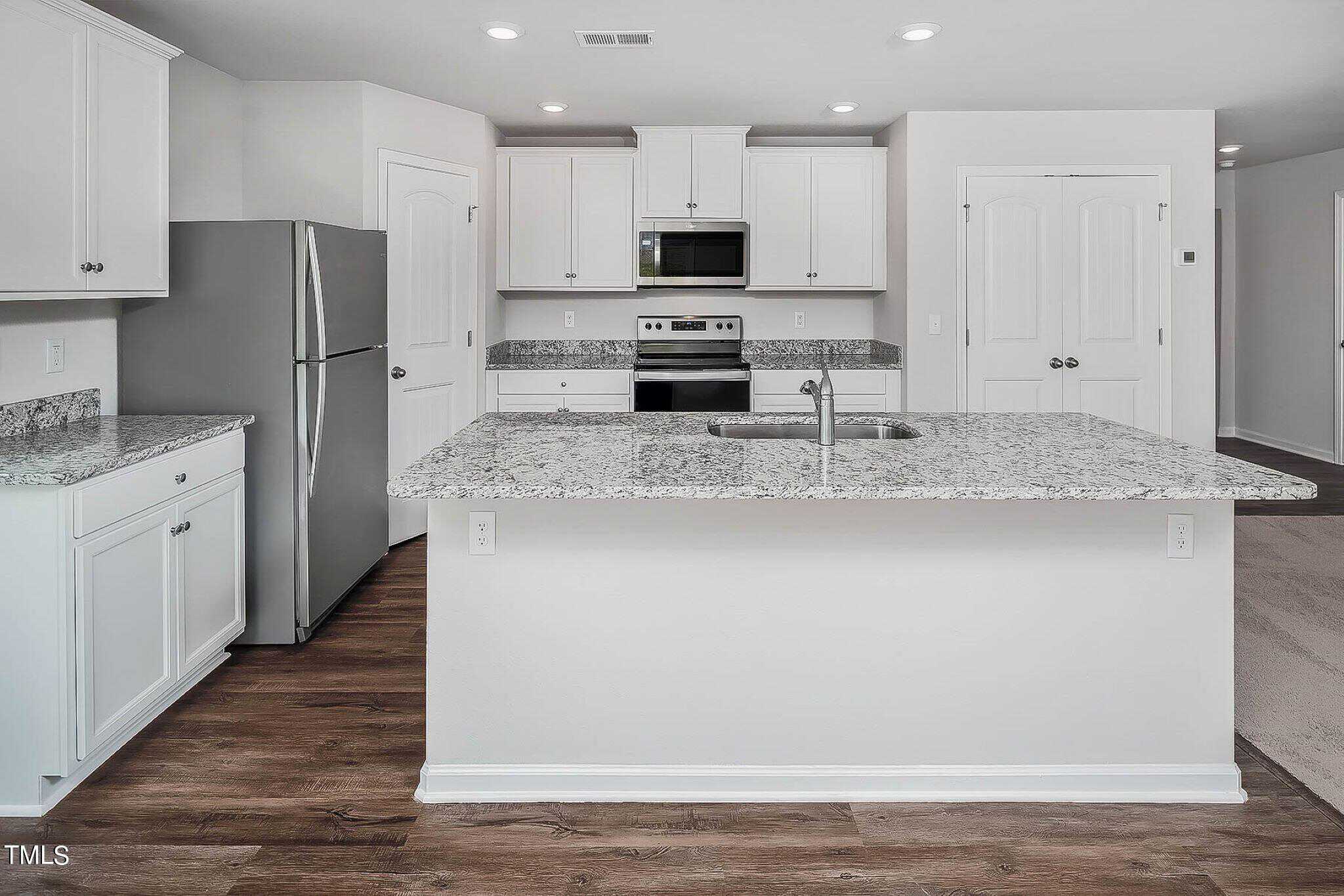 This 4-bed home Located on a beautiful corner lot has a spacious and airy feel that has been designed with your needs in mind. The large kitchen is open to the dining area and living room and has stainless steel appliances, gorgeous granite countertops, 36” upper cabinets with brushed nickel hardware and a large island.
