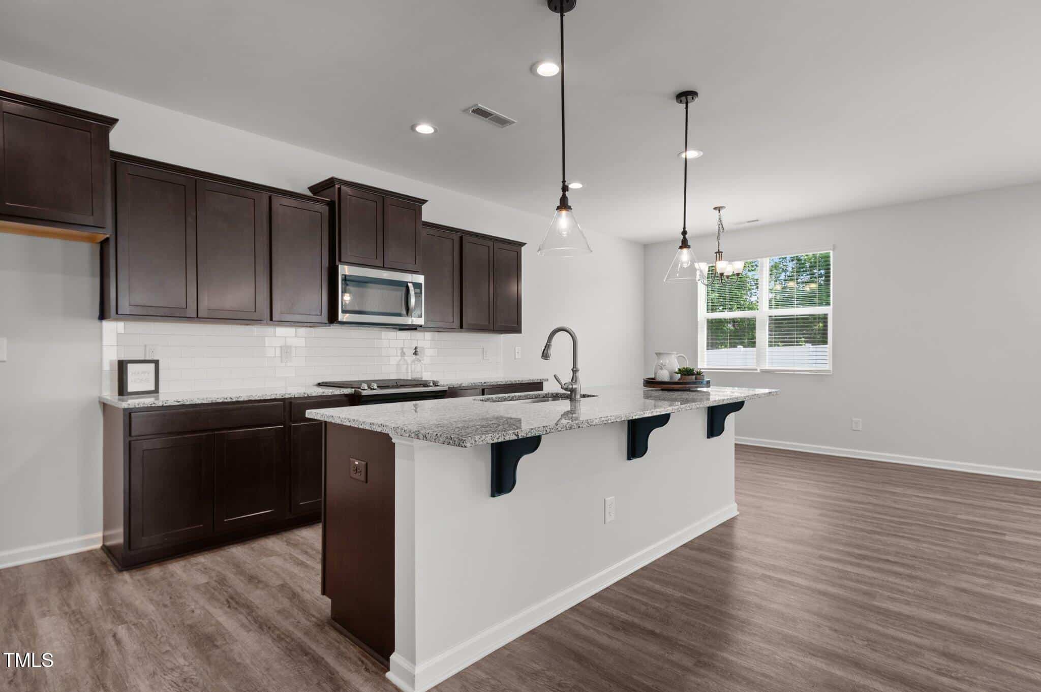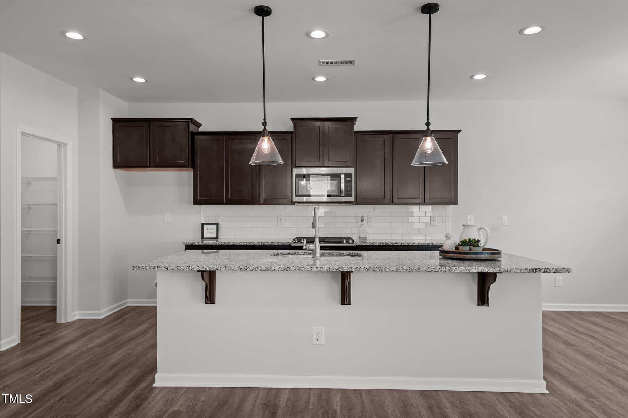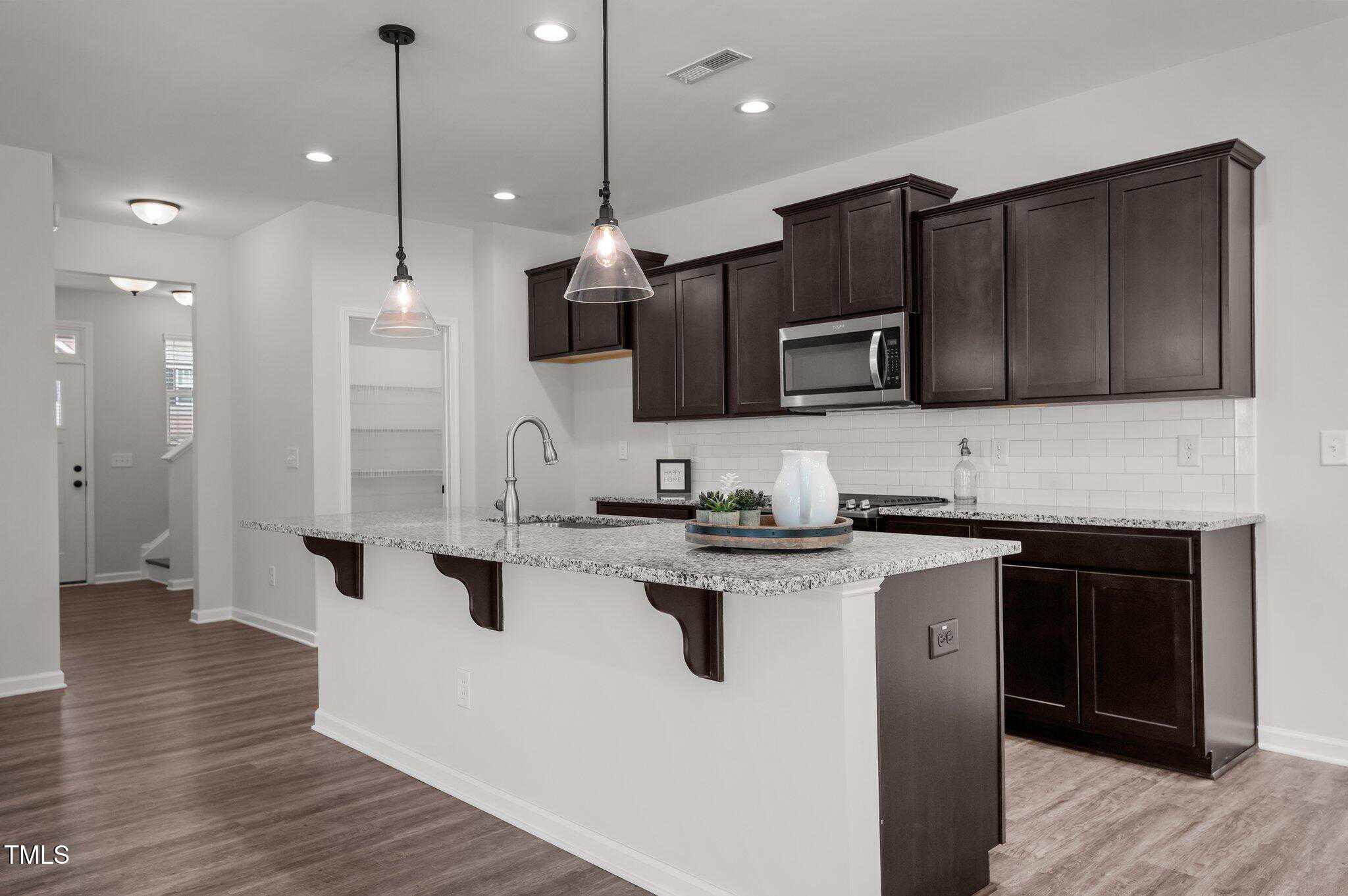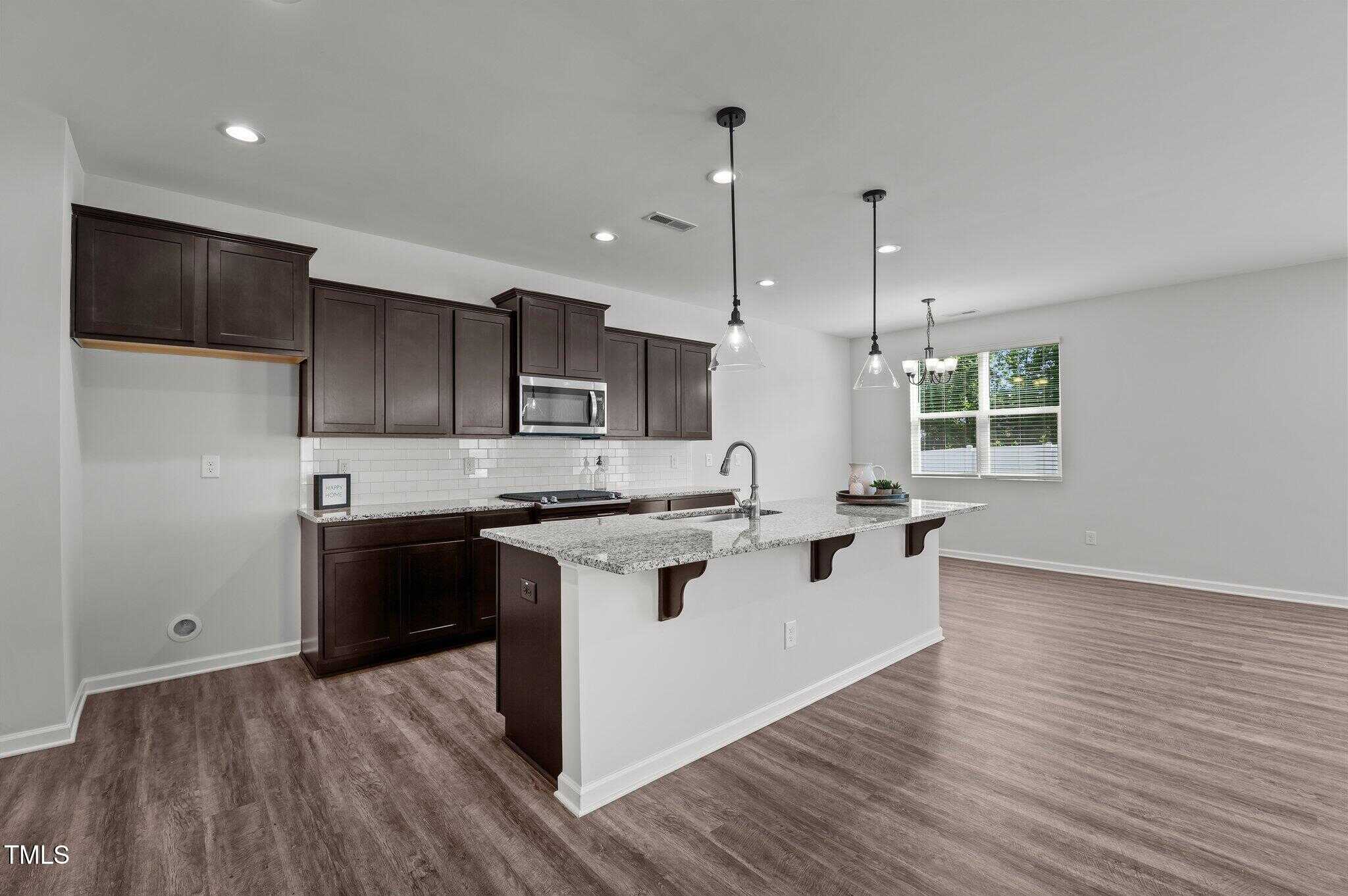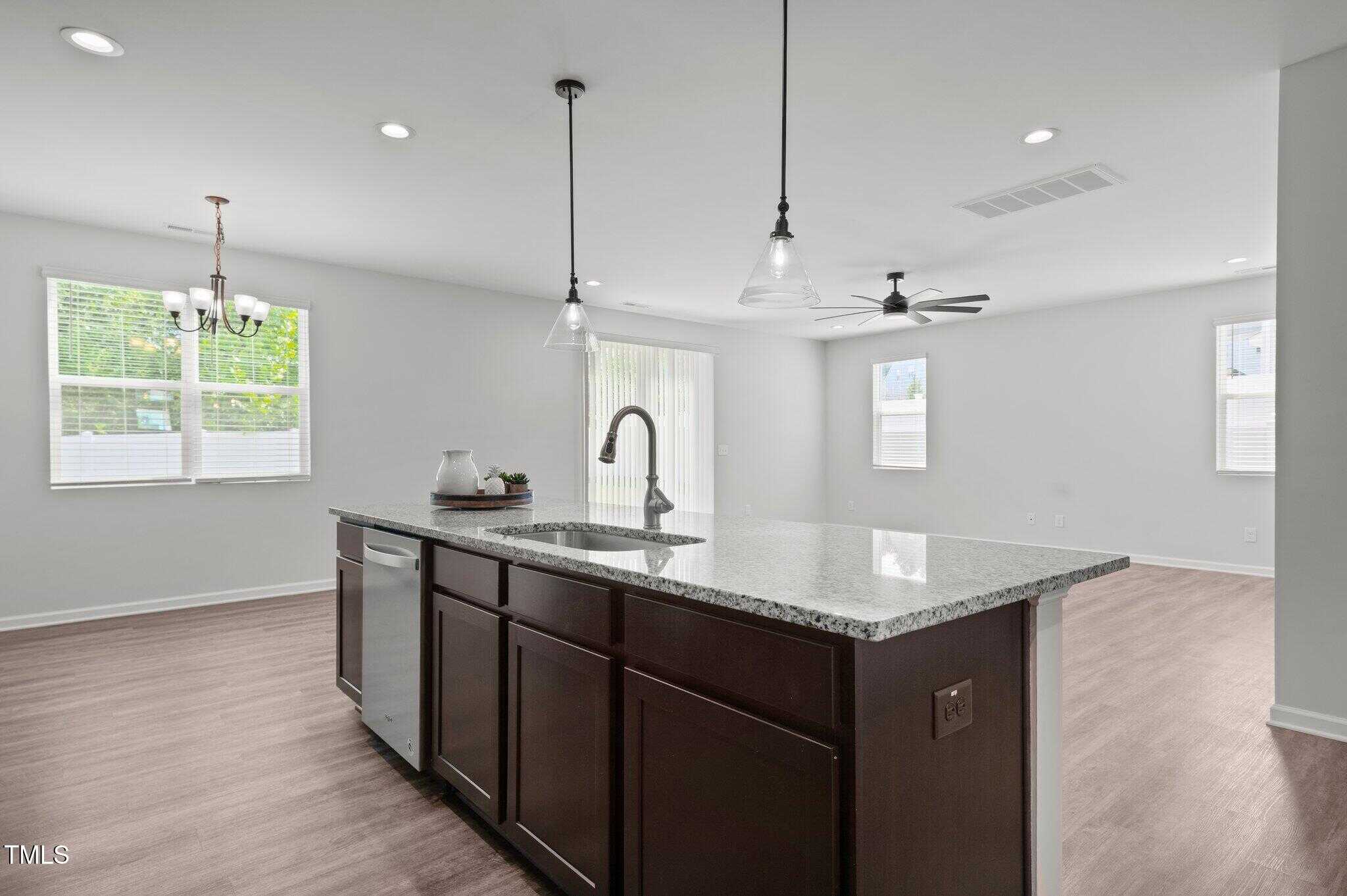 Fabulously maintained, freshly painted, open floor plan home with wood look laminate floors throughout. Kitchen with huge island opens to family room. Espresso colored cabinets, white subway tile backsplash, granite, walk in pantry in kitchen.