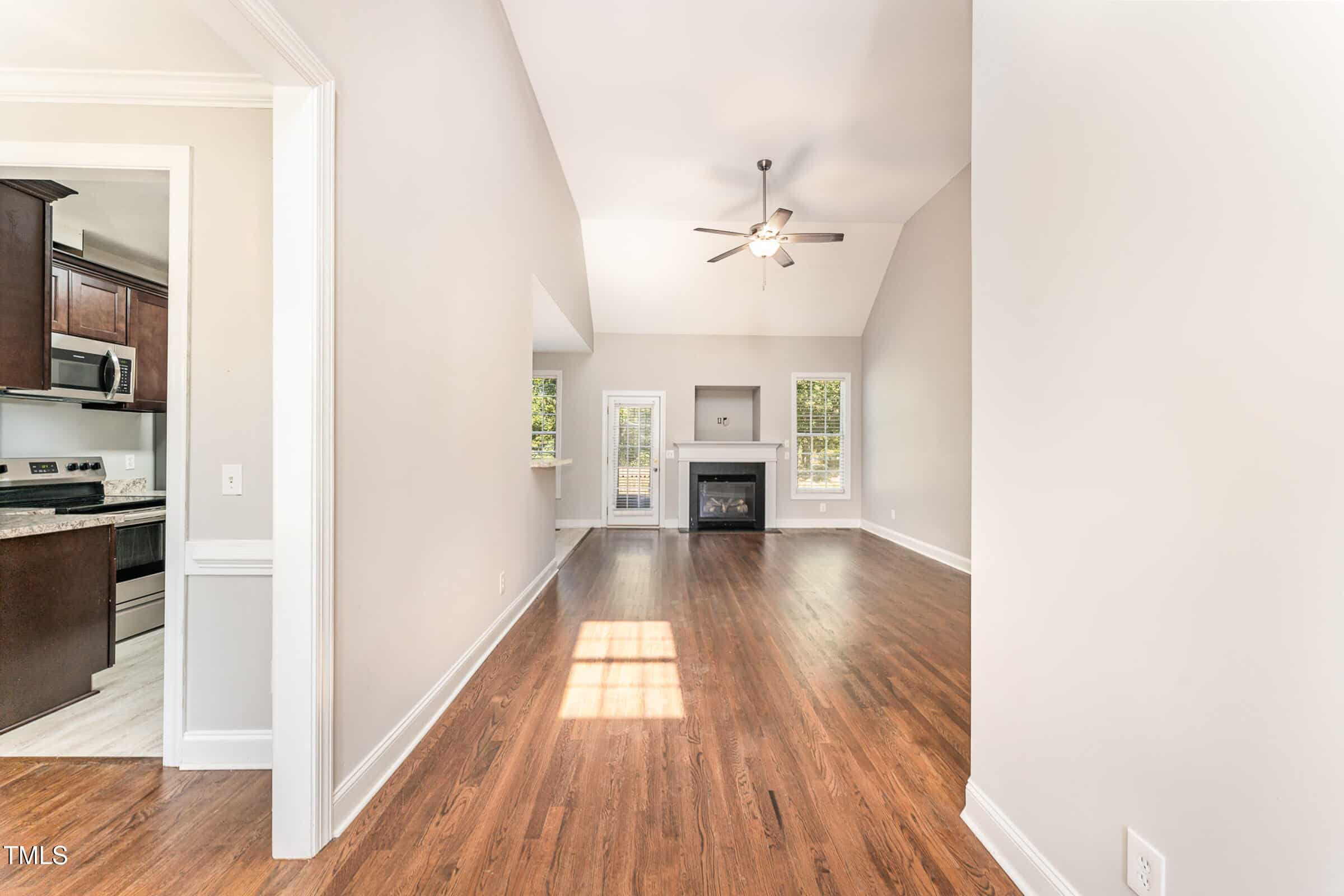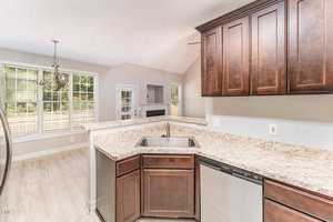 Large great room with fireplace, kitchen with breakfast area.