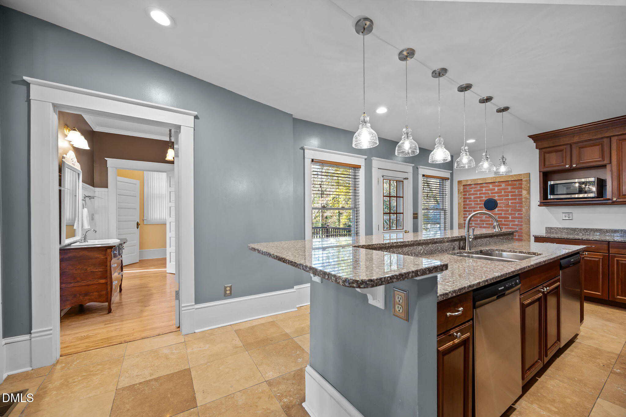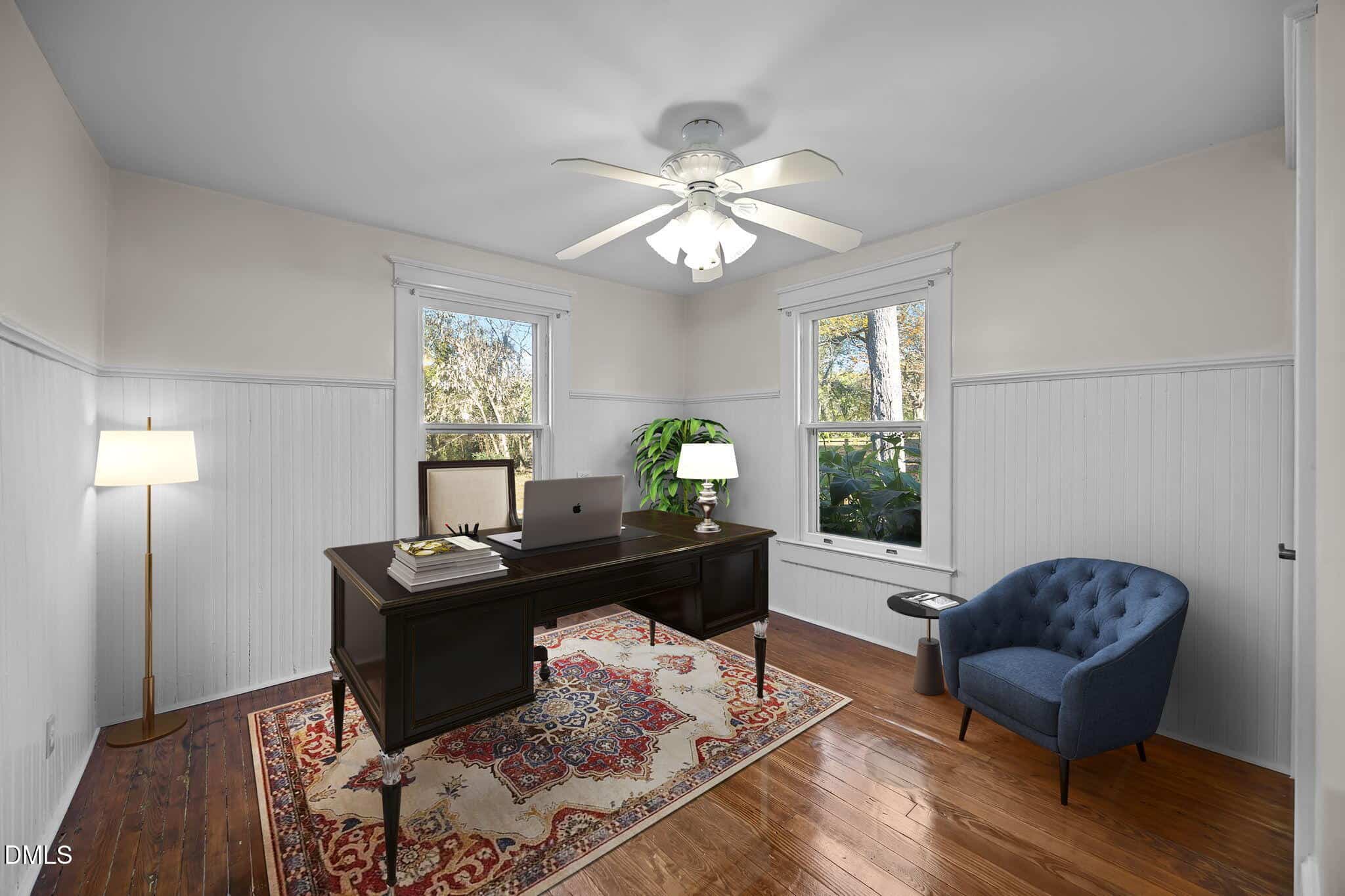 The updated kitchen blends modern convenience with historic charm with generous workspace, bar seating, and plenty of storage—perfect for today’s lifestyle. With five spacious bedrooms plus an office/flex space, this home offers flexibility for remote work. Recent upgrades include a new HVAC system for year-round comfort. The property’s layout and craftsmanship make it ideal for those who appreciate Southern architecture, classic design, and small-town living with easy access to the Triangle area. This Louisburg landmark is known as the Furguson-Hicks House and invites you to enjoy modern living wrapped in vintage Colonial Revival charm.