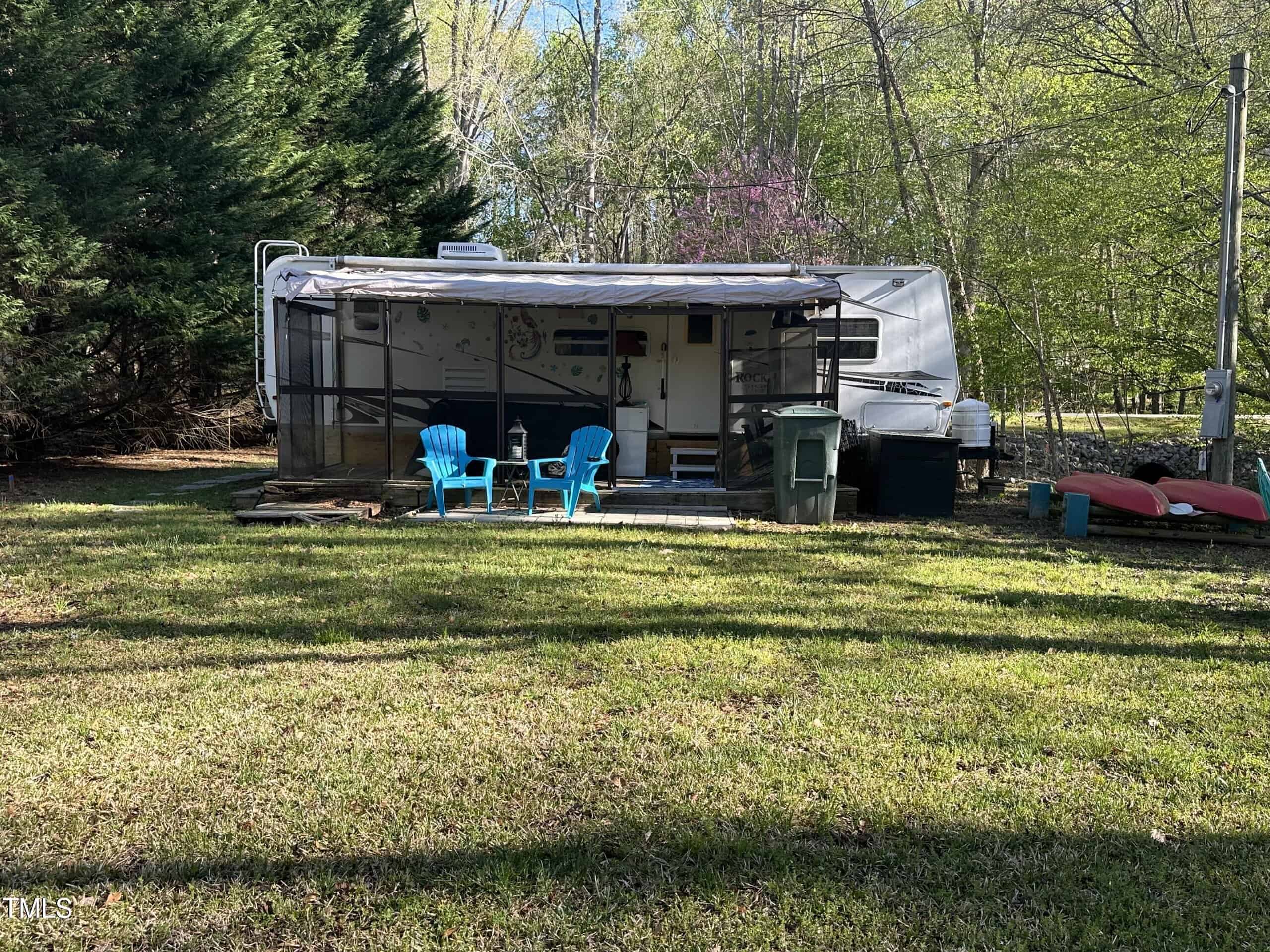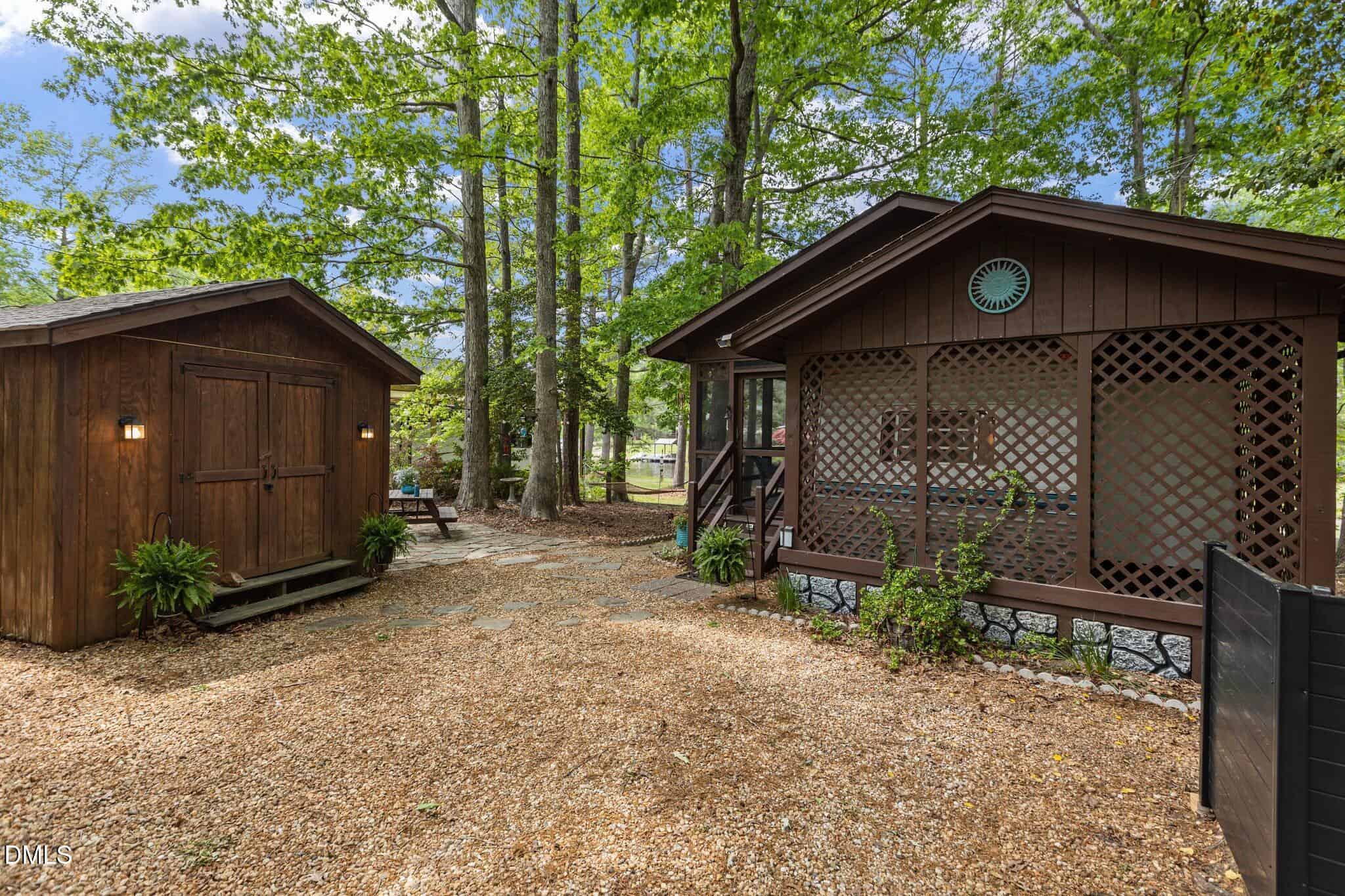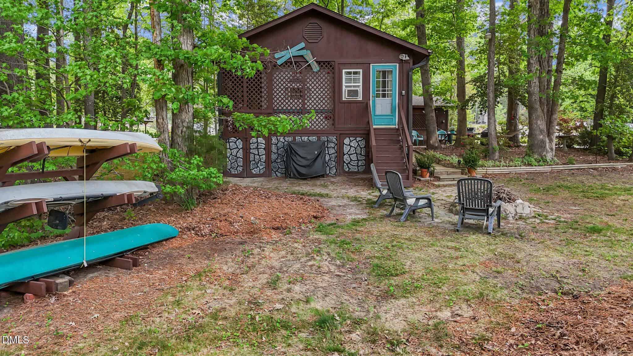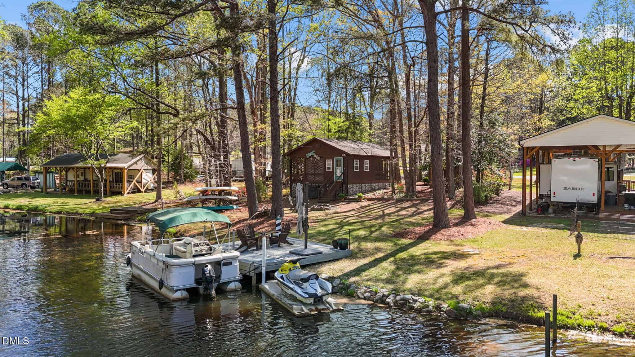Enjoy lakefront living with this beautifully maintained camper with room addition and screened porch. This waterfront wooded property is located in a quiet cove in the private gated community of Lake Royale and comes with ALL the water toys that you will need to enjoy the lake. Pontoon boat with new motor, jet ski on floating dock, and even the kayaks with a kayak rack are all included!! The 1 bedroom/ 1 bath camper comes furnished with everything you need to start living the lake life indoors and out. The camper features a roof over, a screened porch, and a room addition that can be used as a second bedroom or additional living space. Outside you will find a beautifully landscaped property featuring a flag stone patio with picnic table and grill. There is a separate area closer to the water with a stone firepit with chairs and a view down the cove to the main part of the lake. You can store all your extra supplies in the wired shed located on the property. Lake Royale offers resort-style amenities, including a private police force and full-time maintenance department for the common areas. Residents enjoy access to the 345-acre lake for boating and fishing, tennis court, golf course, swimming pool, beaches, playgrounds, basketball, pickle ball, a clubhouse, and more. This is perfect as a weekend getaway. Come see it today!
