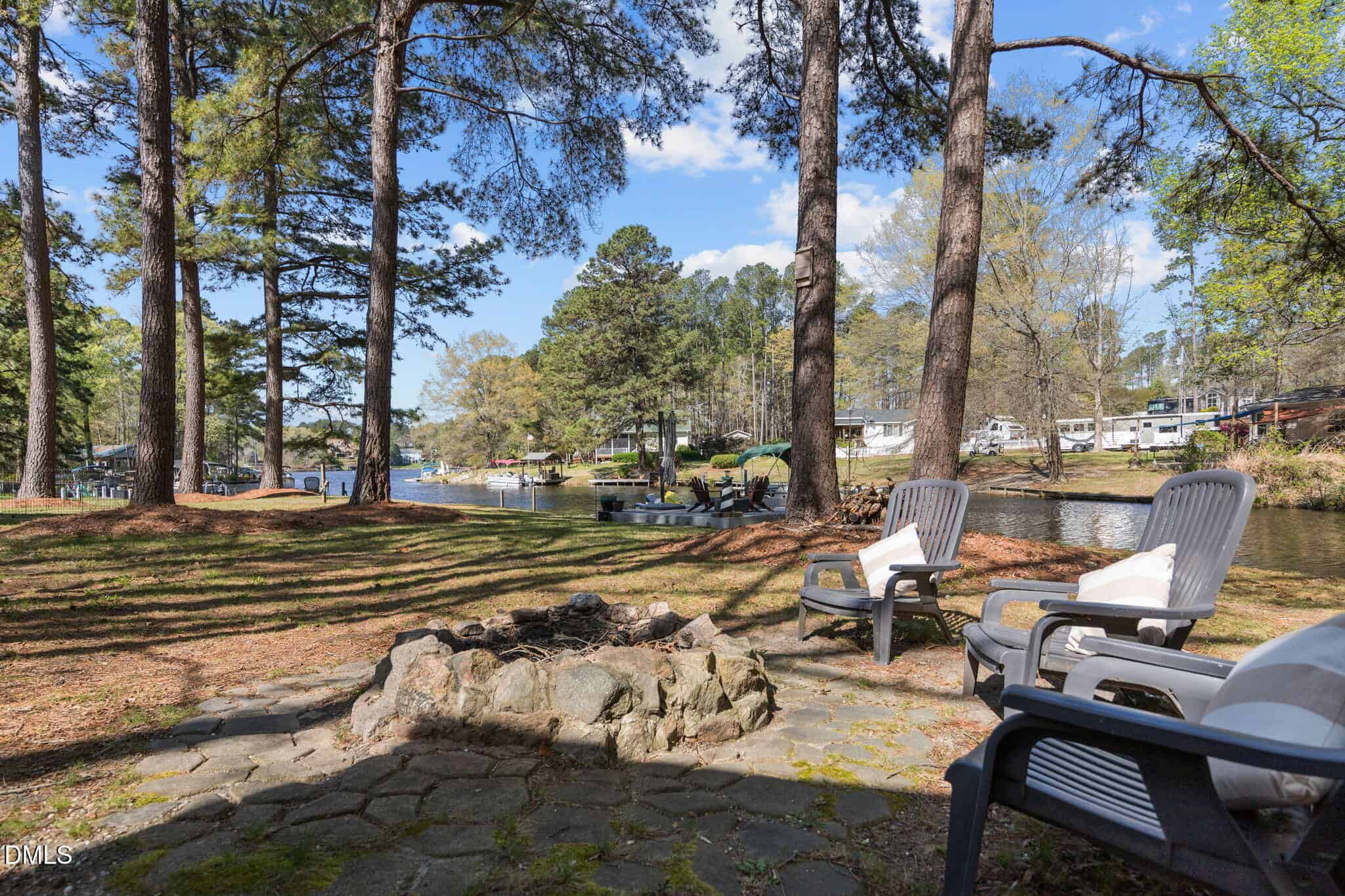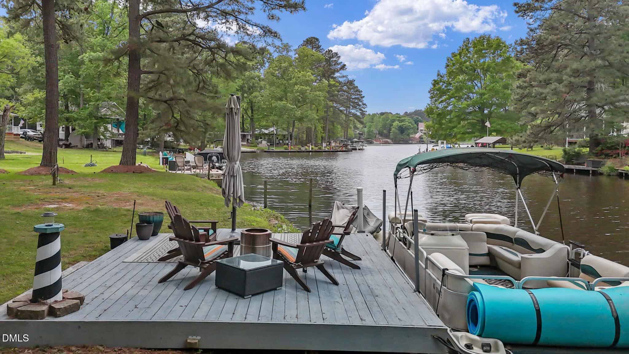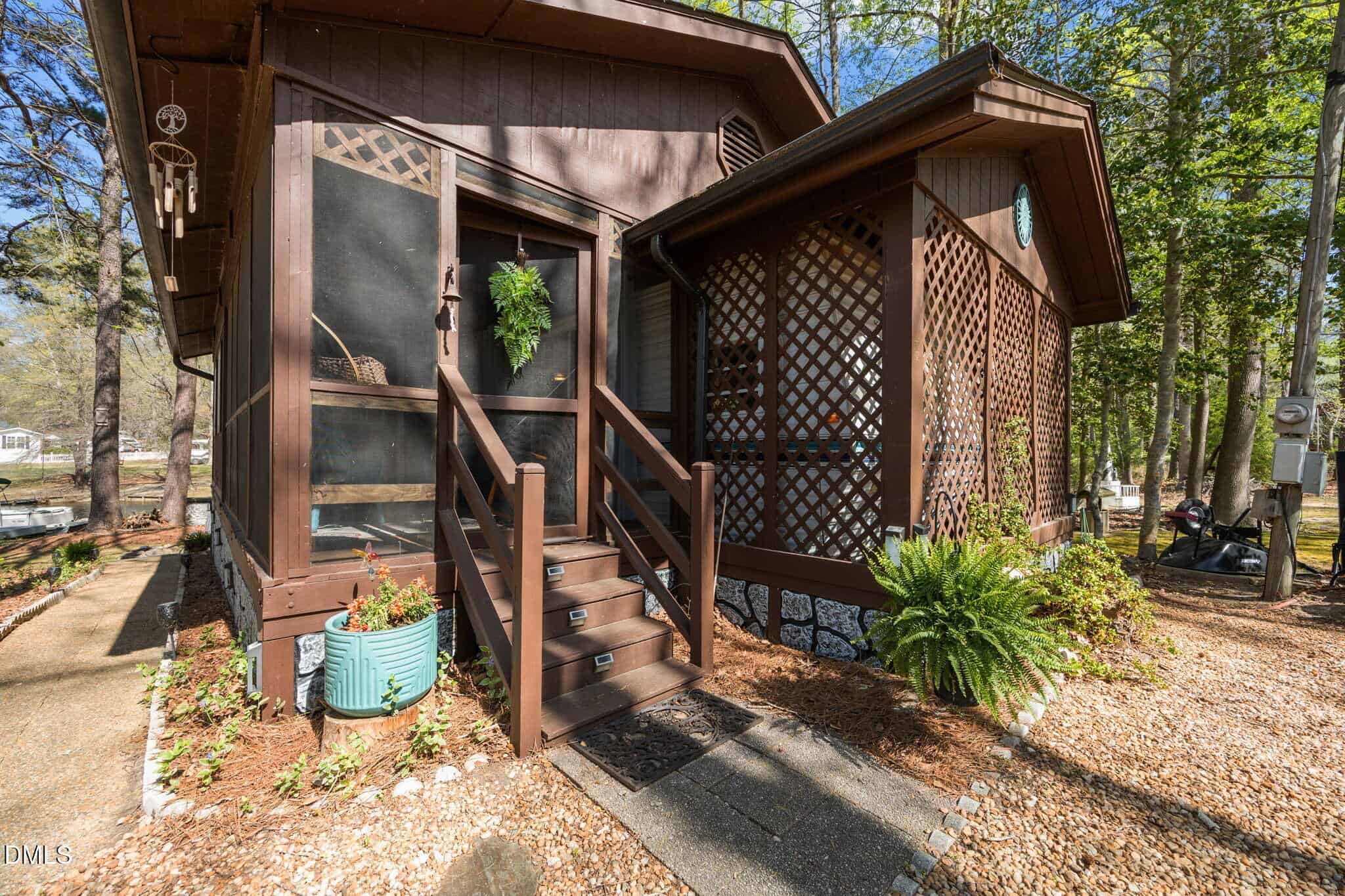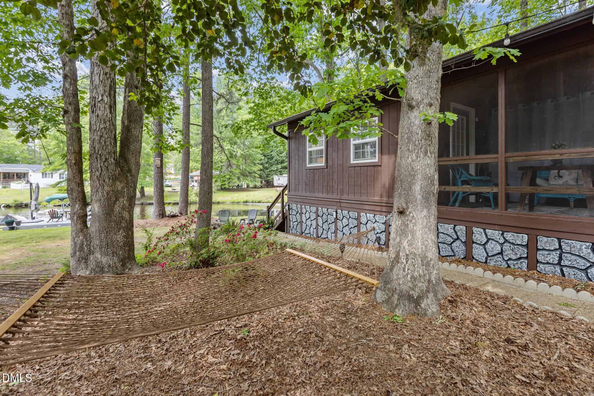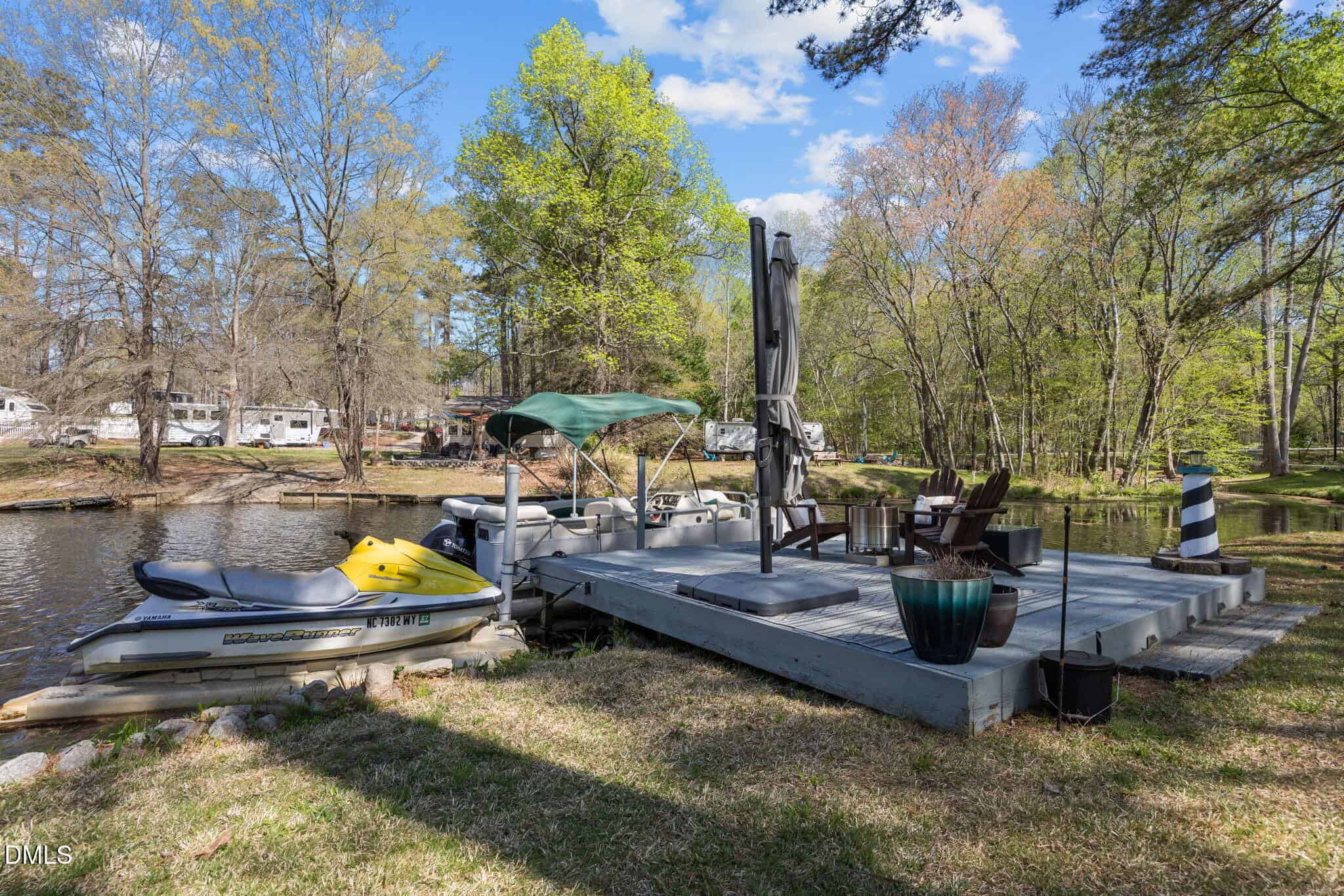 Enjoy lakefront living with this beautifully maintained camper with room addition and screened porch. This waterfront wooded property is located in a quiet cove in the private gated community of Lake Royale and comes with ALL the water toys that you will need to enjoy the lake. Pontoon boat with new motor, jet ski on floating dock, and even the kayaks with a kayak rack are all included!! The 1 bedroom/ 1 bath camper comes furnished with everything you need to start living the lake life indoors and out. The camper features a roof over, a screened porch, and a room addition that can be used as a second bedroom or additional living space. Outside you will find a beautifully landscaped property featuring a flag stone patio with picnic table and grill. There is a separate area closer to the water with a stone firepit with chairs and a view down the cove to the main part of the lake. You can store all your extra supplies in the wired shed located on the property. Lake Royale offers resort-style amenities, including a private police force and full-time maintenance department for the common areas. Residents enjoy access to the 345-acre lake for boating and fishing, tennis court, golf course, swimming pool, beaches, playgrounds, basketball, pickle ball, a clubhouse, and more. This is perfect as a weekend getaway. Come see it today!