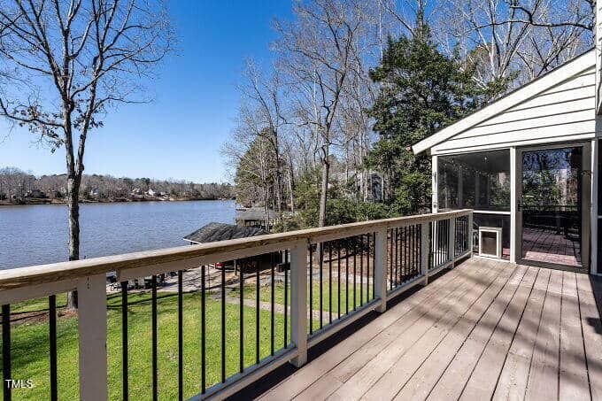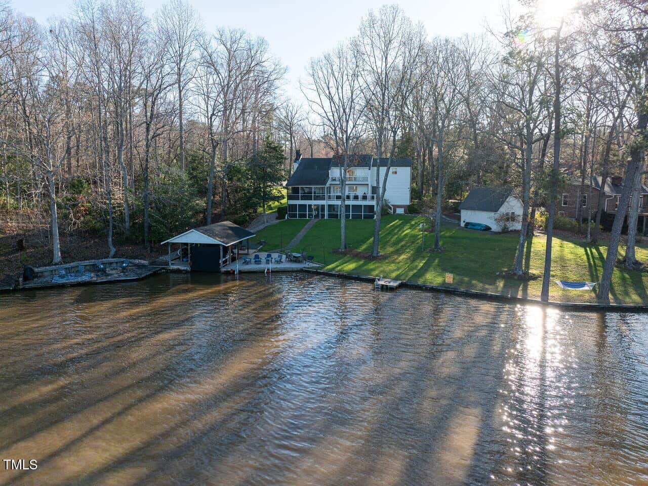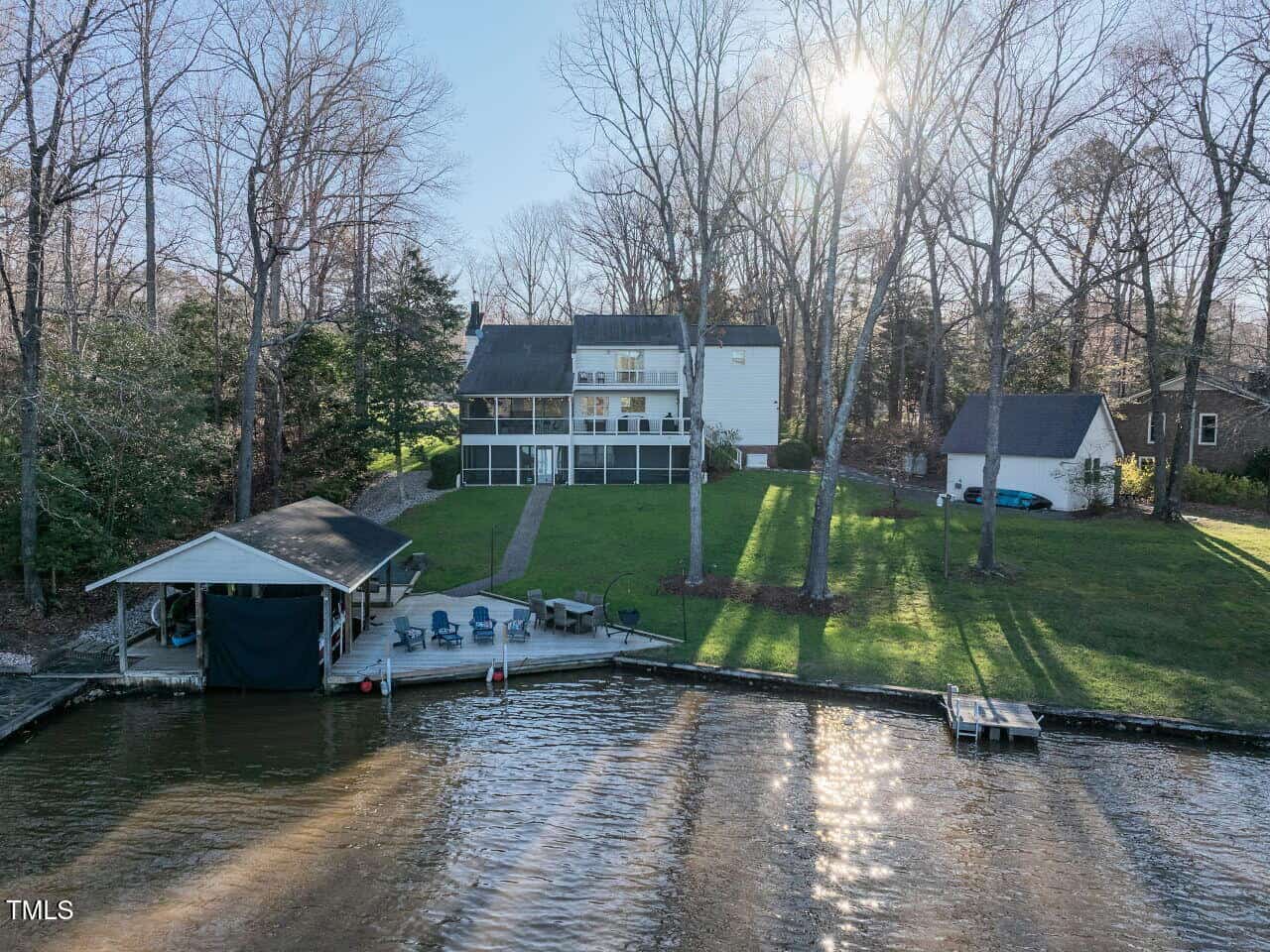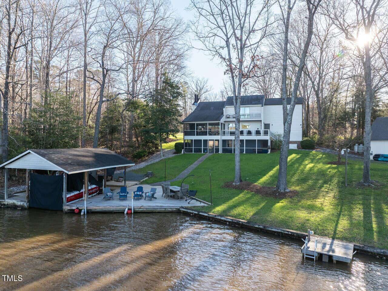 Lake Living at its best with nearly 300 feet of lakefront on a quiet cove featuring a boat house, waterfront deck and Fire pit area. Enjoy breathtaking sunrises and serene evening sunsets over this stunning 1.15-acre lakefront retreat! This picturesque four-bedroom home boasts approximately 2800 sq feet over 3 levels offering the perfect setting for relaxation and recreation. The full-sized dock(built in 2024) with a boat house and lift provides easy access to the lake, while a stone patio with a built-in fire-pit creates the ideal space for cozy lakeside gatherings. Inside, this beautifully renovated home shines with thoughtful upgrades. New Pella windows (installed in 2024) invite in natural light, and the fully remodeled kitchen (completed in 2022) features gourmet appliances and custom cabinetry, making it a chef’s dream. This 4 bedroom 3 bath home has a spacious great room, with soaring ceilings and one of the home’s two fireplaces, which flows seamlessly into the kitchen and opens to a screened porch overlooking the lake. The main level also includes two bedrooms and a full bath. The master suite occupies the second floor and offers a private retreat and fantastic views of the lake from the private balcony. The primary bedroom features a vaulted ceiling with a beautiful accent wall. The spa-like primary bath also provides a stunning lake view. The daylight walkout lower level features another bedroom with a full bath, a kitchenette, and a family room with a fireplace that opens to a screened porch with fantastic lake views. There is also a flex room that can serve as a dining area/office. The property is level and features a lovely stone walkway which leads to the lake. A large shed provides plenty of storage for your lake toys and fishing gear. The property also features an invisible fence that encompasses an area of the lake so your pets can swim safely. With 2 large i screen porches, large deck and balcony, there are plenty of options to enjoy the views from this beautiful home. There is also a whole house generator. HOA dues includes Two Free memberships to The River 18-hole professional Golf Course for the homeowners.