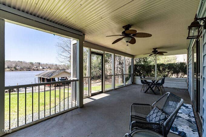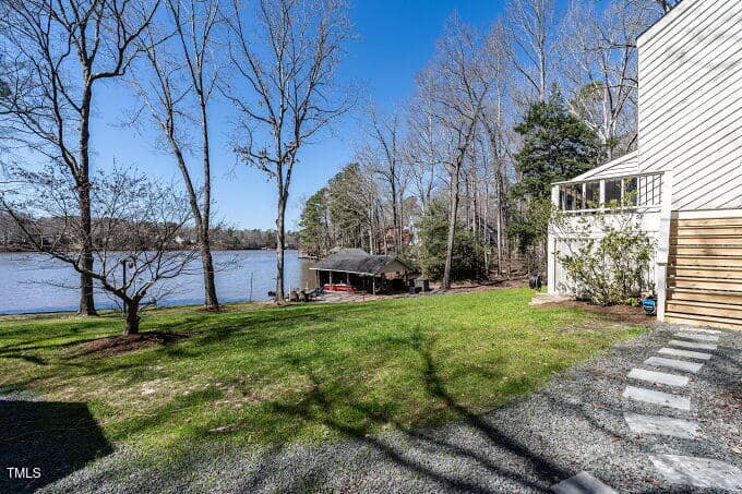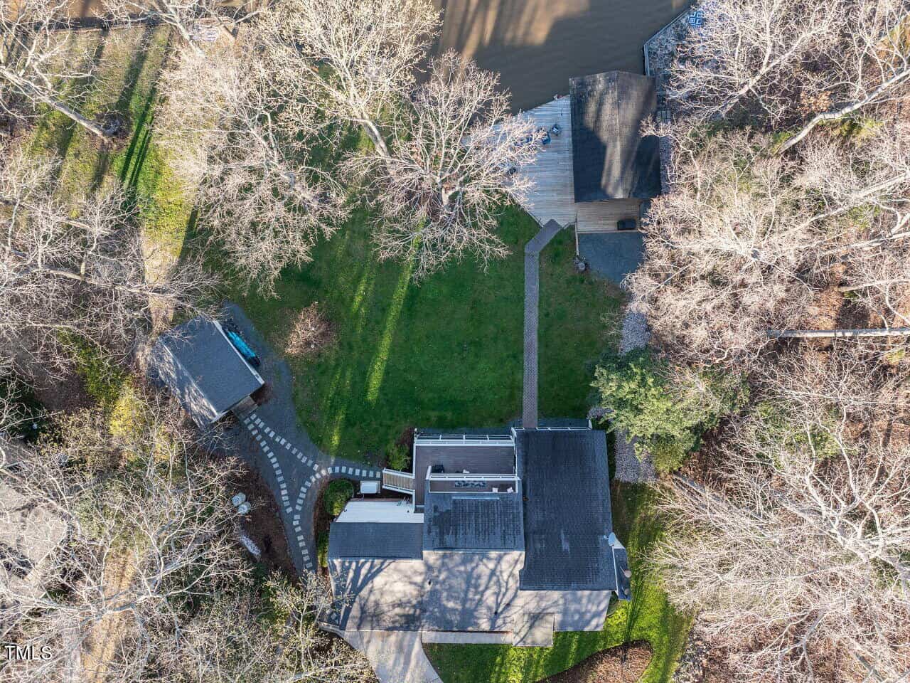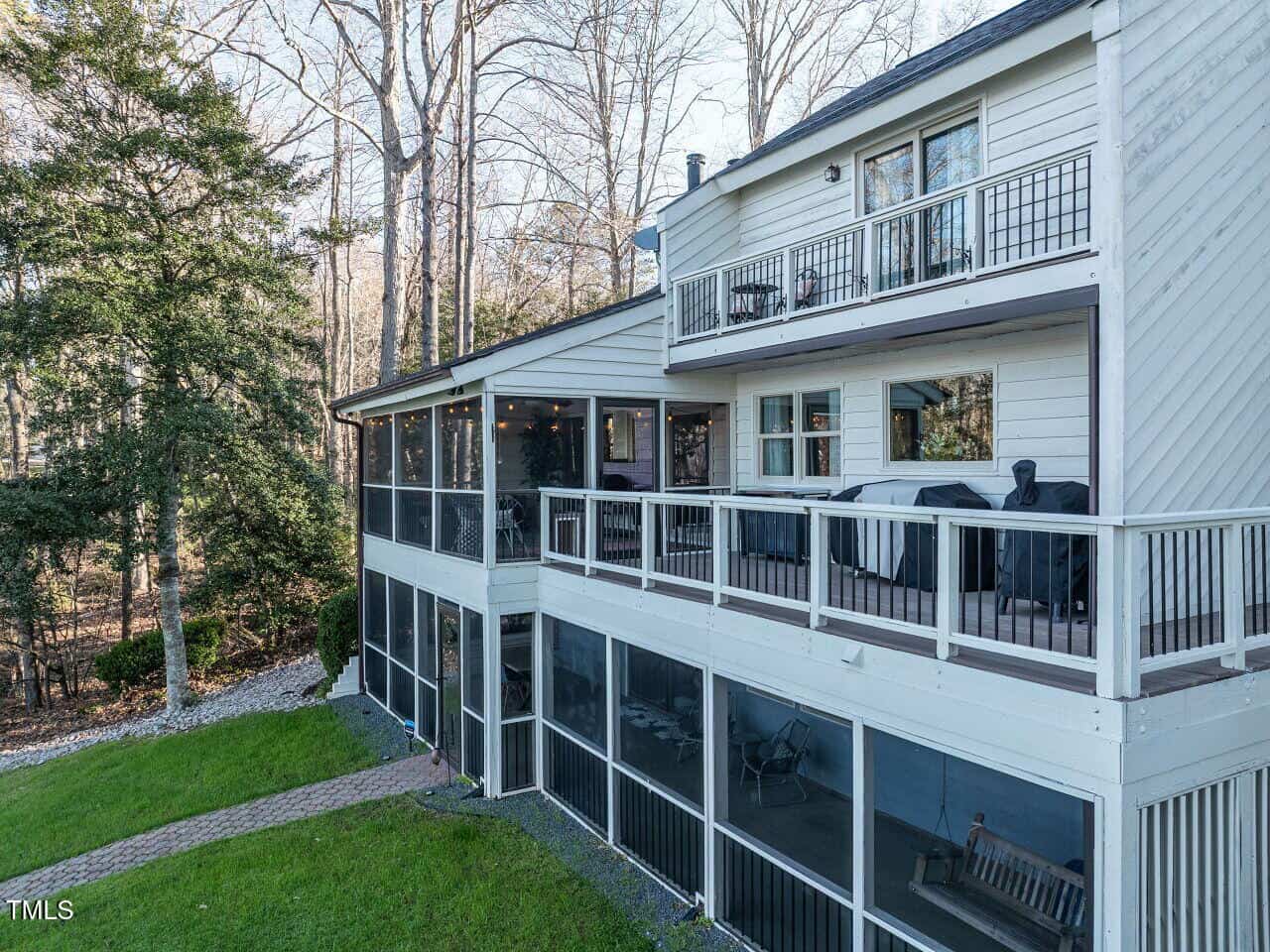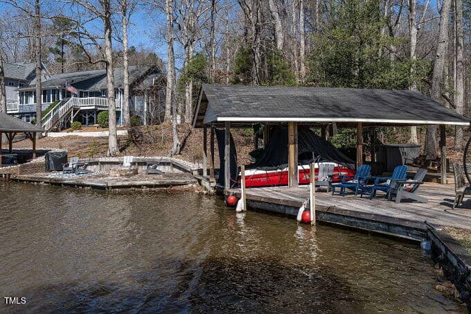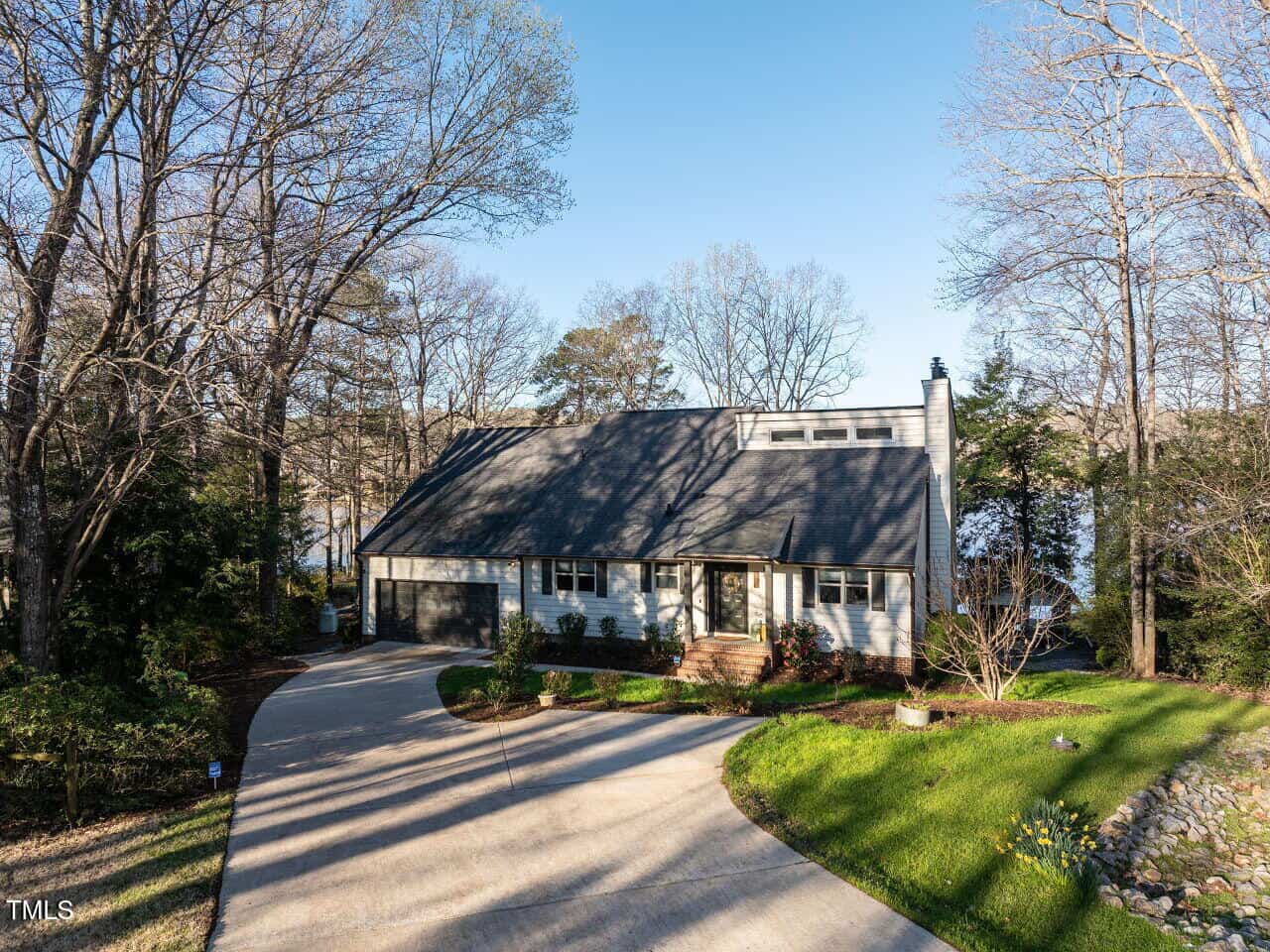 Lake Living at its best with nearly 300 feet of lakefront on a quiet cove featuring a boat house, waterfront deck and Fire pit area. Enjoy breathtaking sunrises and serene evening sunsets over this stunning 1.15-acre lakefront retreat! This picturesque four-bedroom home boasts approximately 2800 sq feet over 3 levels offering the perfect setting for relaxation and recreation. The full-sized dock(built in 2024) with a boat house and lift provides easy access to the lake, while a stone patio with a built-in fire-pit creates the ideal space for cozy lakeside gatherings. Inside, this beautifully renovated home shines with thoughtful upgrades. New Pella windows (installed in 2024) invite in natural light, and the fully remodeled kitchen (completed in 2022) features gourmet appliances and custom cabinetry, making it a chef’s dream. This 4 bedroom 3 bath home has a spacious great room, with soaring ceilings and one of the home’s two fireplaces, which flows seamlessly into the kitchen and opens to a screened porch overlooking the lake. The main level also includes two bedrooms and a full bath. The master suite occupies the second floor and offers a private retreat and fantastic views of the lake from the private balcony. The primary bedroom features a vaulted ceiling with a beautiful accent wall. The spa-like primary bath also provides a stunning lake view. The daylight walkout lower level features another bedroom with a full bath, a kitchenette, and a family room with a fireplace that opens to a screened porch with fantastic lake views. There is also a flex room that can serve as a dining area/office. The property is level and features a lovely stone walkway which leads to the lake. A large shed provides plenty of storage for your lake toys and fishing gear. The property also features an invisible fence that encompasses an area of the lake so your pets can swim safely. With 2 large i screen porches, large deck and balcony, there are plenty of options to enjoy the views from this beautiful home. There is also a whole house generator. HOA dues includes Two Free memberships to The River 18-hole professional Golf Course for the homeowners.