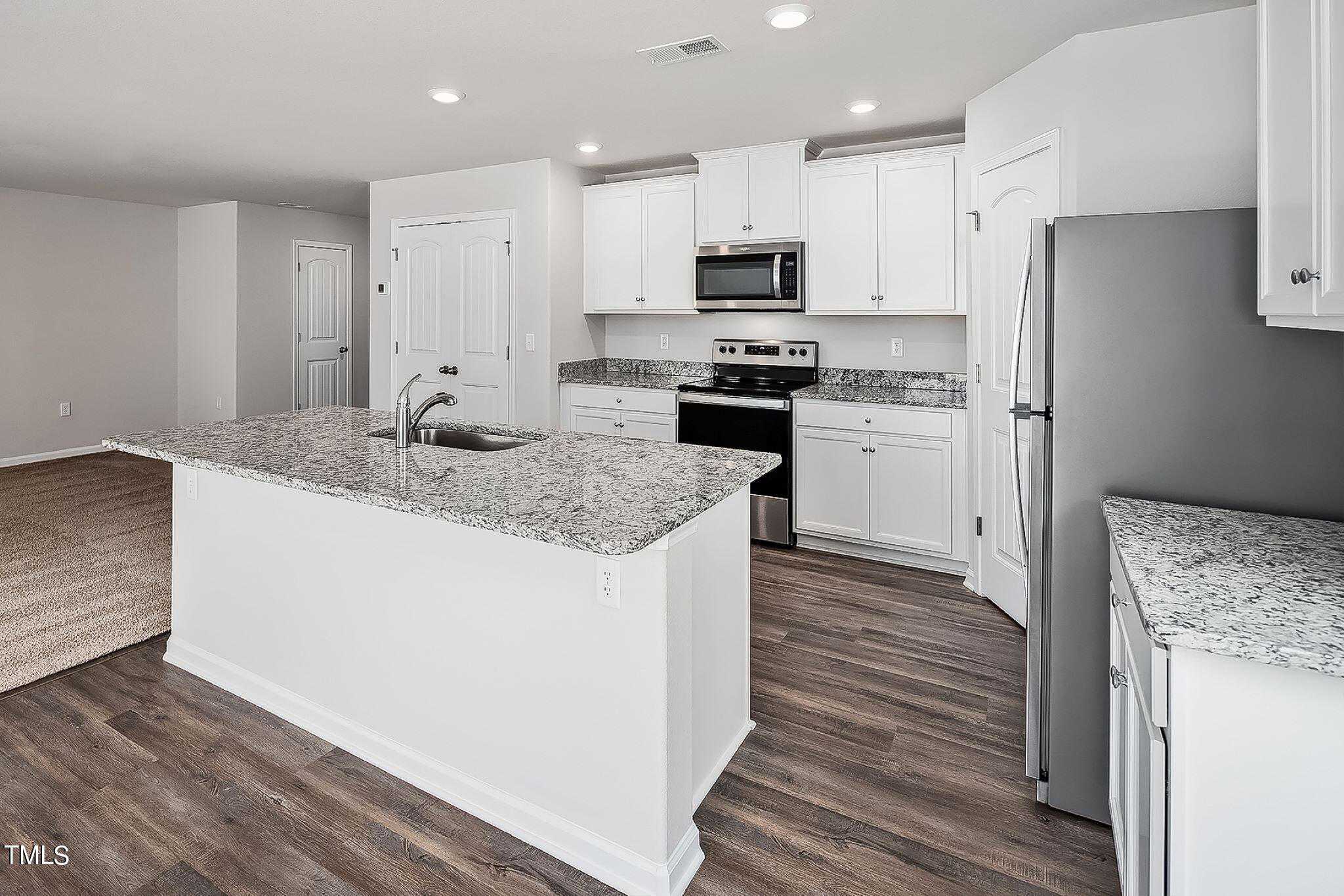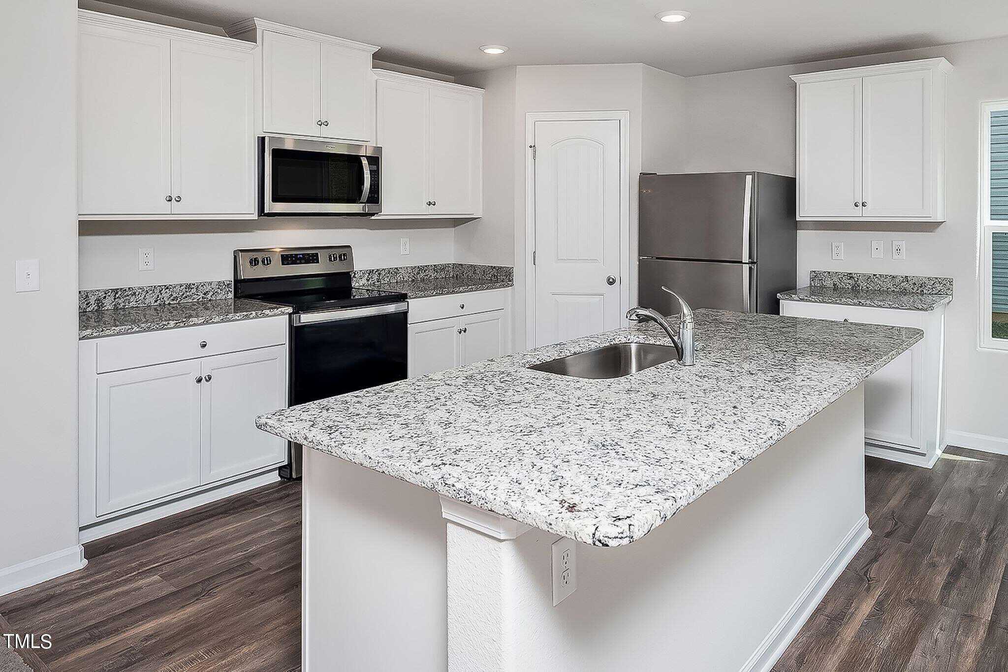This 4-bed home Located on a beautiful corner lot has a spacious and airy feel that has been designed with your needs in mind. The large kitchen is open to the dining area and living room and has stainless steel appliances, gorgeous granite countertops, 36” upper cabinets with brushed nickel hardware and a large island.