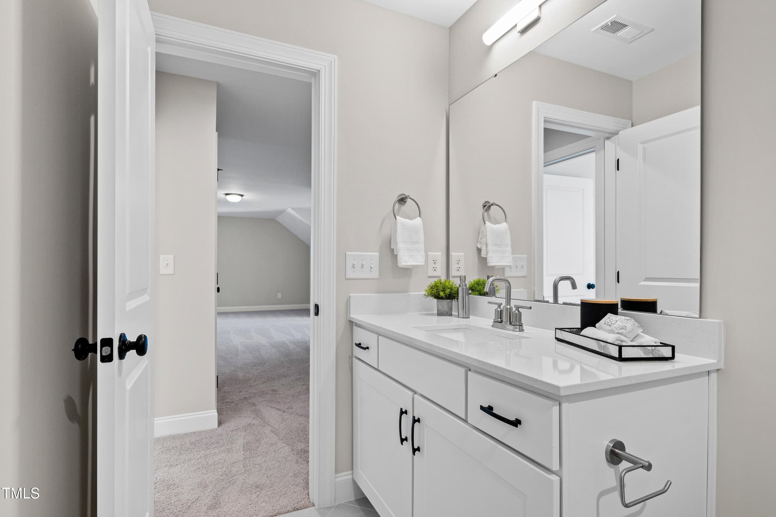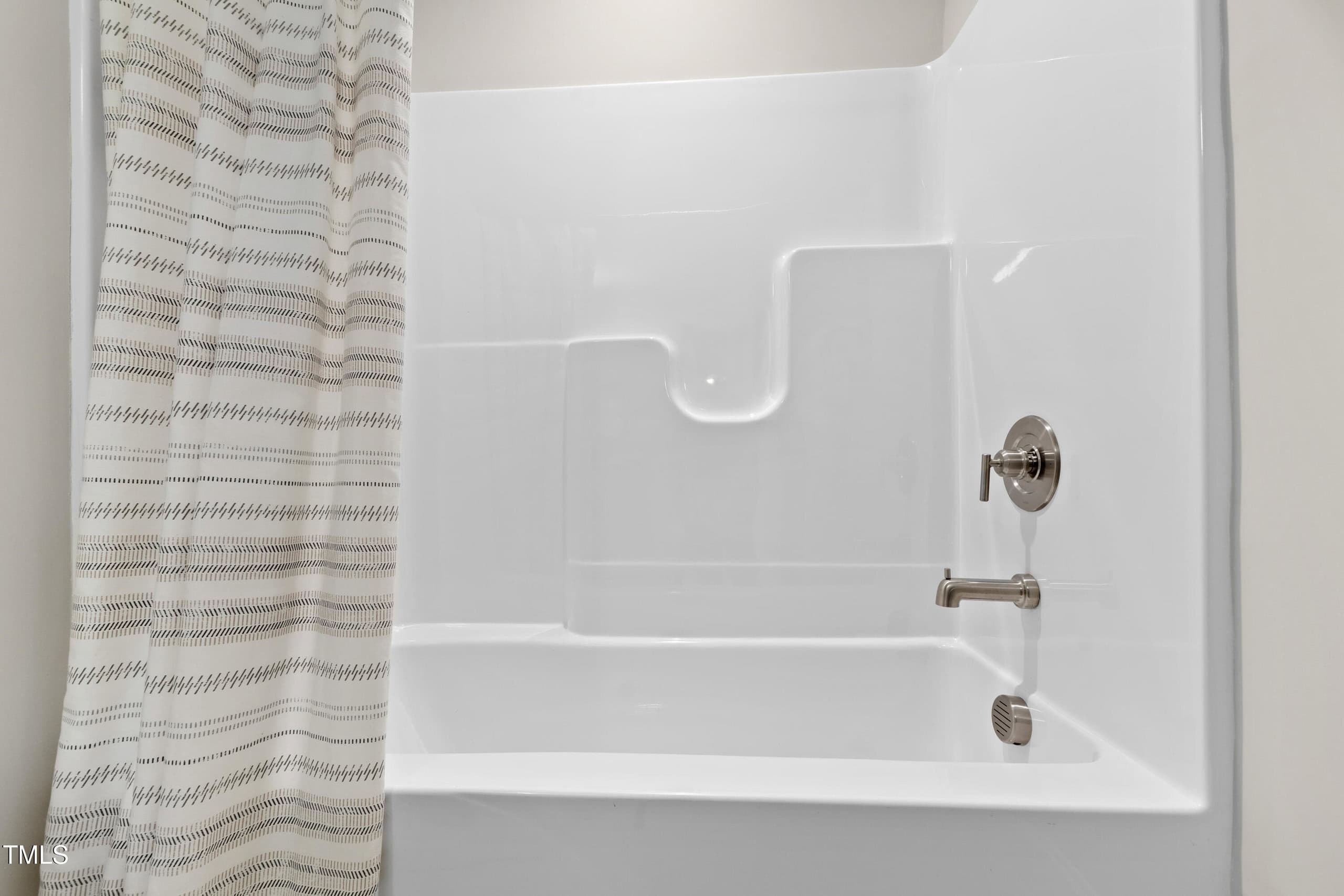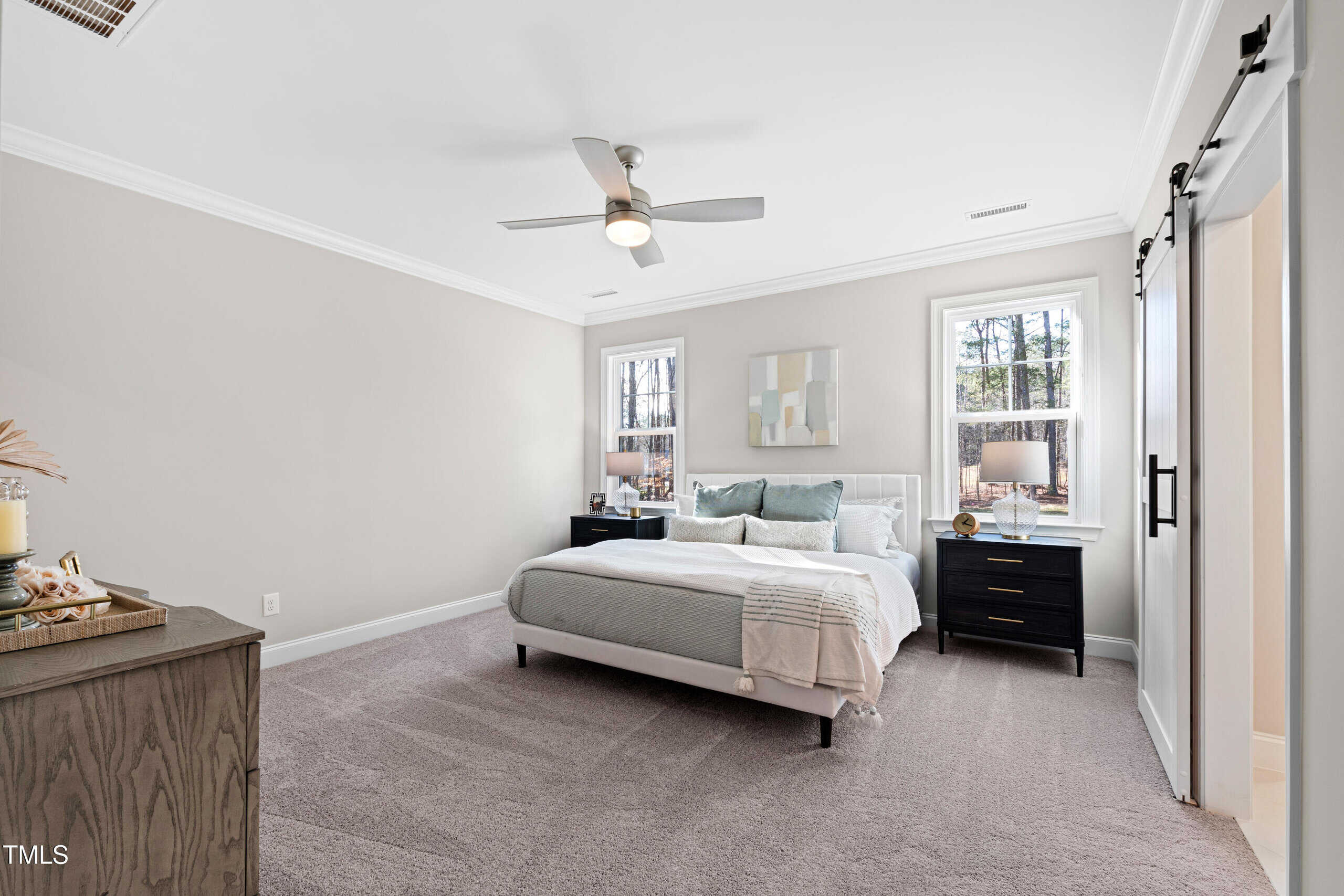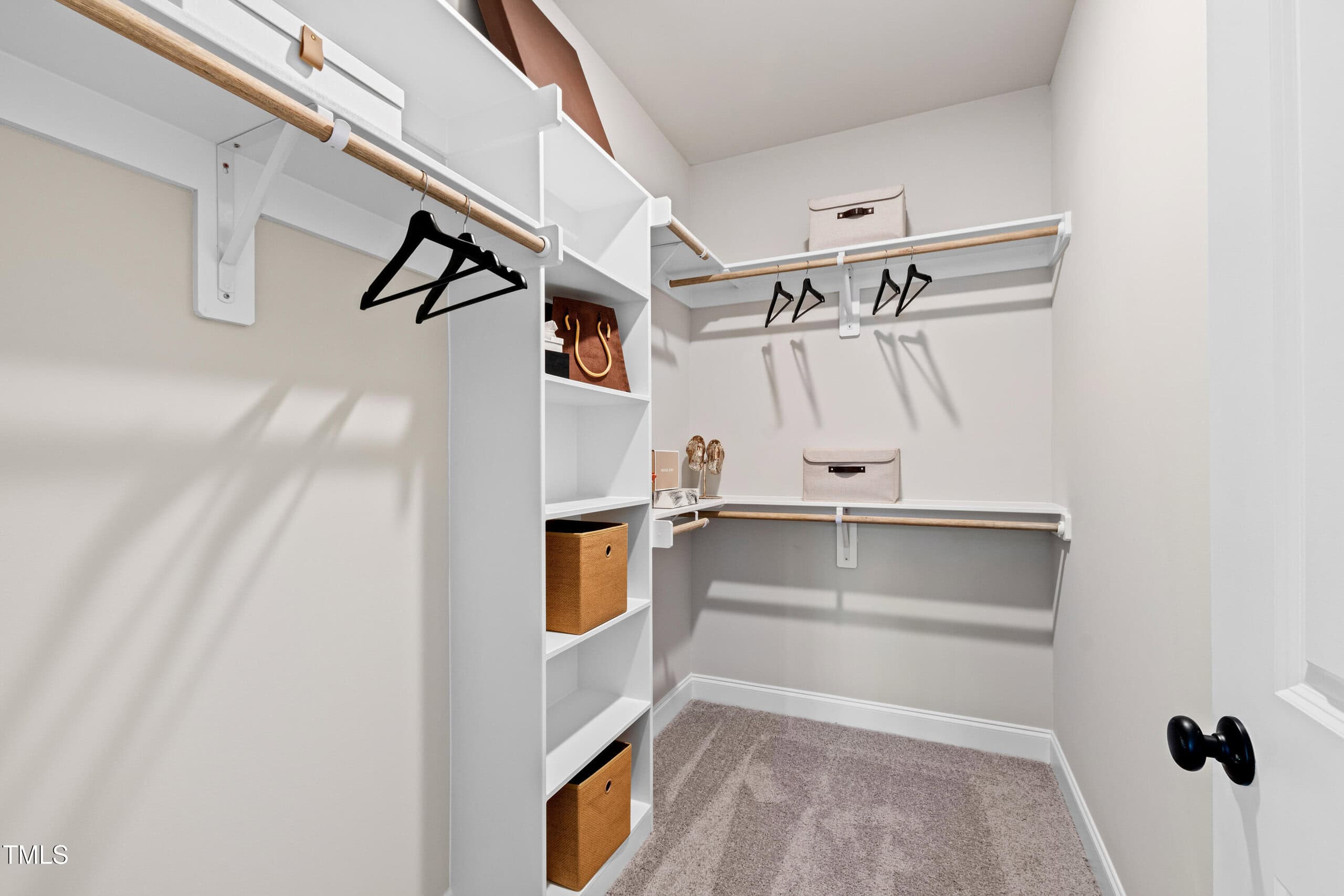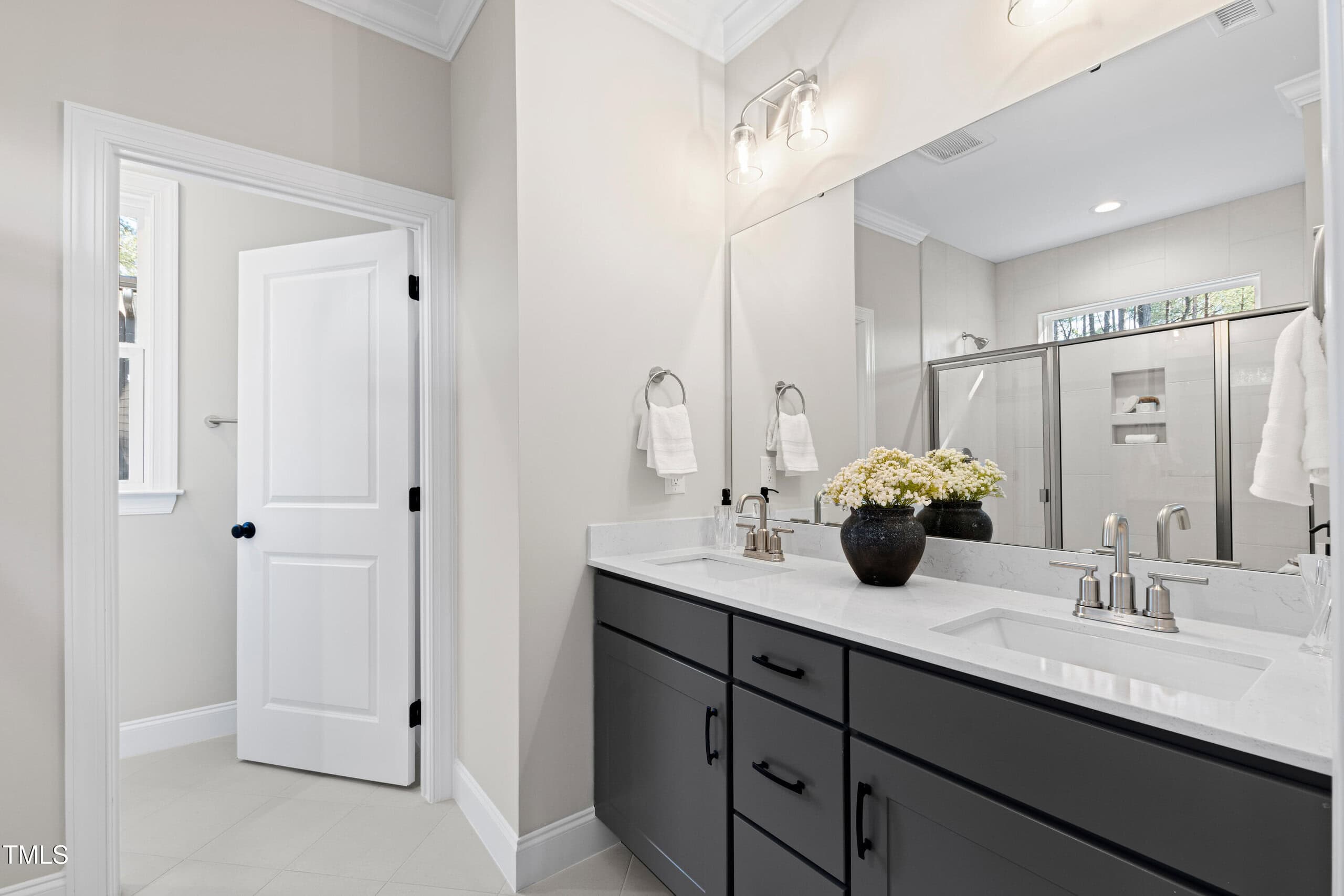 The main level primary suite is a true retreat, offering a ceiling fan with remote, crown molding, and a spacious walk-in closet. The primary bath features a 13×13 ‘Glacier White’ diagonal lay tile floor, a dual vanity with ‘Niagra’ quartz countertops, and a 12×24 ‘Glacier’ vertical lay tile surround walk-in shower with a niche.