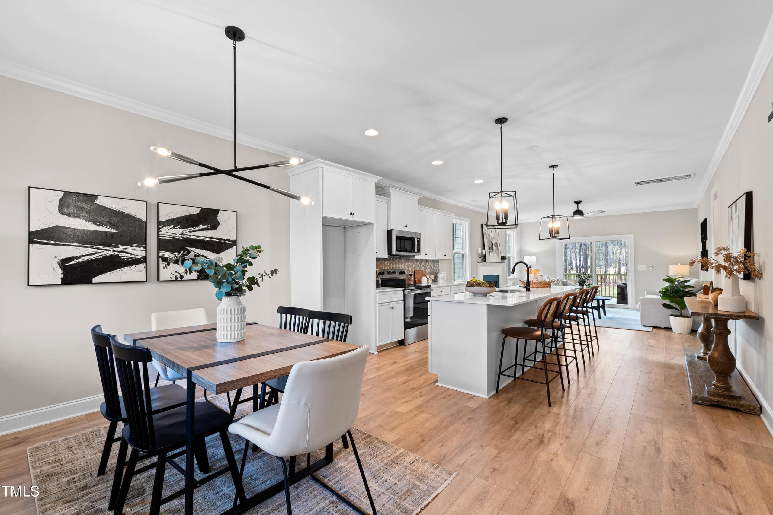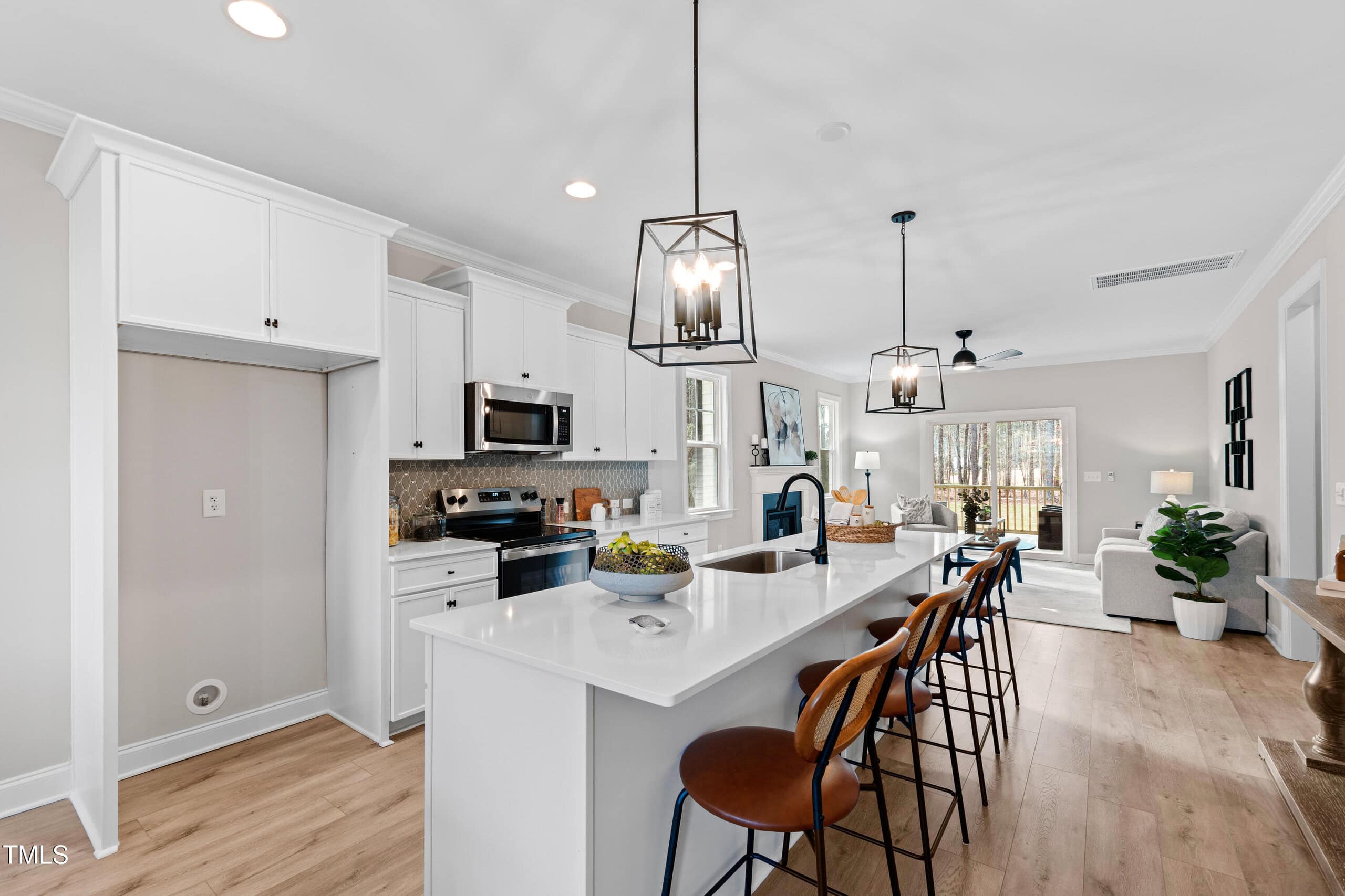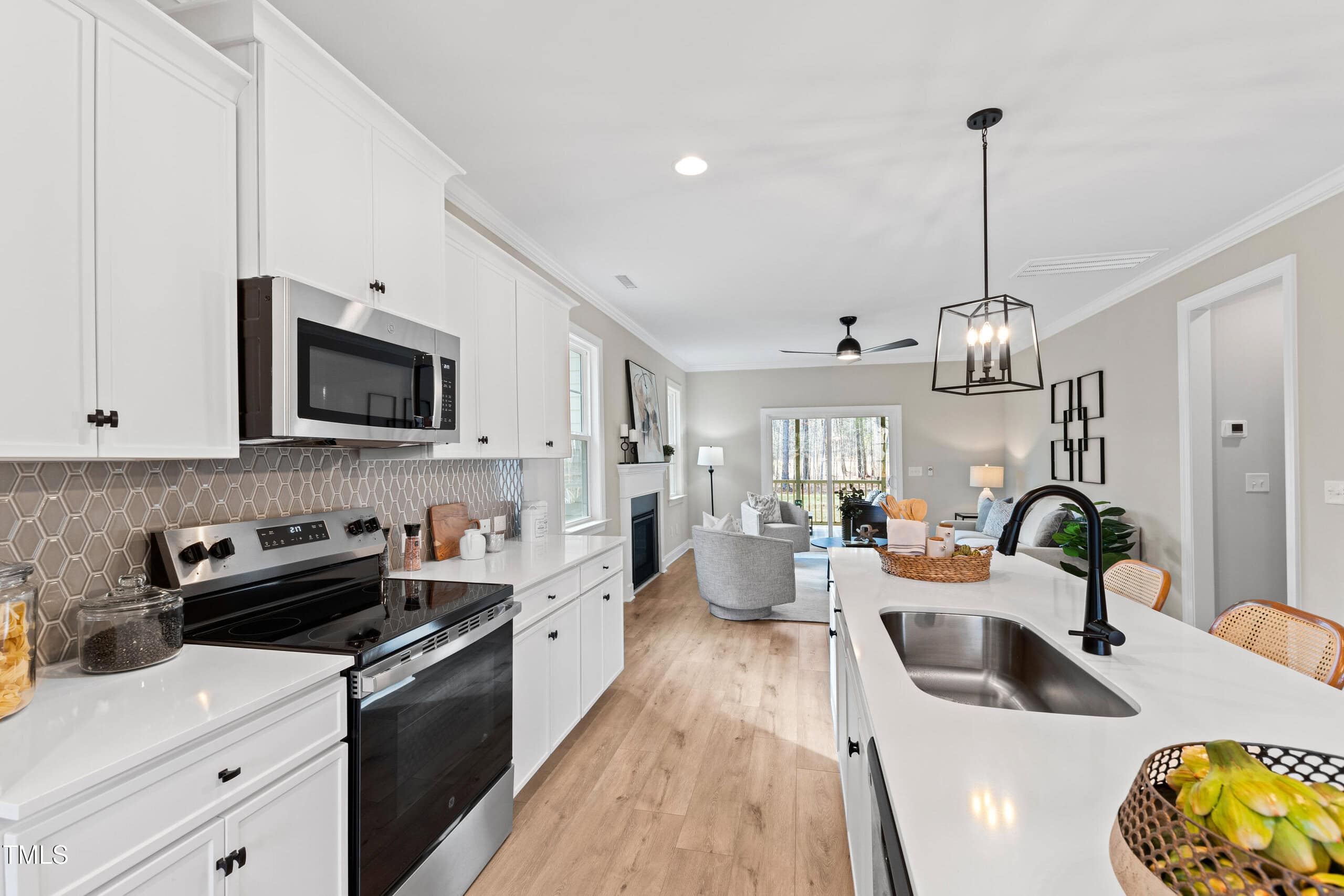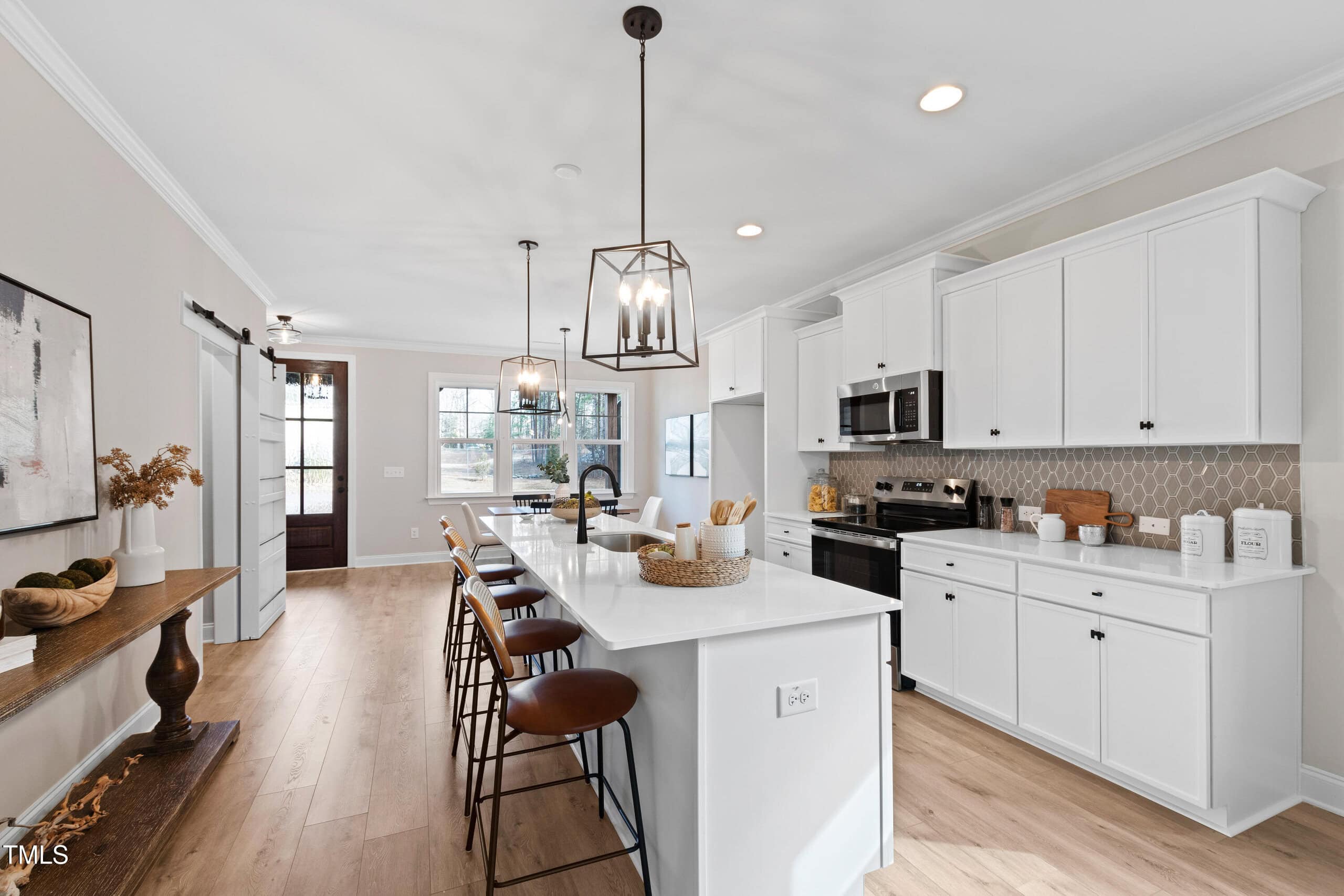The kitchen is a chef’s delight, featuring custom ‘White Satin’ painted cabinets with cove crown molding, ‘Miami White’ granite countertops, and a 2×4 ‘Dove’ hexagon vertical tile backsplash. It also includes a double trash cabinet, single bowl stainless steel sink with a pull-out faucet, recessed lighting, a barn-door walk-in pantry, and stainless steel appliances.
