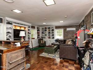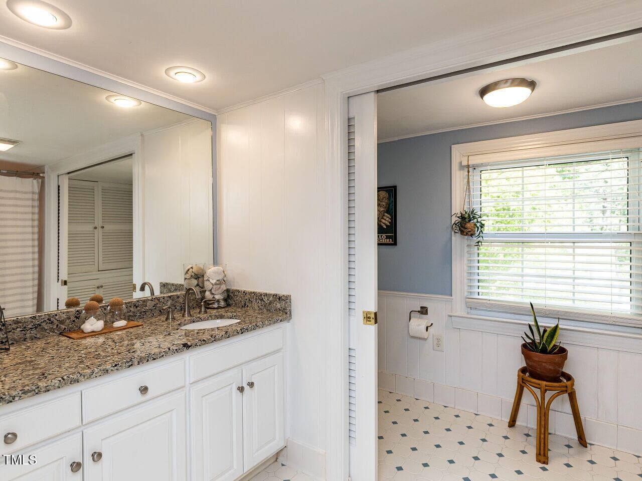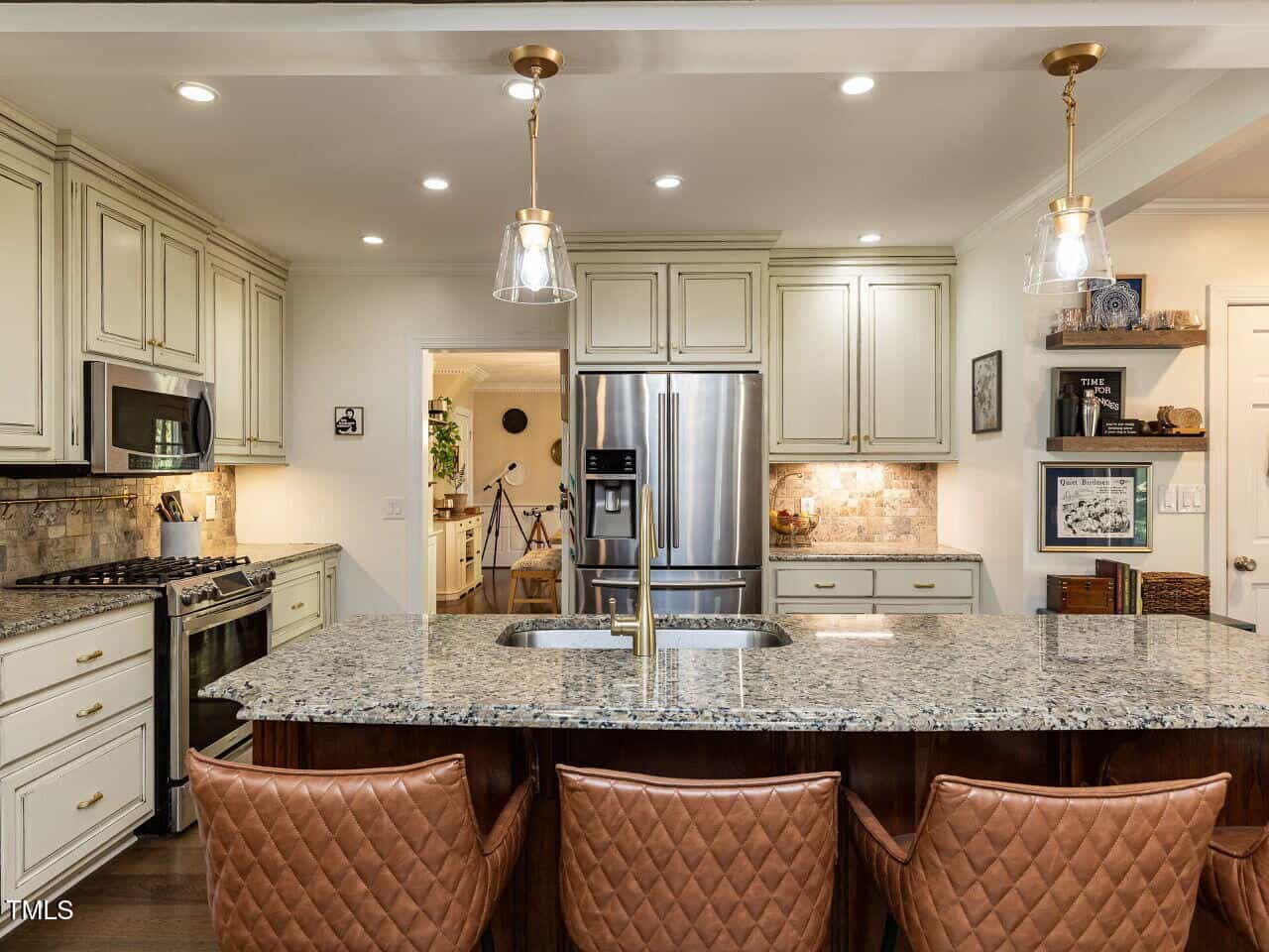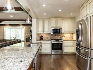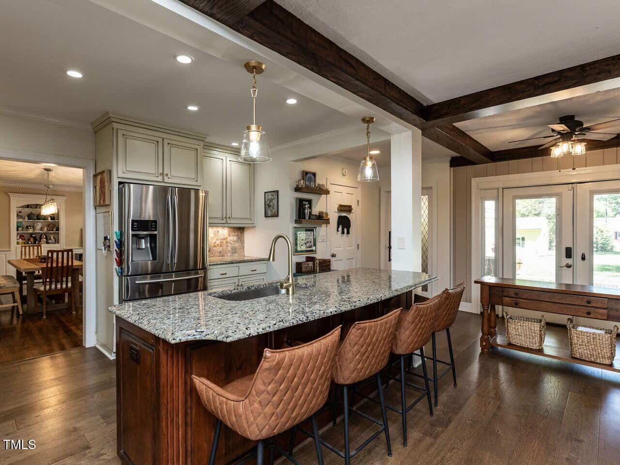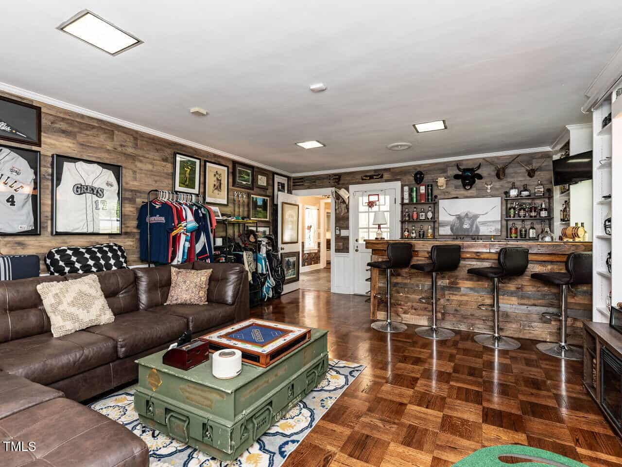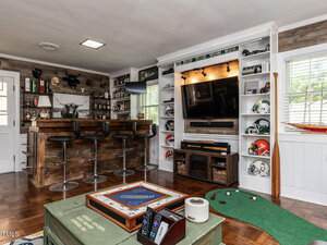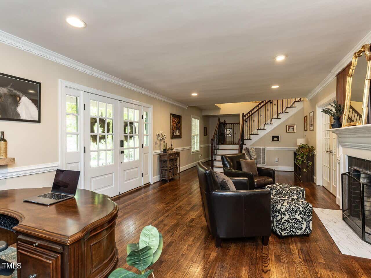 The main-level primary suite features new flooring, fresh paint, a remodeled bathroom, and generous closet space. The kitchen offers granite countertops, stainless steel appliances, updated hardware, and a refreshed walk-in pantry. A bonus room with original parquet flooring and a custom bar provides the perfect space for entertaining, while the office includes expanded built-in storage.