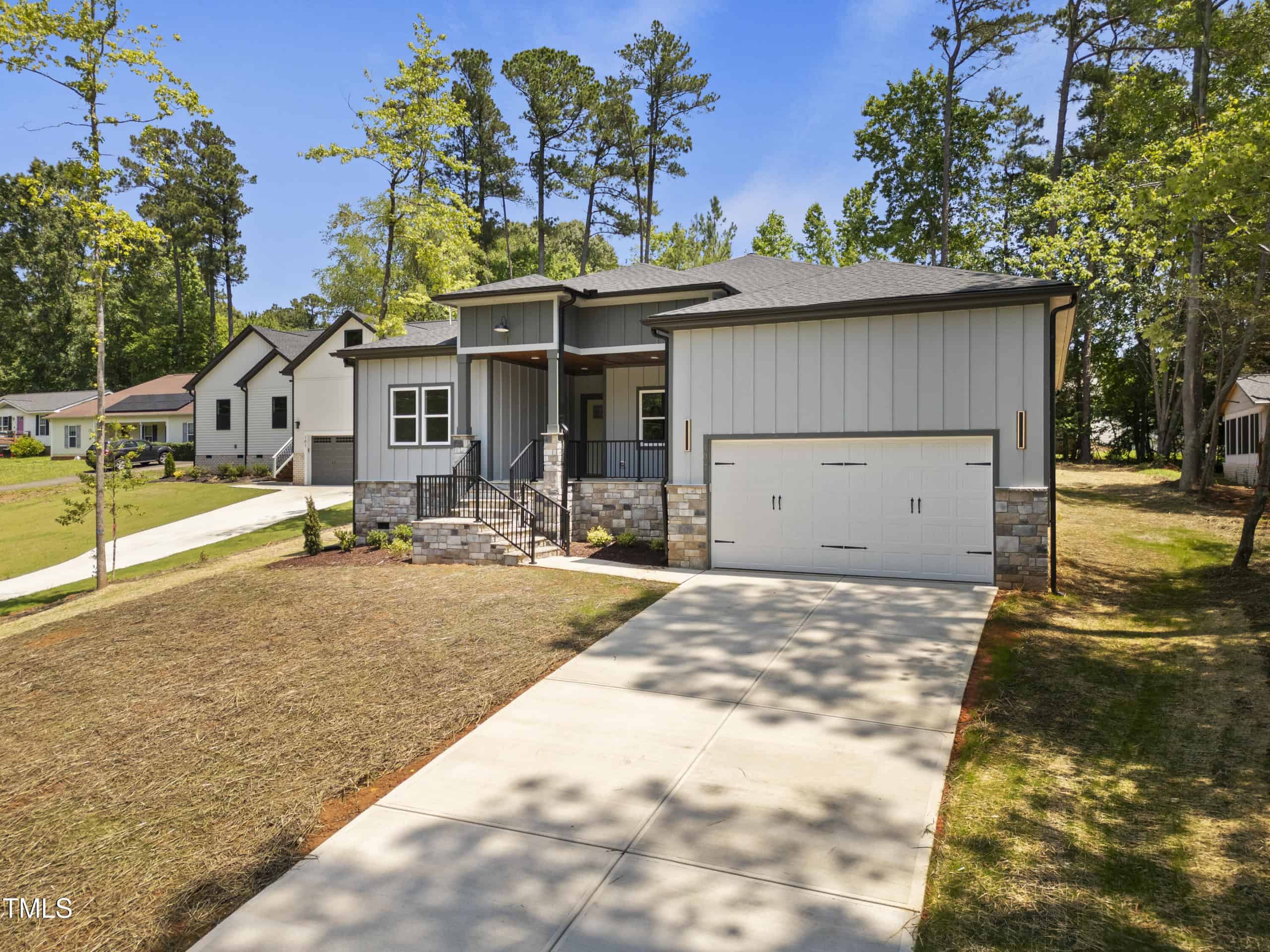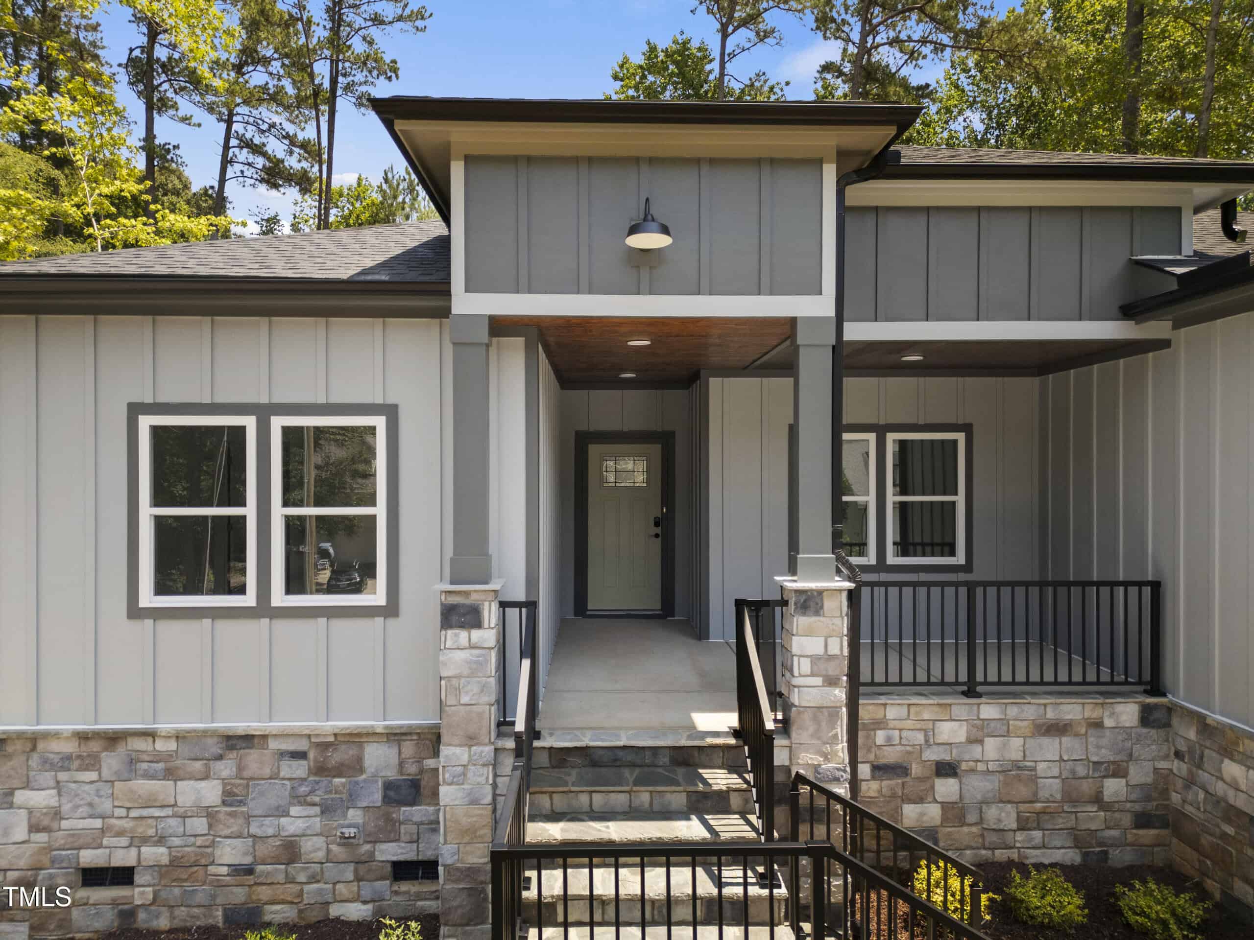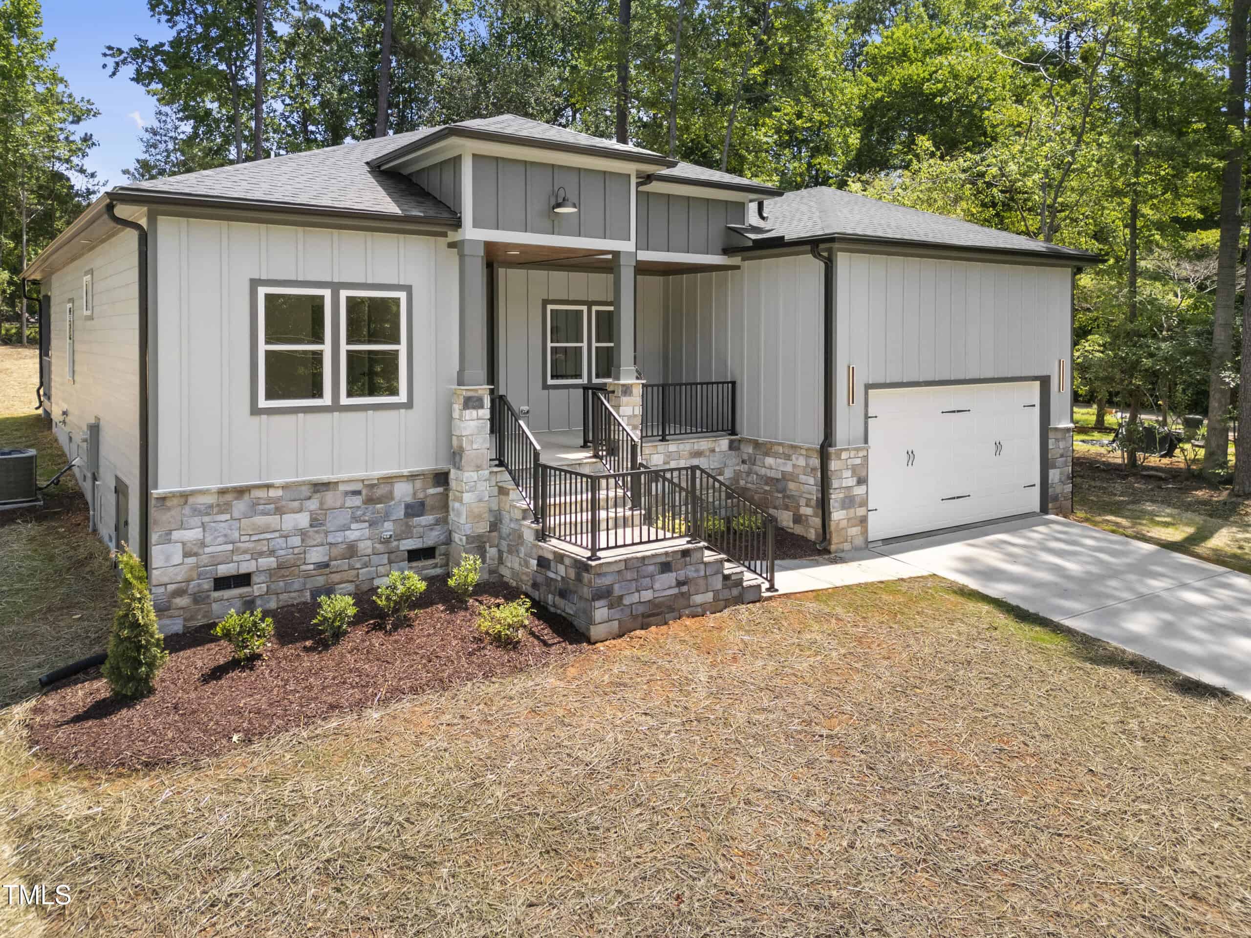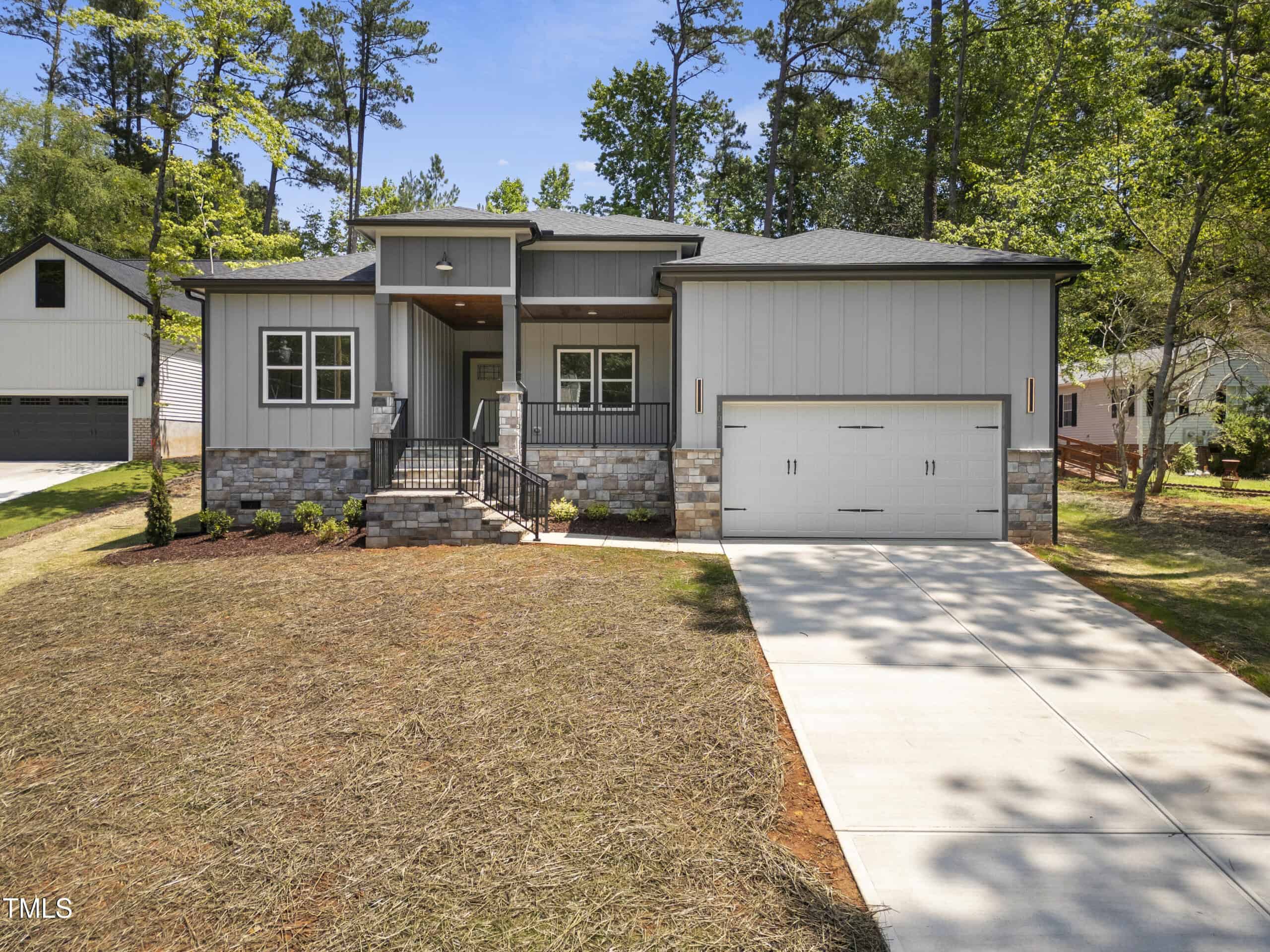 Beautifully built home that blends quality construction with everyday functionality, ideally located near the entrance of the Lake Royale gated community. With an amazing backyard, this property checks the boxes. Entering from an amazing and magnificent front porch, the interior showcases an open layout, rich natural light, and premium finishes throughout. The kitchen is both stylish and practical, featuring a center island, sleek range hood, and a generous walk-in pantryโperfect for everyday meals or entertaining. The owner’s suite is designed for relaxation, with four windows, a large shower, and an expansive walk-in closet. Each additional bedroom, no carpet!, includes its own walk-in closet, ensuring plenty of storage space. An enclosed home office offers versatility for remote work or guest use, while the additional half bath adds extra convenience for visitors. The oversized back porch invites you to enjoy the outdoors in comfort, and the charming front porch adds a warm step in. Plus epoxied garage floor Built with fiber cement and stone siding, and using wood milled on site, this home reflects attention to detail and lasting quality. The peaceful backyard provides a relaxing space to unwind or host gatherings. Enjoy exclusive access to Lake Royale’s many amenities, including boating, swimming, fishing, parks, and community eventsโall within a vibrant lakeside neighborhood.