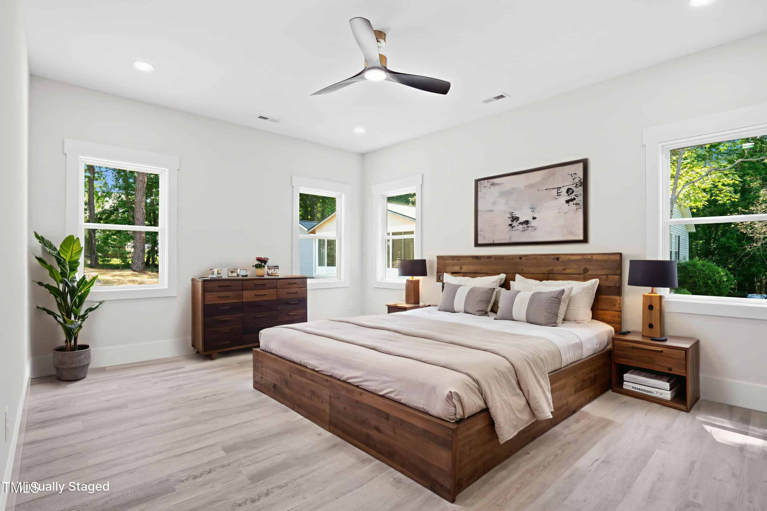 Entering from an amazing and magnificent front porch, the interior showcases an open layout, rich natural light, and premium finishes throughout. The kitchen is both stylish and practical, featuring a center island, sleek range hood, and a generous walk-in pantryโperfect for everyday meals or entertaining. The owner’s suite is designed for relaxation, with four windows, a large shower, and an expansive walk-in closet. Each additional bedroom, no carpet!, includes its own walk-in closet, ensuring plenty of storage space.