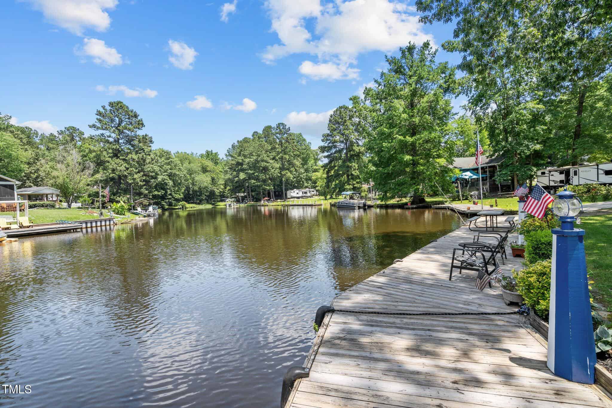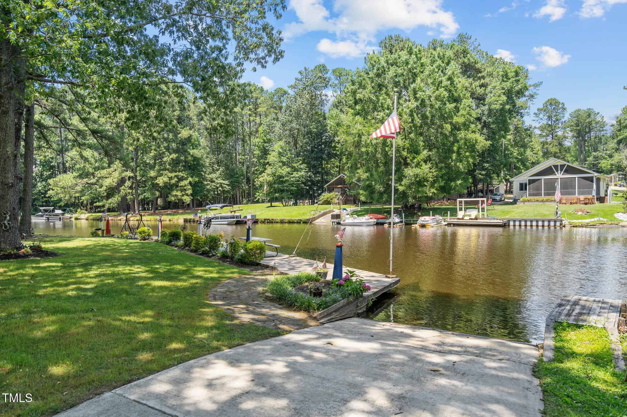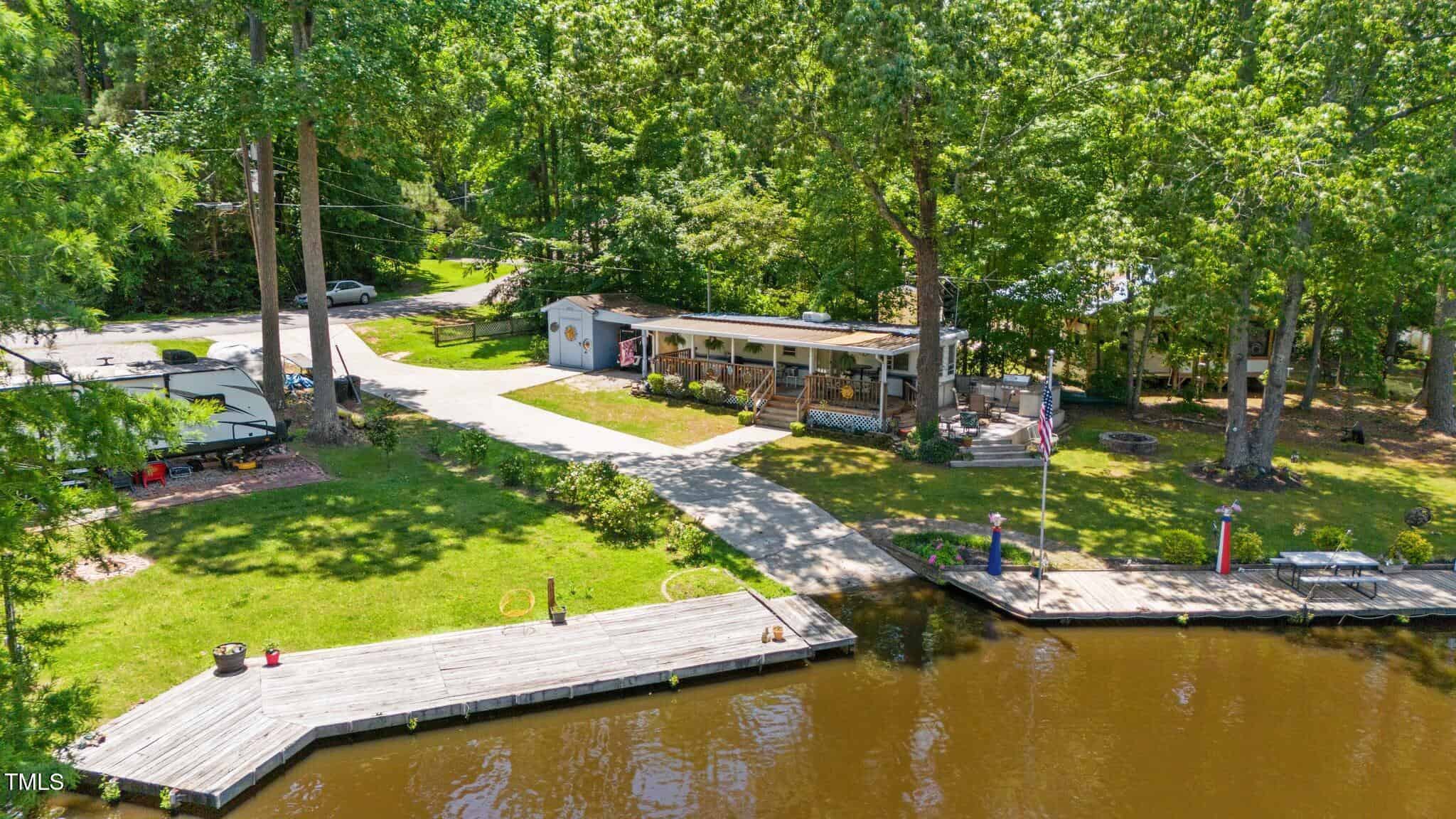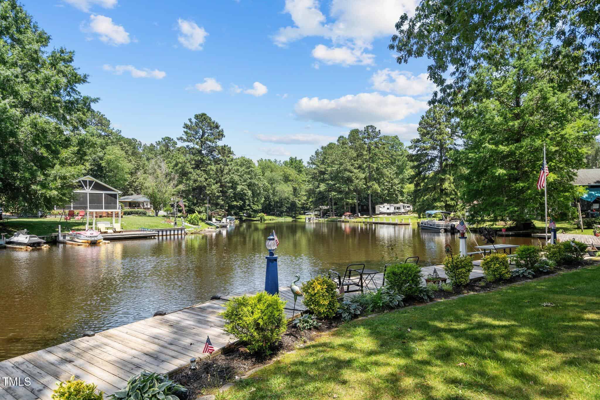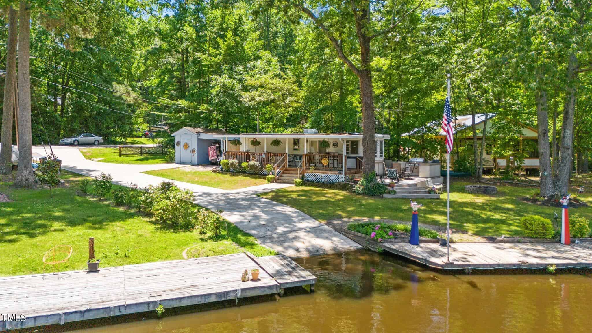 The Ultimate Waterfront Getaway awaits you at in a gated lake community, just 45 minutes from Raleigh! This amazing property is nestled on a no-wake cove with a HUGE waterfront walkway/dock, complete with tie-offs for boat. Drop your jet ski in from your own private concrete driveway! Property is big enough for a custom-built Cottage! This retreat offers TWO BEDROOMS and it’s ready for your personal touches. There’s an expansive covered porch and an outdoor built- in Grilling Station! Lake Royale Amenities Include: A Private Police Force, 3.25Mile Long Lake, 18 Hole Professionally Designed Golf Course, Beaches, Marinas, Pool, Tennis, Volleyball and Basketball, Pickleball and Lots of fun Activities. Two golf memberships to The River Gold Club included per residence!