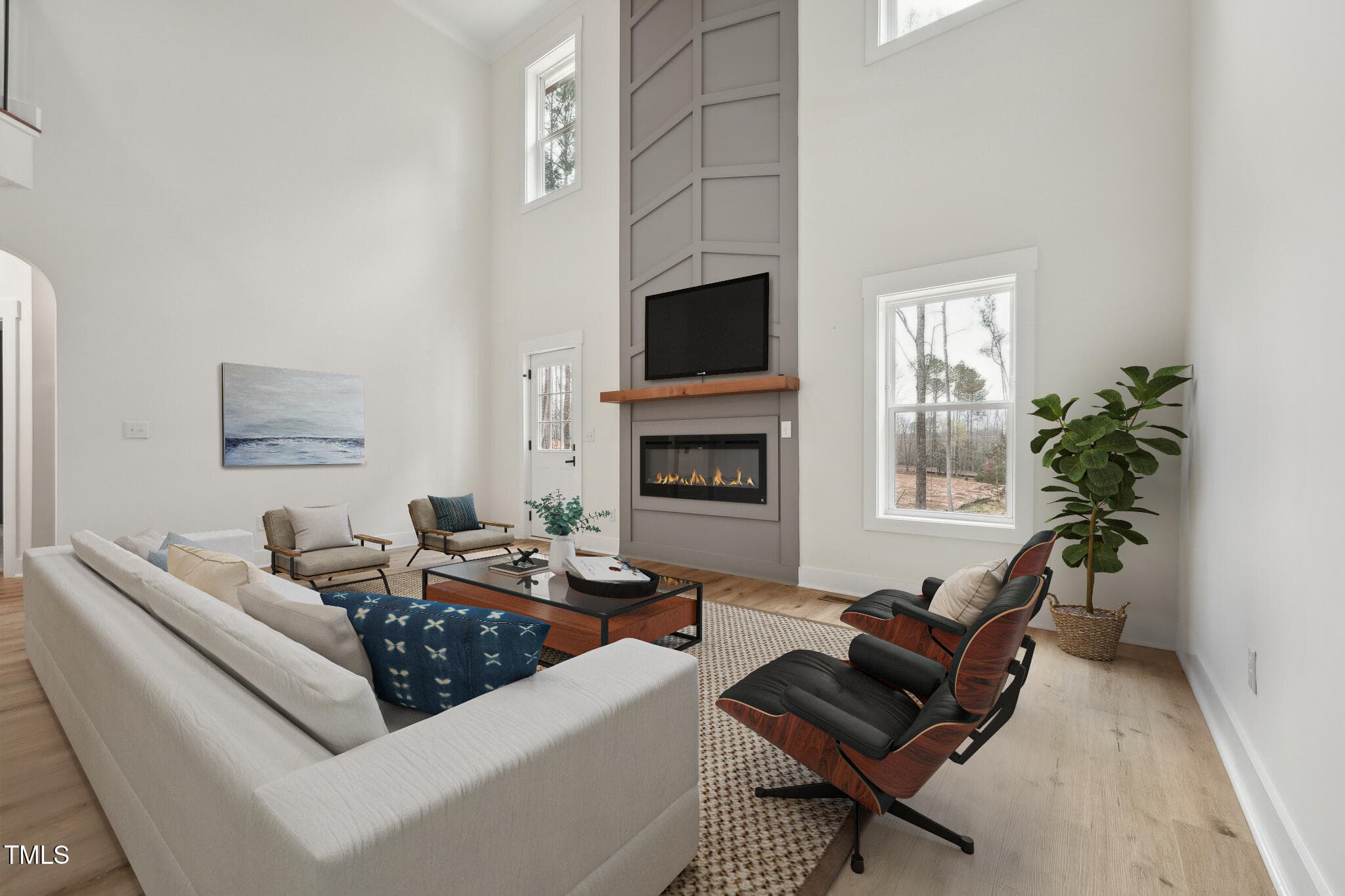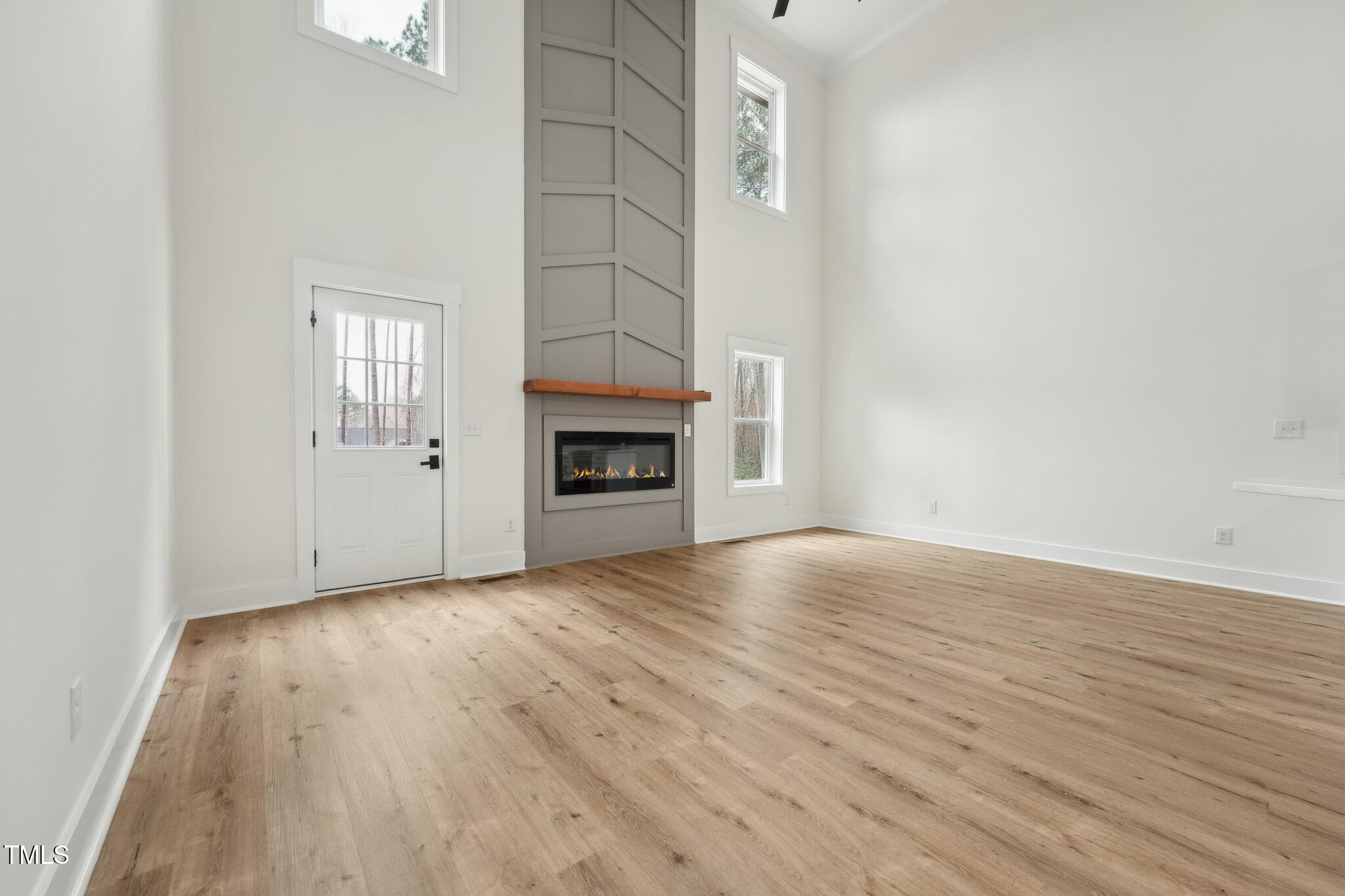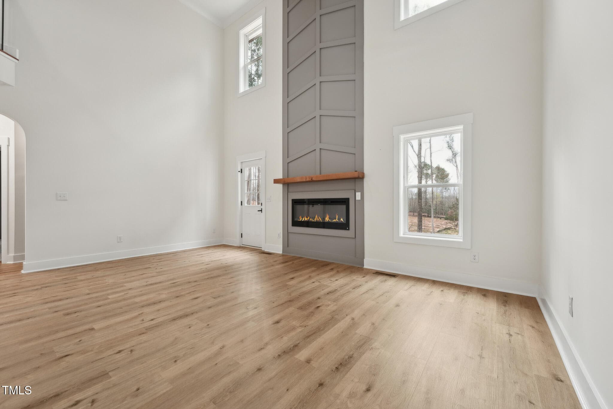 New Construction in the private, gated community of Lake Royale! This exquisite 3-bedroom home is loaded with upgrades featuring main level LVP flooring, extensive millwork throughout, custom finishes, and an energy-efficient certification for long-term savings. The open-concept design welcomes you to a 2-story foyer leading to a soaring Family Room, complete with a modern linear fireplace framed by a dramatic 2-story accent wall with direct access to the spacious deck overlooking the serene wooded backyard. The elegant Dining Room shines with crown molding and wainscoting, while the Kitchen is rich in beauty with white soft-close cabinetry, Quartz countertops & backsplash, SS appliances–refrigerator included, and peninsula bar seating. An arched hallway leads to the 1st-floor Primary Suite showcasing a tray ceiling, decorative accent wall, and two custom walk-in closets. The sleek en-suite bath impresses with a white dual vanity accentuated with gold hardware, Quartz counters, striking gold trimmed curved mirrors, and a luxurious walk-in shower, tiled floor to ceiling, with a bench seat and rainfall shower head. Head upstairs to find two spacious secondary bedrooms, each with custom walk-in closets, a spectacular full bath, and a versatile Flex Room offering endless possibilities as a Rec Room, home Office, or additional living space. Offering an unmatched lakefront lifestyle with top-tier amenities, residents will enjoy a 345-acre lake, two beaches, multiple docks & boat launches, a swimming pool, tennis & basketball courts, a lakeside clubhouse, an open-air pavilion, playgrounds, and even a golf course. Additional highlights include an encapsulated crawl space and fully finished 2-car Garage.