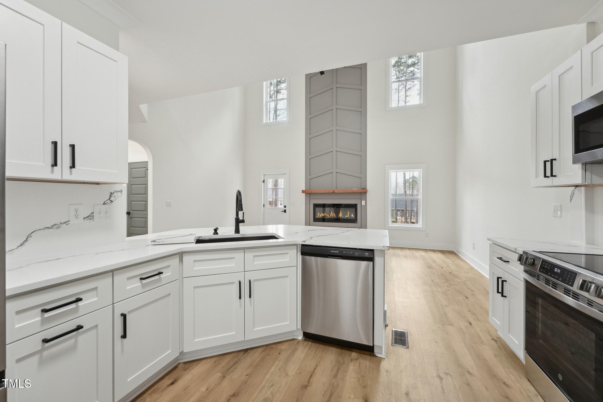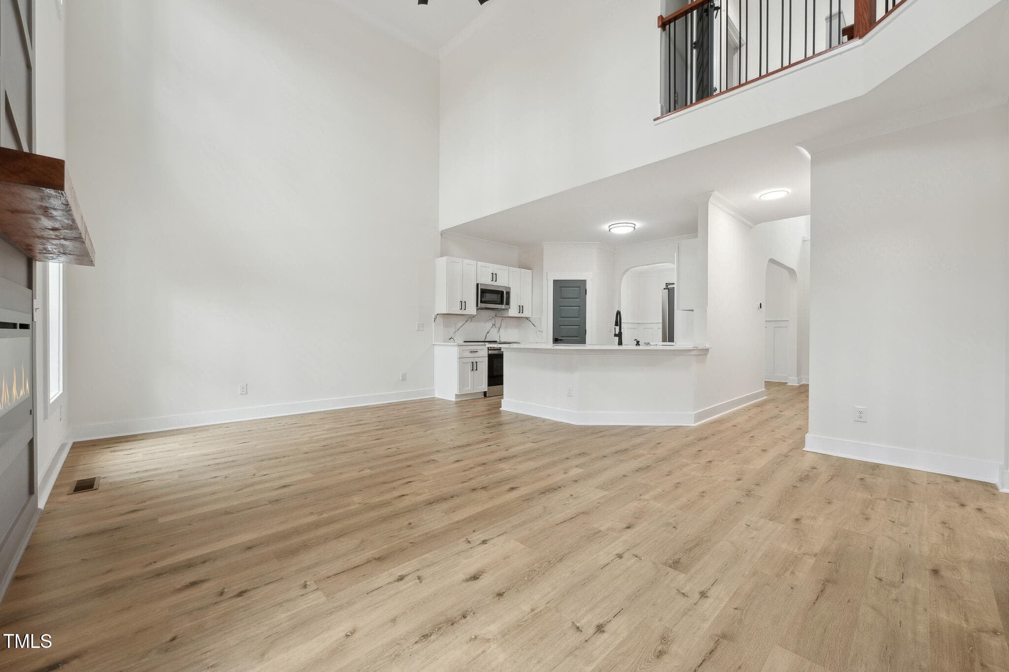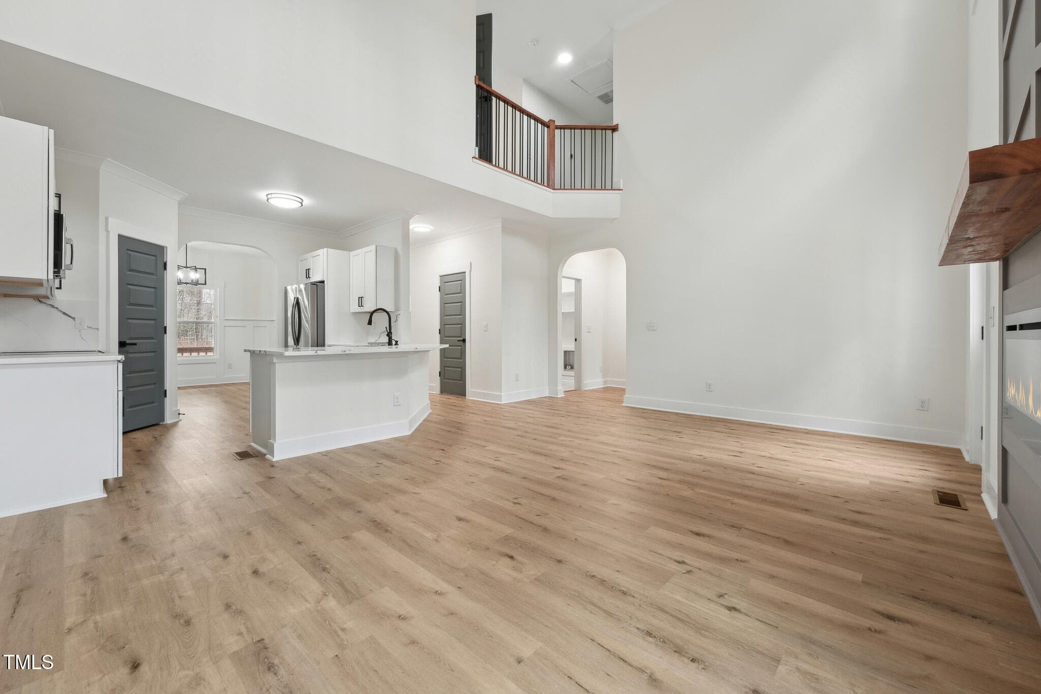 The open-concept design welcomes you to a 2-story foyer leading to a soaring Family Room, complete with a modern linear fireplace framed by a dramatic 2-story accent wall with direct access to the spacious deck overlooking the serene wooded backyard. The elegant Dining Room shines with crown molding and wainscoting, while the Kitchen is rich in beauty with white soft-close cabinetry, Quartz countertops & backsplash, SS appliances–refrigerator included, and peninsula bar seating.