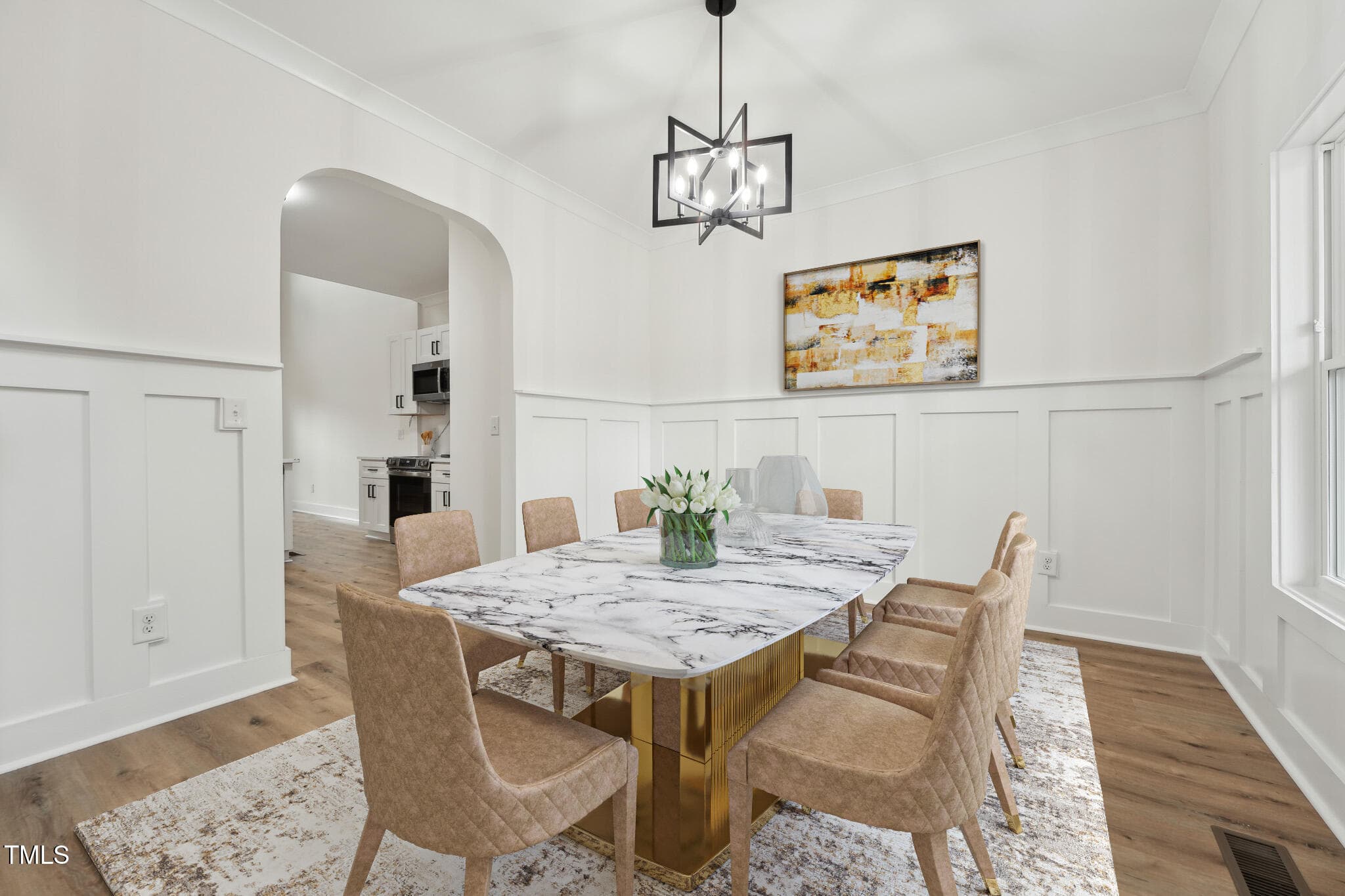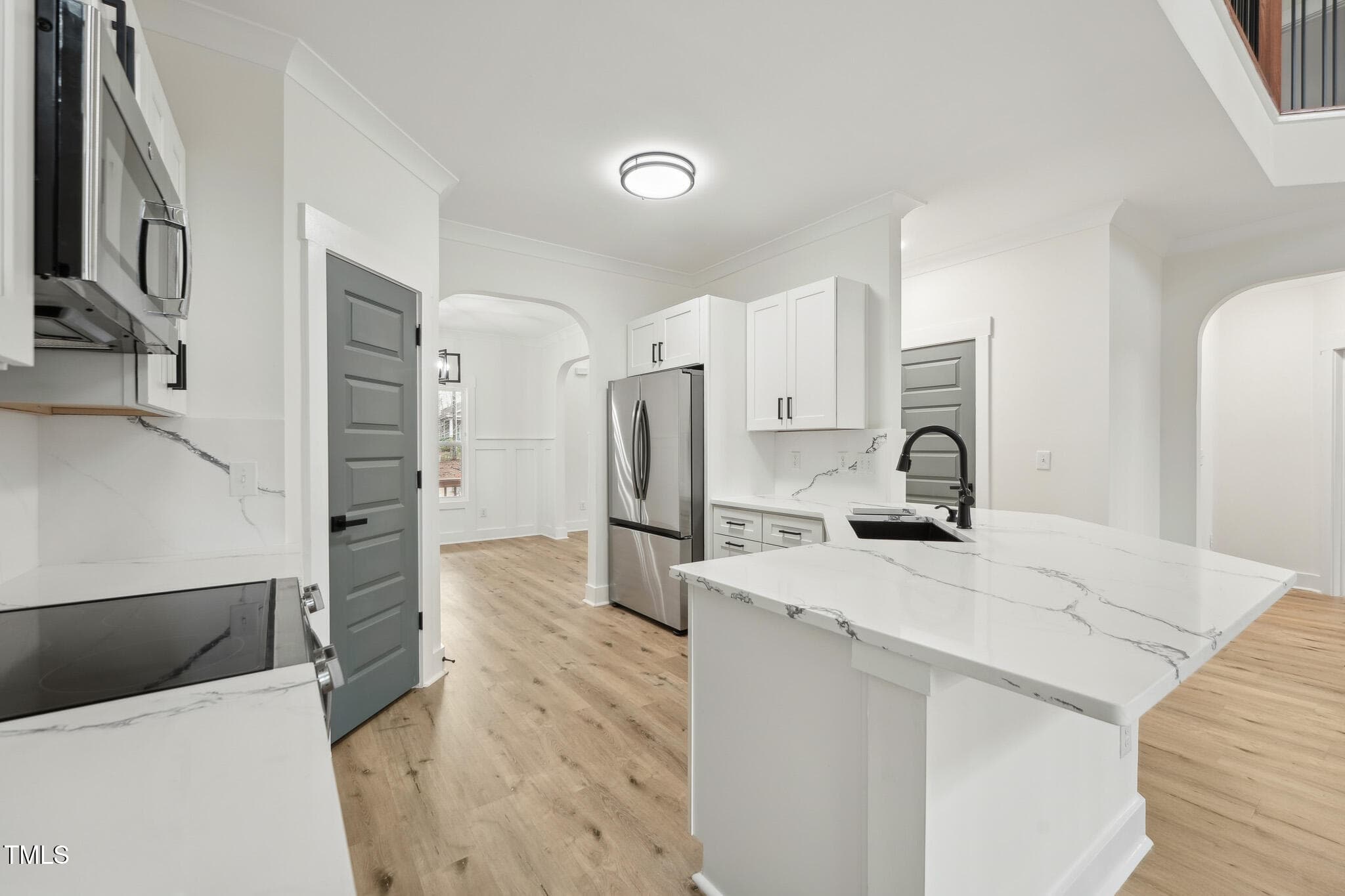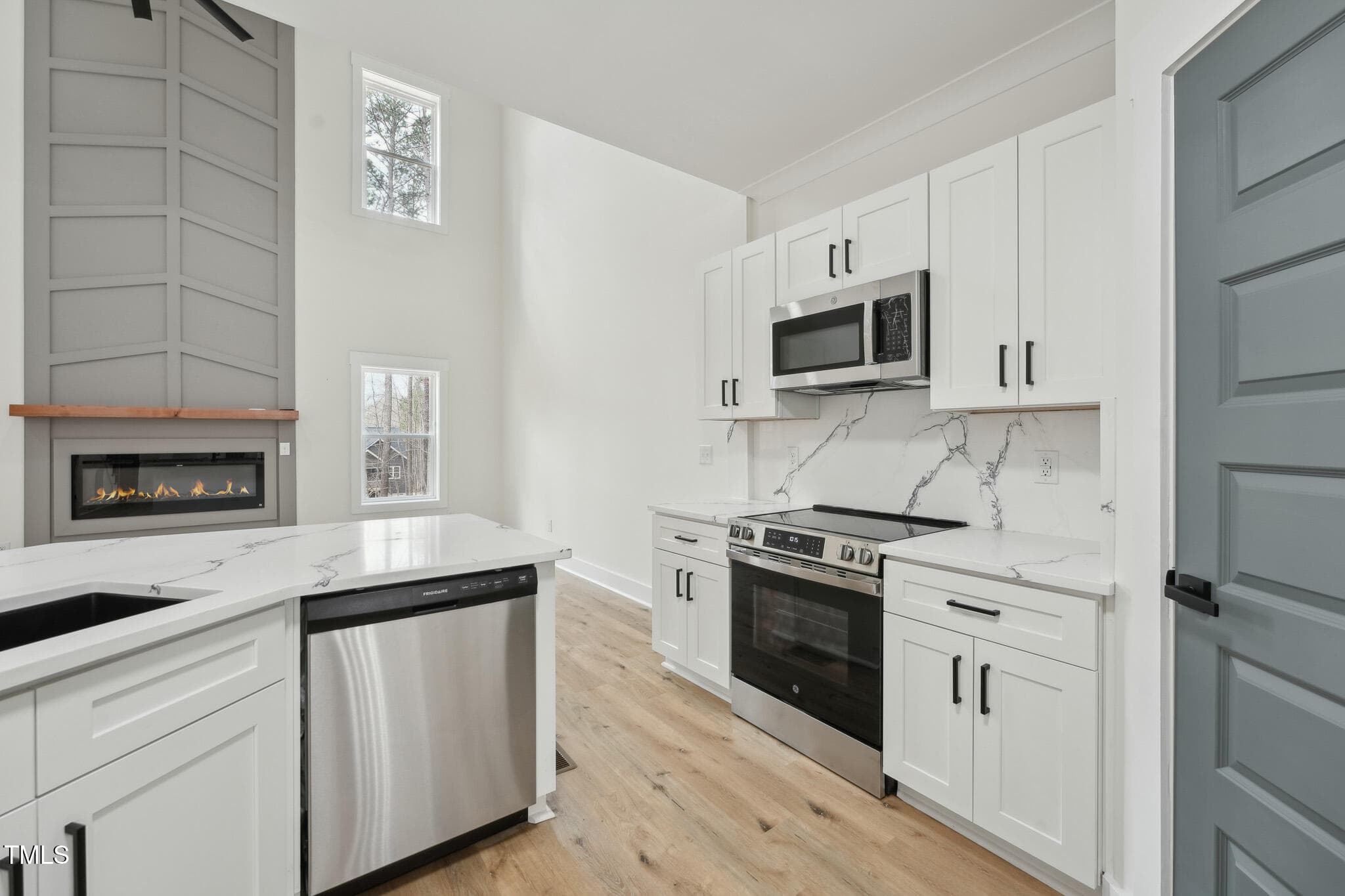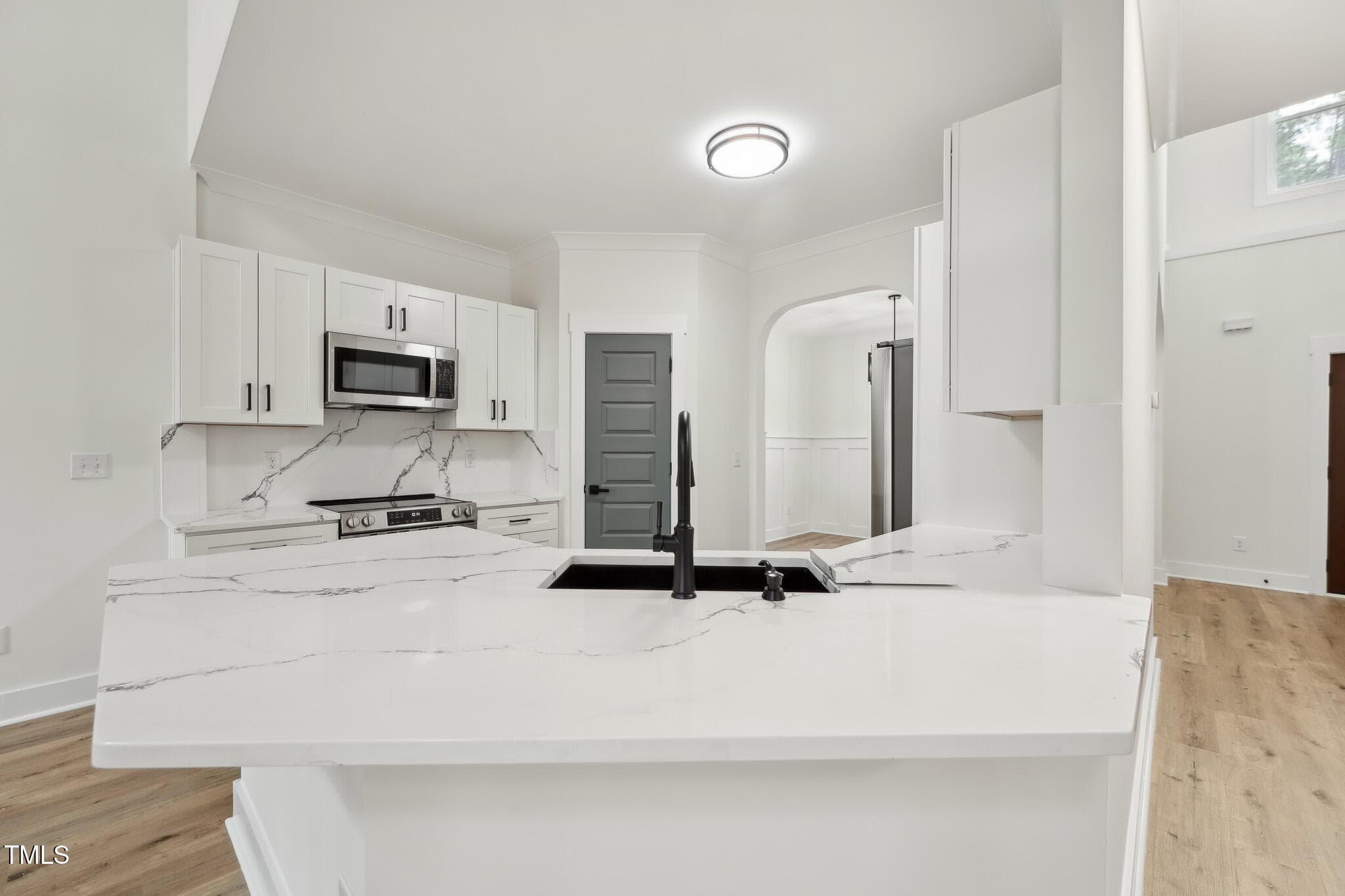 The open-concept design welcomes you to a 2-story foyer leading to a soaring Family Room, complete with a modern linear fireplace framed by a dramatic 2-story accent wall with direct access to the spacious deck overlooking the serene wooded backyard. The elegant Dining Room shines with crown molding and wainscoting, while the Kitchen is rich in beauty with white soft-close cabinetry, Quartz countertops & backsplash, SS appliances–refrigerator included, and peninsula bar seating.