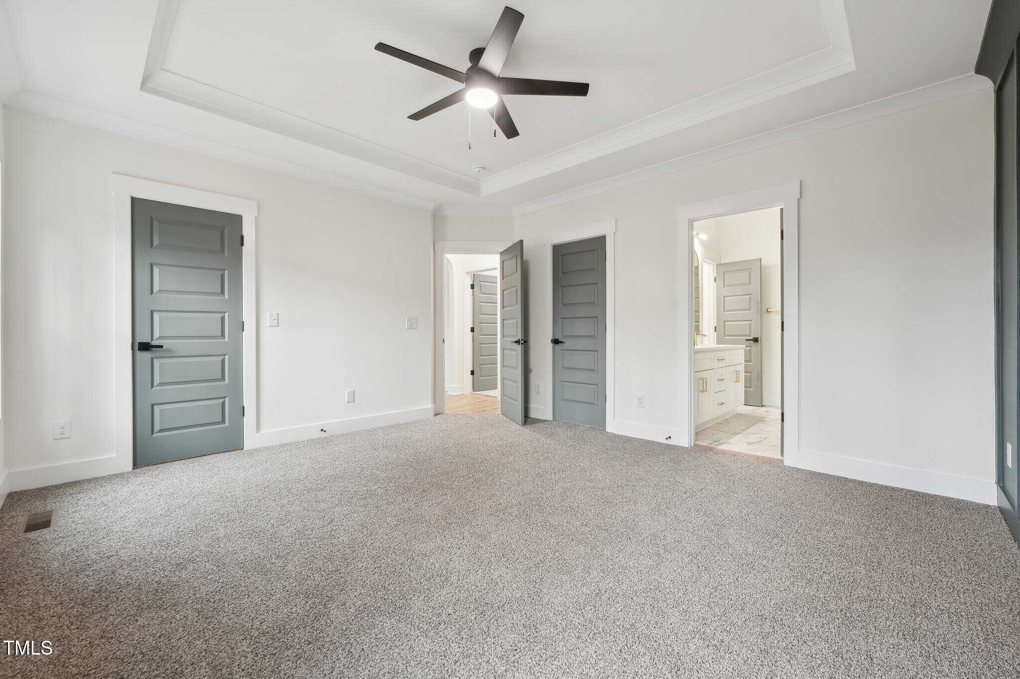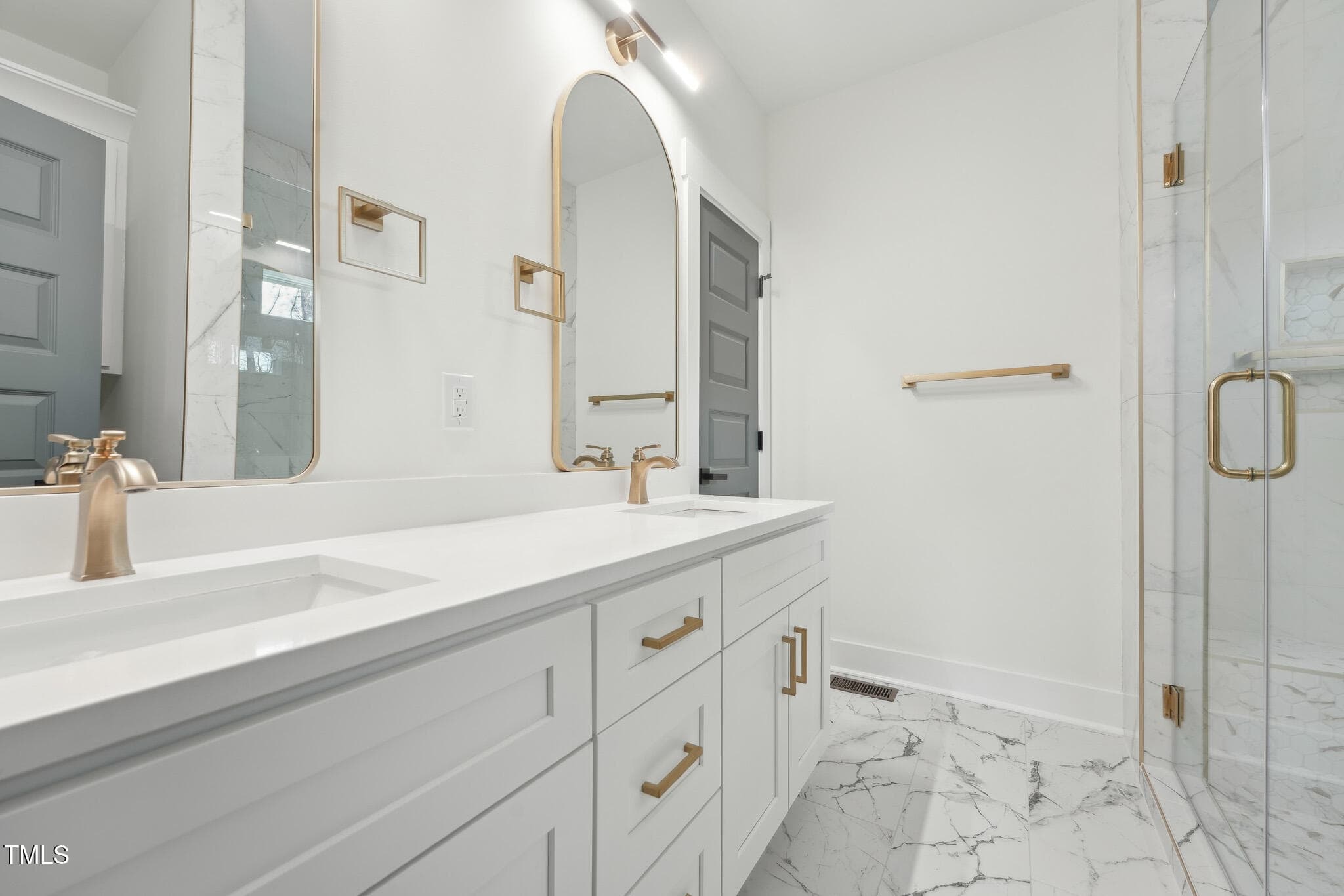 An arched hallway leads to the 1st-floor Primary Suite showcasing a tray ceiling, decorative accent wall, and two custom walk-in closets. The sleek en-suite bath impresses with a white dual vanity accentuated with gold hardware, Quartz counters, striking gold trimmed curved mirrors, and a luxurious walk-in shower, tiled floor to ceiling, with a bench seat and rainfall shower head.