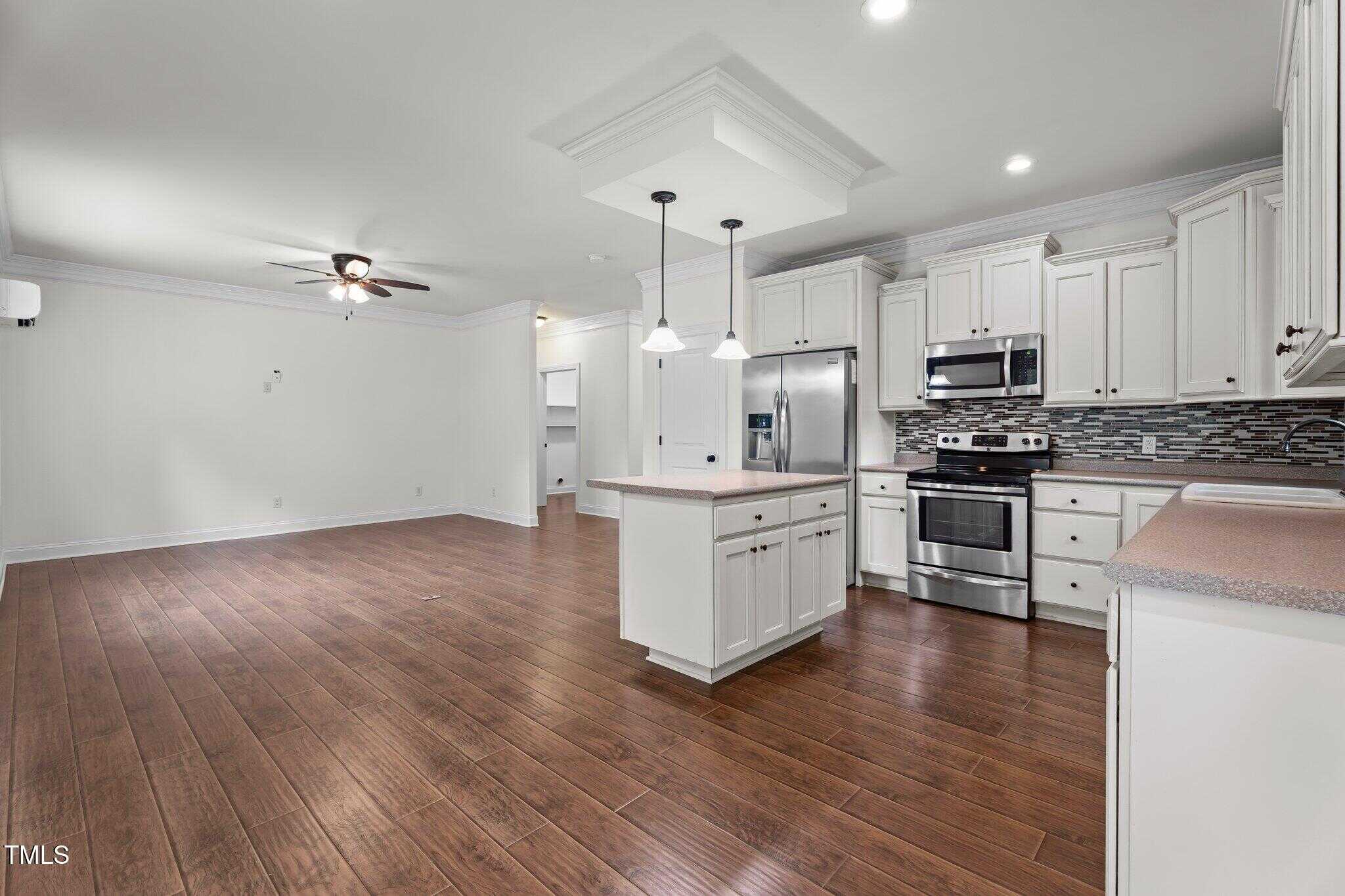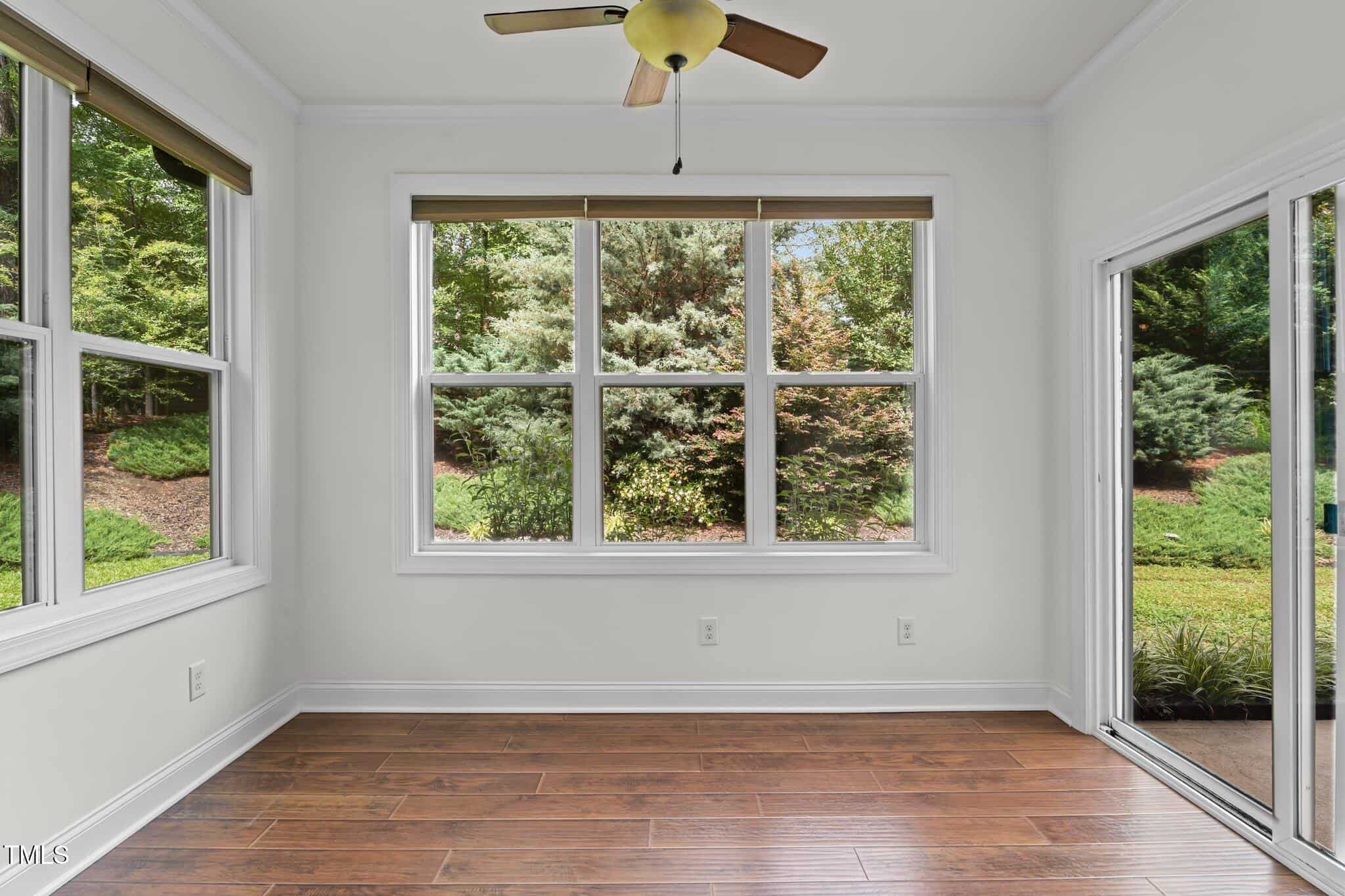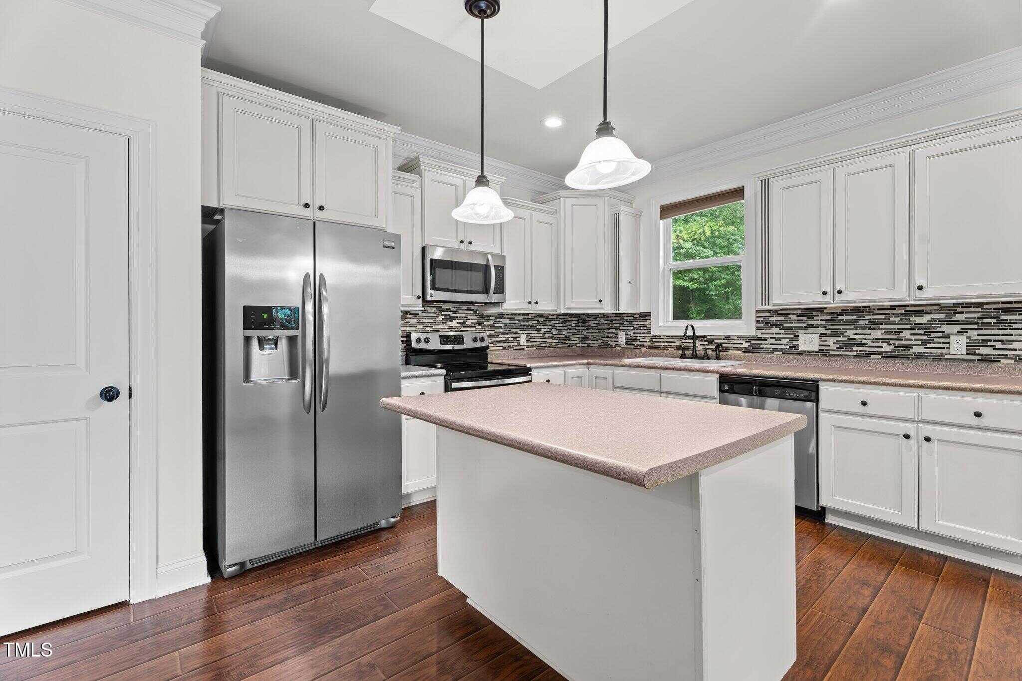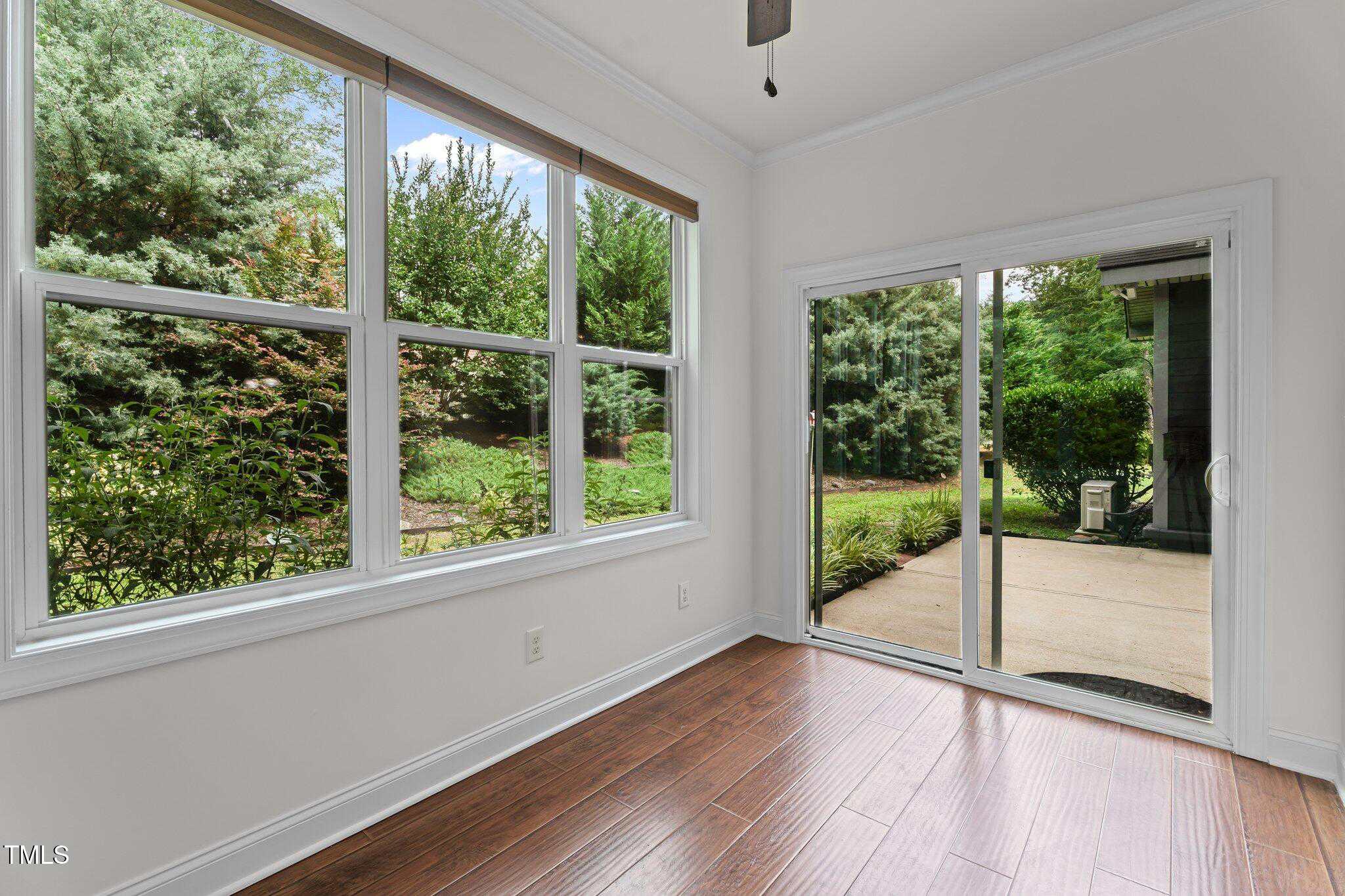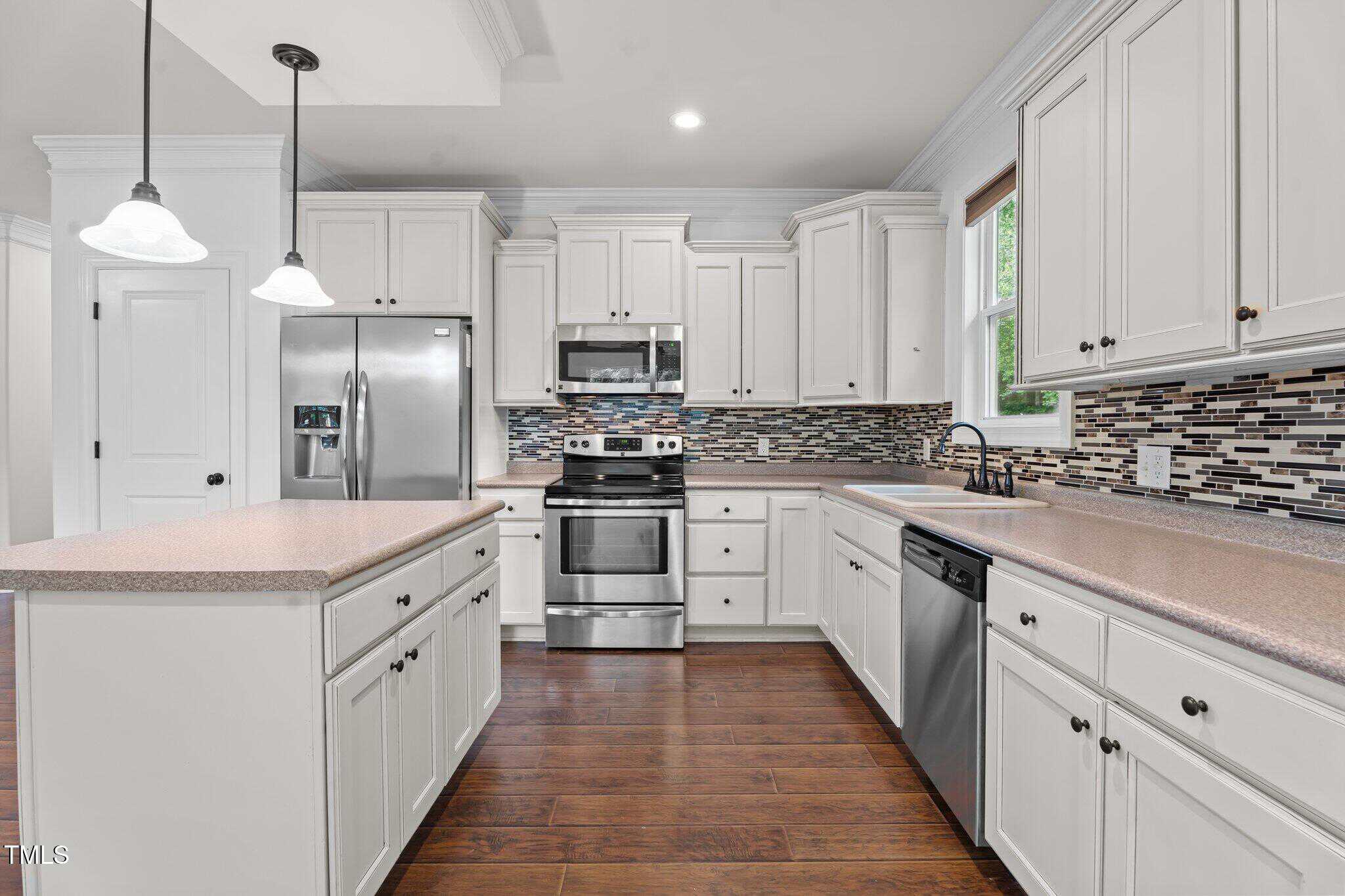 This stunning home features a gorgeous kitchen with custom cabinetry, a large island, appliances, ample counter space, and a cozy eat-in dining area perfect for entertaining. Adjacent to the kitchen, the bright and airy sunroom provides the perfect spot for relaxing, with large windows that flood the room with natural light and offer views of the serene surroundings.