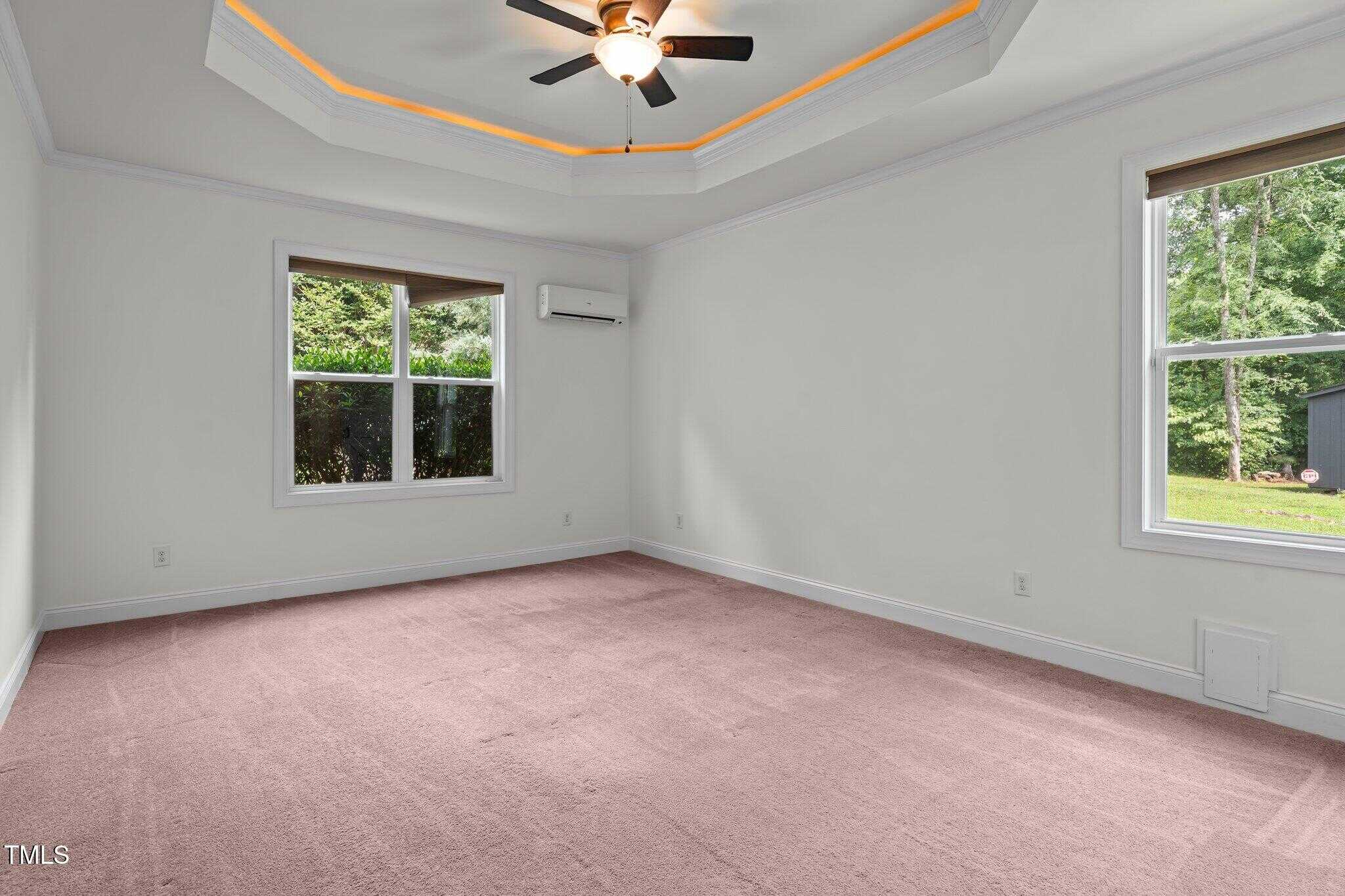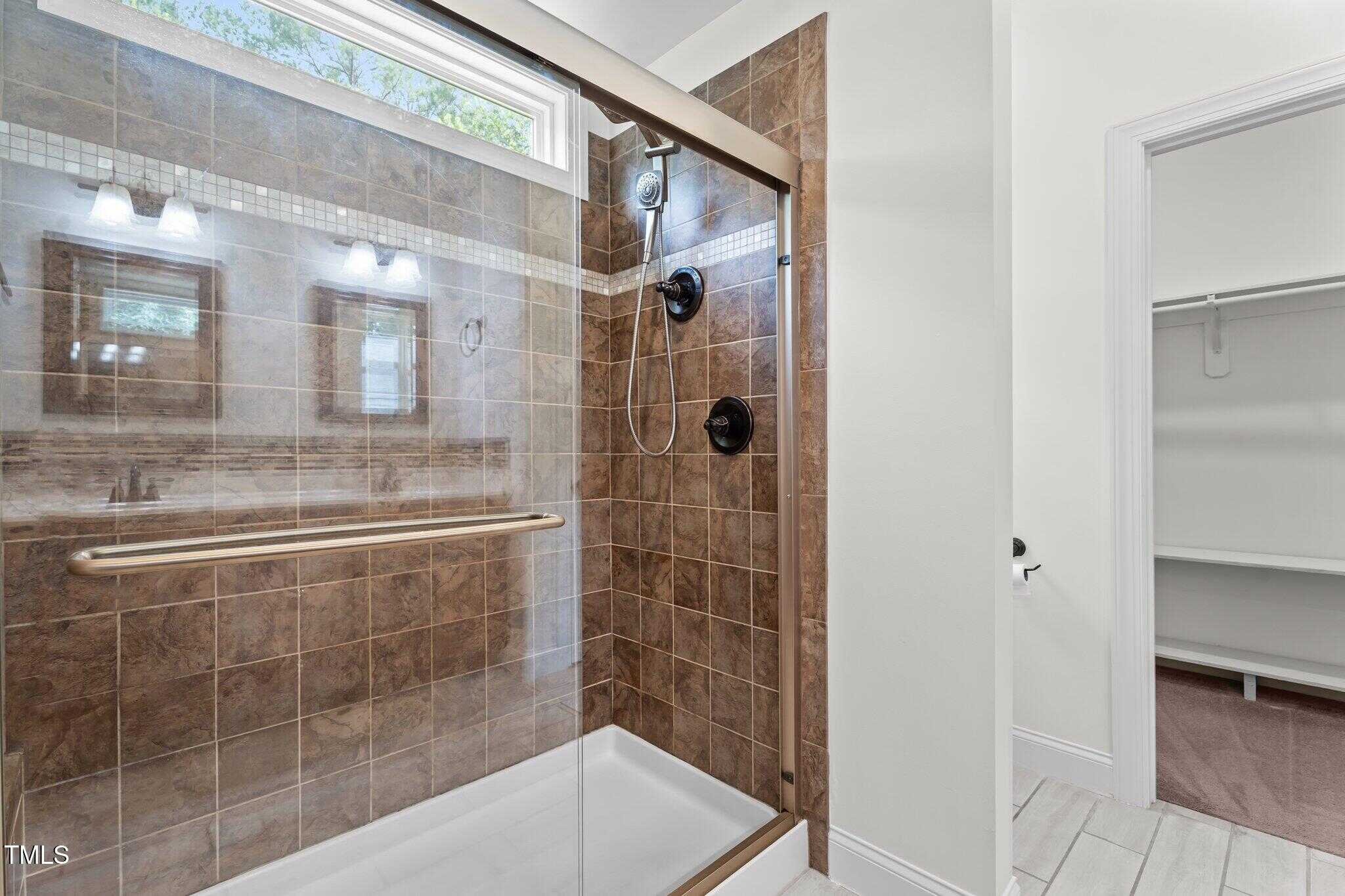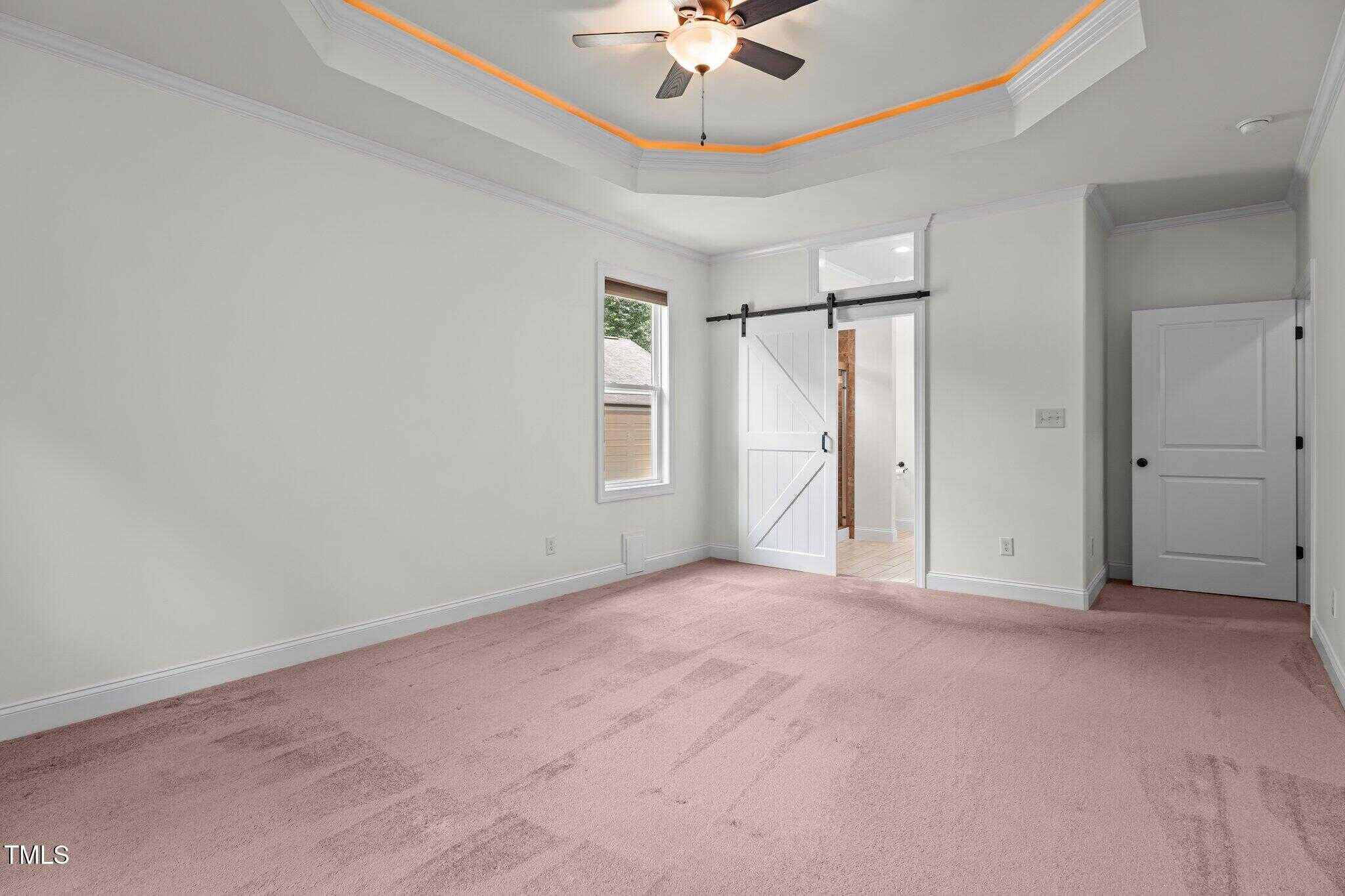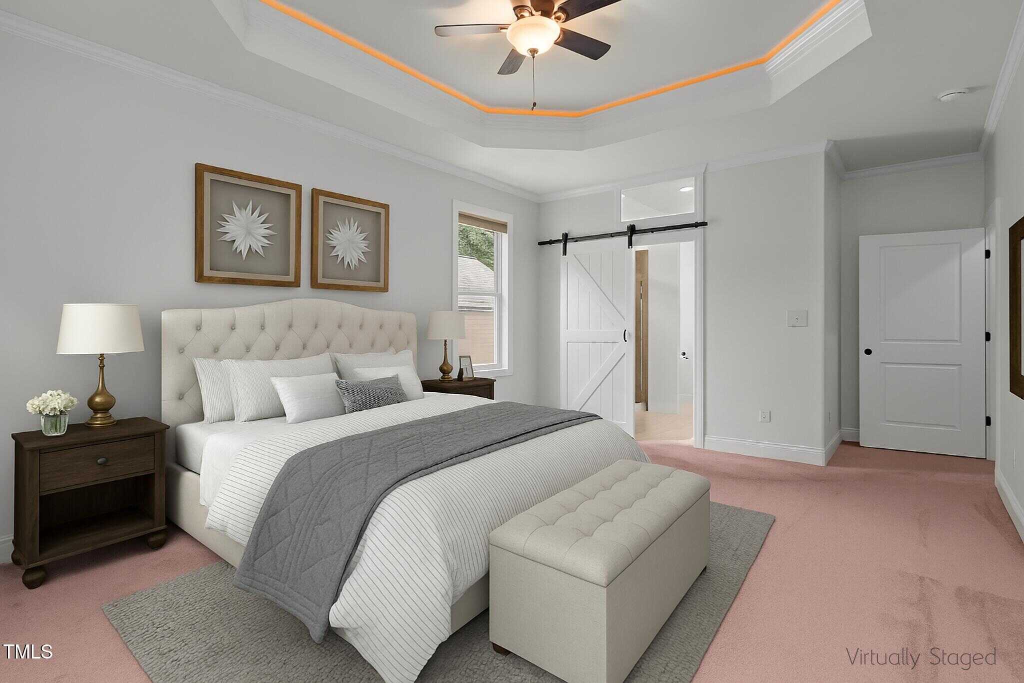 The luxurious primary suite offers a spacious bedroom filled with natural light and highlighted by a stylish tray ceiling. A sleek barn door opens to the upscale bathroom, featuring a walk-in shower, dual vanities, and a large walk-in closet—creating a perfect blend of comfort, elegance, and modern sophistication.