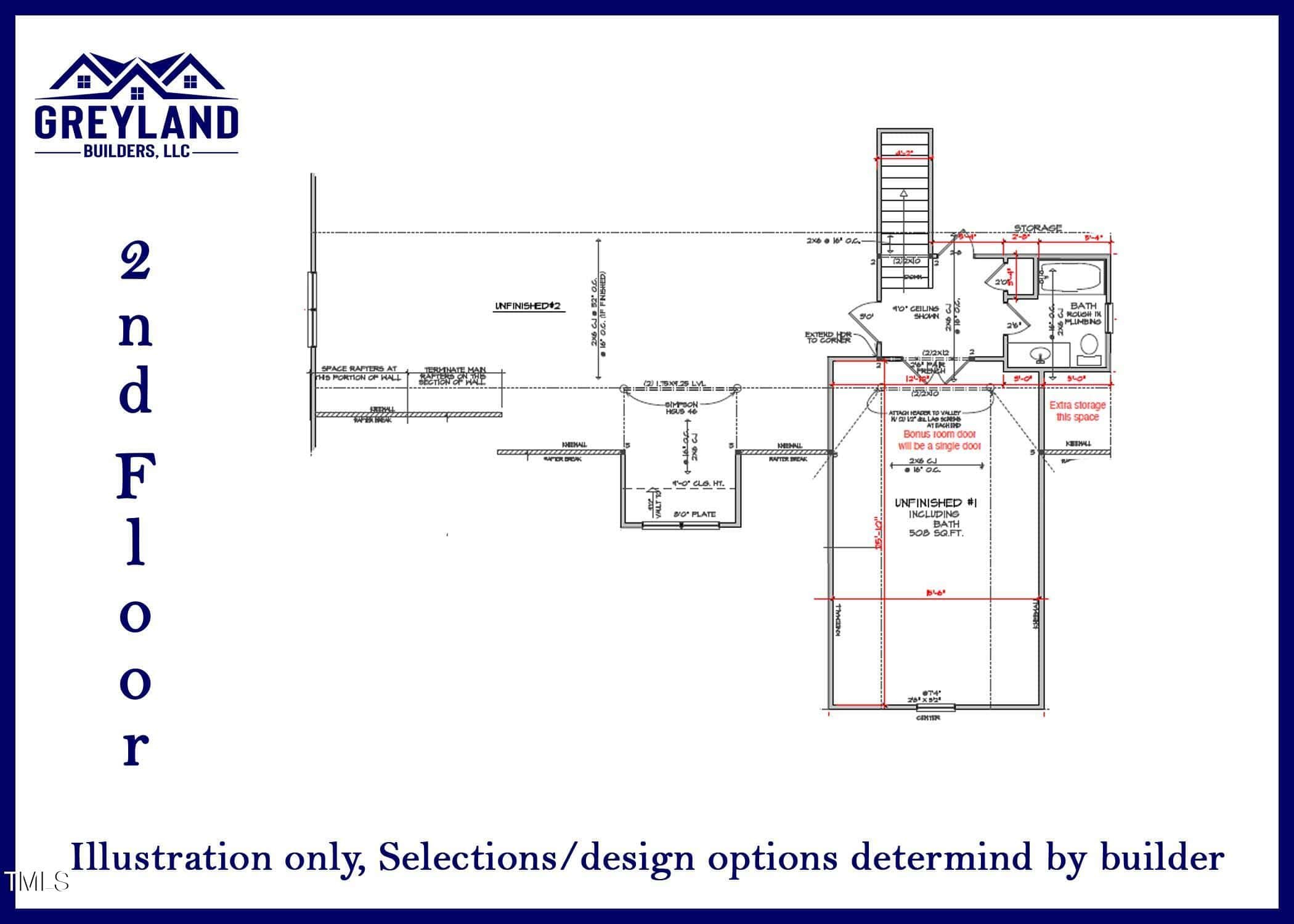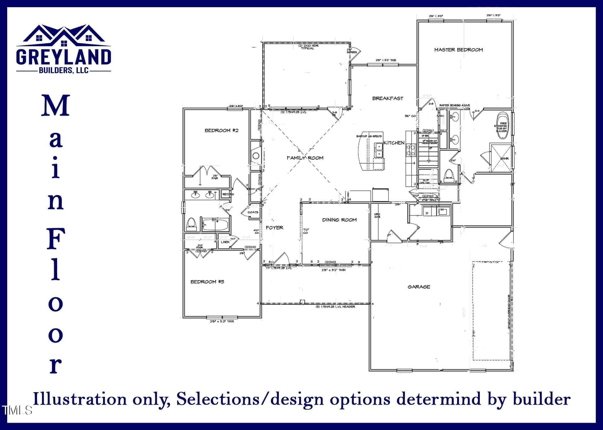 Greyland Builders Ranch with Bonus and Bath on second floor. 3/4” site-finished white oak hardwood floors, tier 1 tile in baths/laundry, tier 2 slow-close cabinets, and tier 1 quartz countertops. Common areas and master bedroom with crown molding. A screened, treated back porch and 12ft sliding glass door enhance outdoor living. The master suite offers a walk-in shower and standalone tub. in Family room a gas fireplace with built-ins adds warmth. Exterior: White vinyl windows, black architectural shingles , tier 2 vinyl siding (Bayou blue, accent TBD) and Northampton brick foundation.