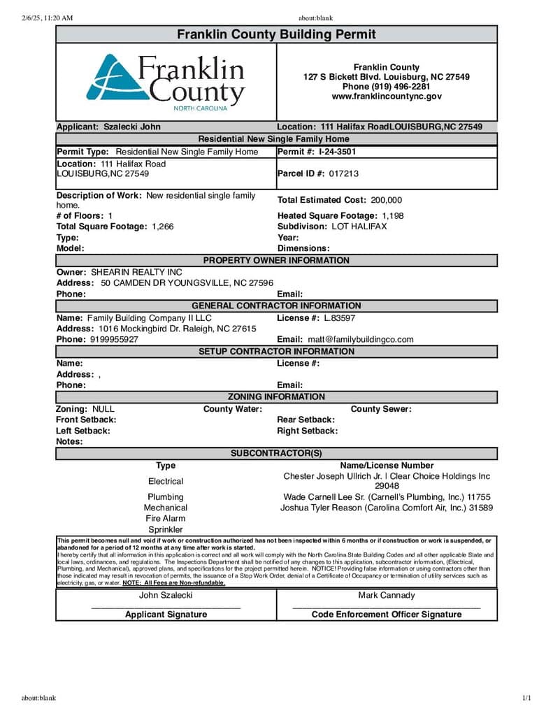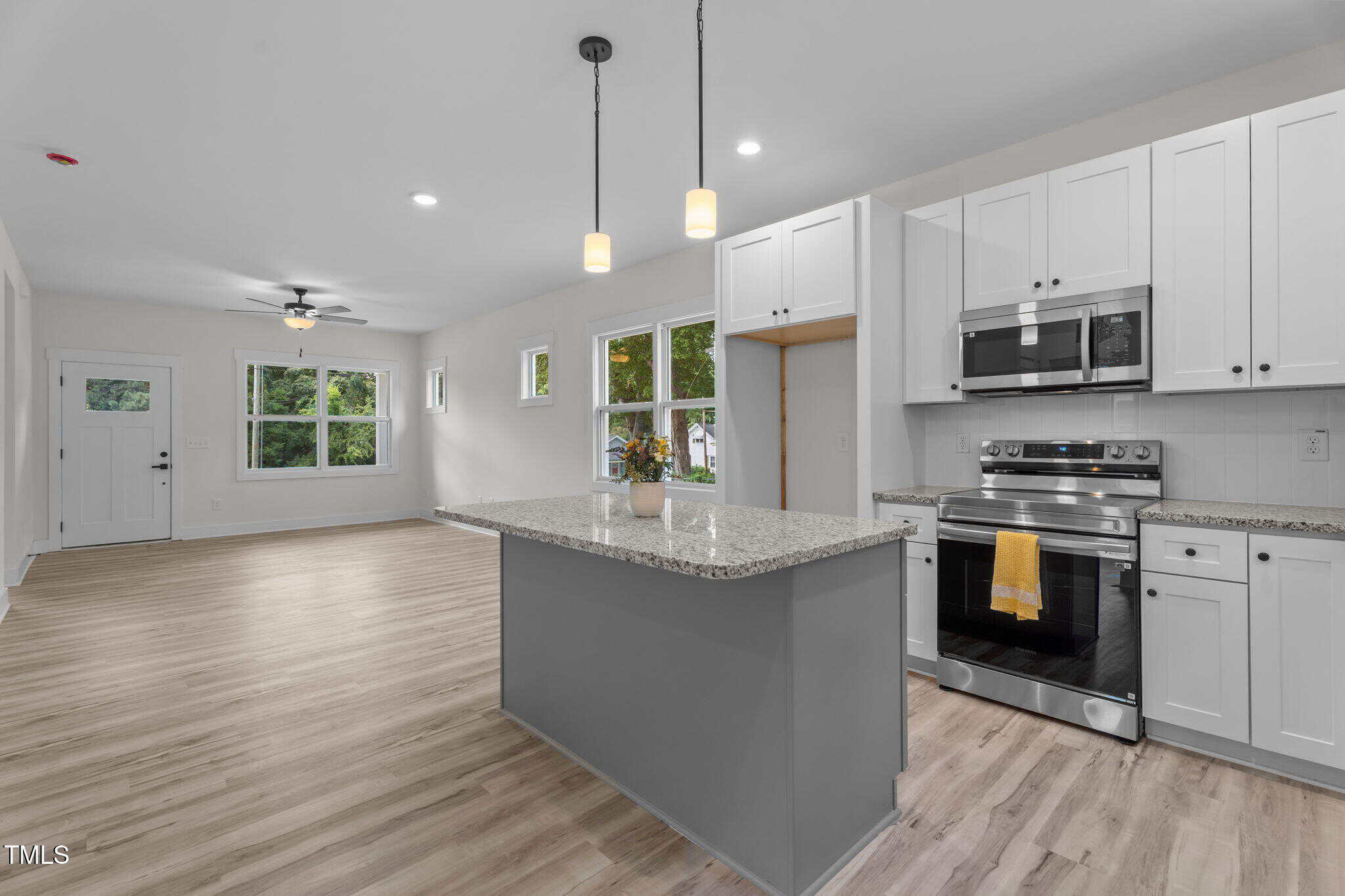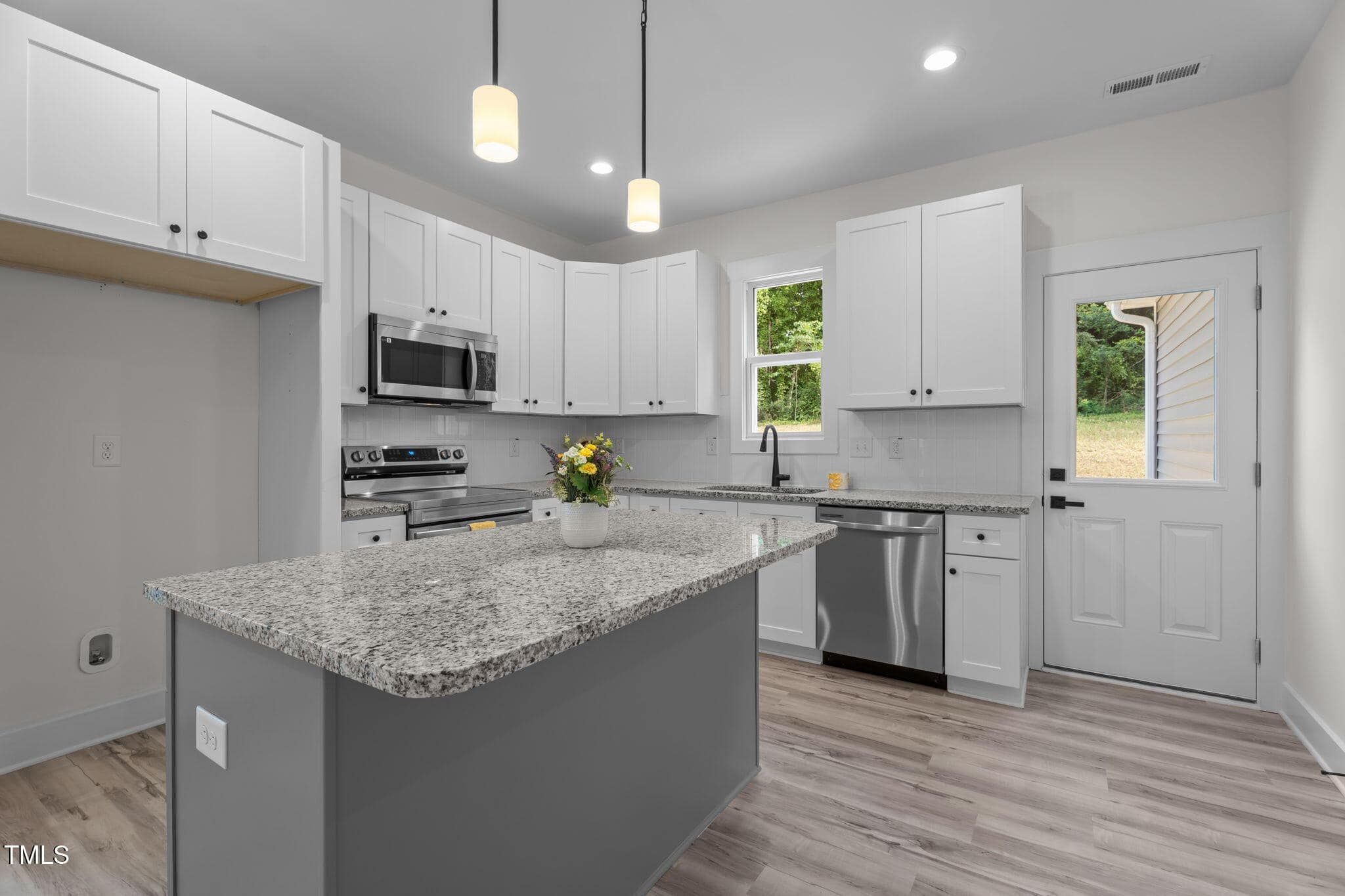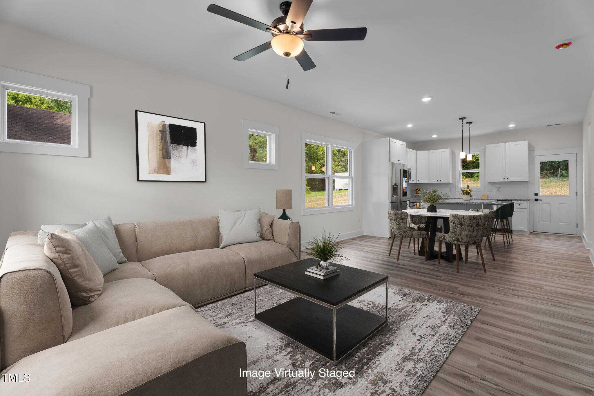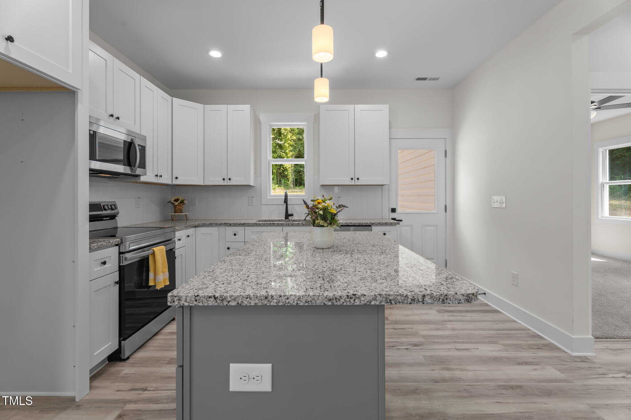 THIS HOME IS A STEAL!!! Washer/Dryer, Refrigerator and Blinds included! This 3-bedroom, 2-bath gem delivers on quality, style, and location. It’s a step above with custom touches that elevate the everyday and a location that blends historic charm with a strong sense of community. A truly rare find close to downtown Louisburg, and highways 401, 56, 39, 561 and the executive airport! HIGH QUALITY FINISHES: Step inside to find high end, 20 mil LVP flooring throughout the main living area, providing both durability and style. The generously sized kitchen is a highlight, showcasing sleek granite countertops, tile backsplash, SOLID WOOD soft-close cabinets, and upgraded lighting that enhances both function and ambiance.The open-concept layout seamlessly connects the kitchen, dining, and living areas, creating a perfect space for entertaining and everyday living. Each of the three bedrooms offers ample space and comfort, while the two bathrooms are designed with quartz counters, upgraded plumbing fixtures and the same solid wood cabinets. Be sure to notice the quality craftsmanship of the solid pine casings on windows and doors as well as the upgraded craftsman style doors. 9 foot ceilings elevate the feel of the entire home! Large walk in laundry room allows for lots of extra storage as well as HUGE attic storage space. Don’t miss the 240V outlet (EV ready) on exterior of home and Solar Ready Conduit!See features list in docs for all the great quality upgrades! Most of these finishes you will never see in a home priced under $300,000 and we even use the same cabinets used in many million dollar+ homes! Adding to the appeal is a one-year builder warranty, ensuring peace of mind and confidence in your new home.