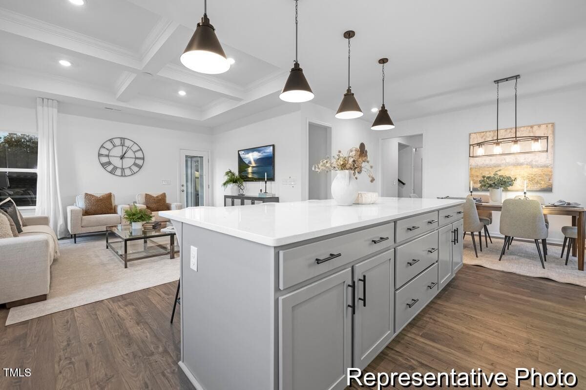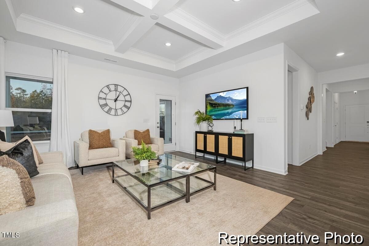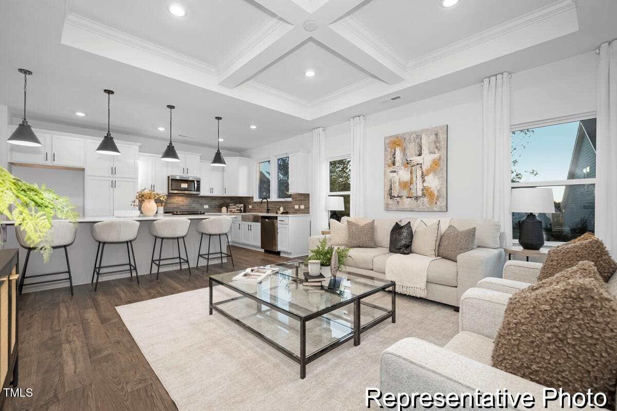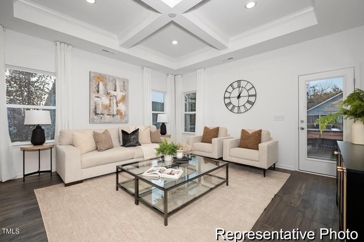 Experience luxury and convenience in this semi-custom Cyprus plan at Lake Royale! With 3 bedrooms and 3 baths, this home offers spacious living and modern finishes. The primary suite, featuring a luxurious ensuite, is conveniently located on the main level, along with a secondary bedroom, laundry room with folding table, and an additional full bath. The great room is highlighted by a stunning beamed coffered ceiling, while the kitchen showcases stainless steel appliances, marble countertops, and upgraded cabinetry. Relax on the rear covered porch, perfect for unwinding. The second level features a versatile game room, third bedroom, and additional full bath.
