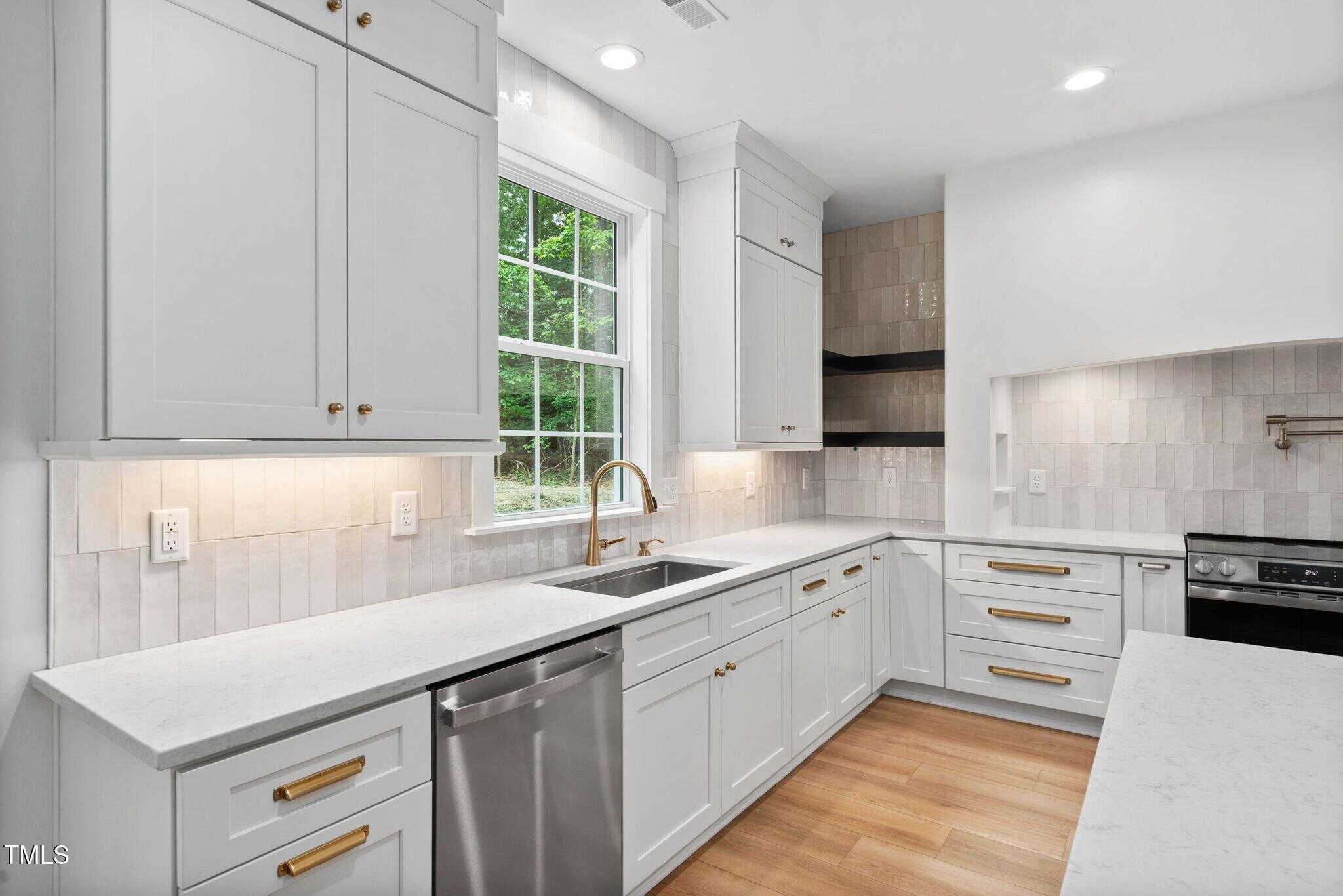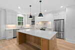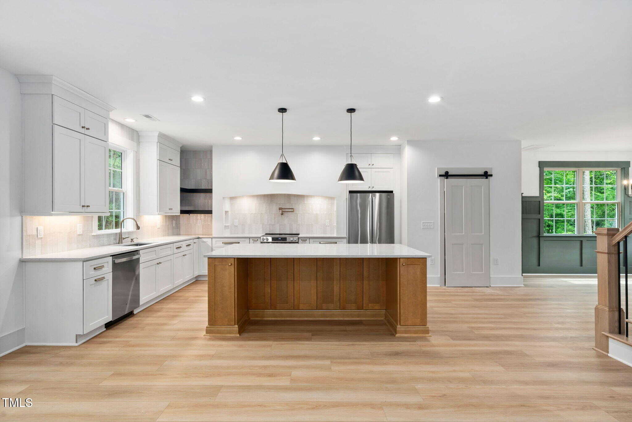 Dream Kitchen: Oversized island, quartz countertops, custom cabinetry with built-in garbage/recycling & spice rack drawers, architectural range hood with niches and pot filler, electric slide-in range, wood-shelved pantry, and the refrigerator is included.