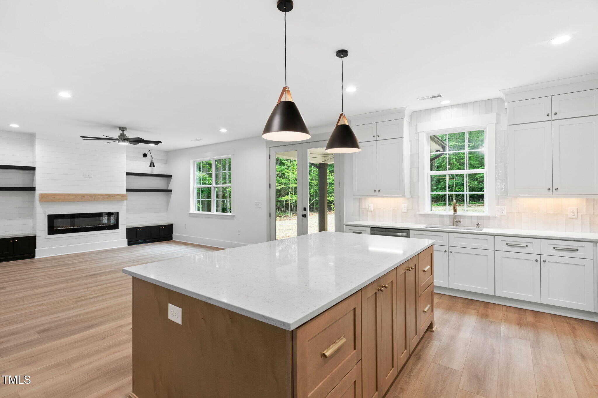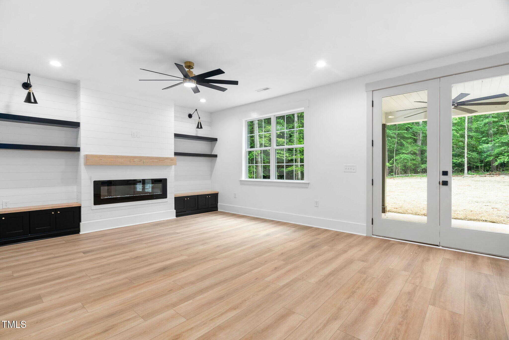 Living Room Highlights: Shiplap feature wall with floating shelves, built-in storage, linear electric fireplace, and French doors leading to the covered patio.