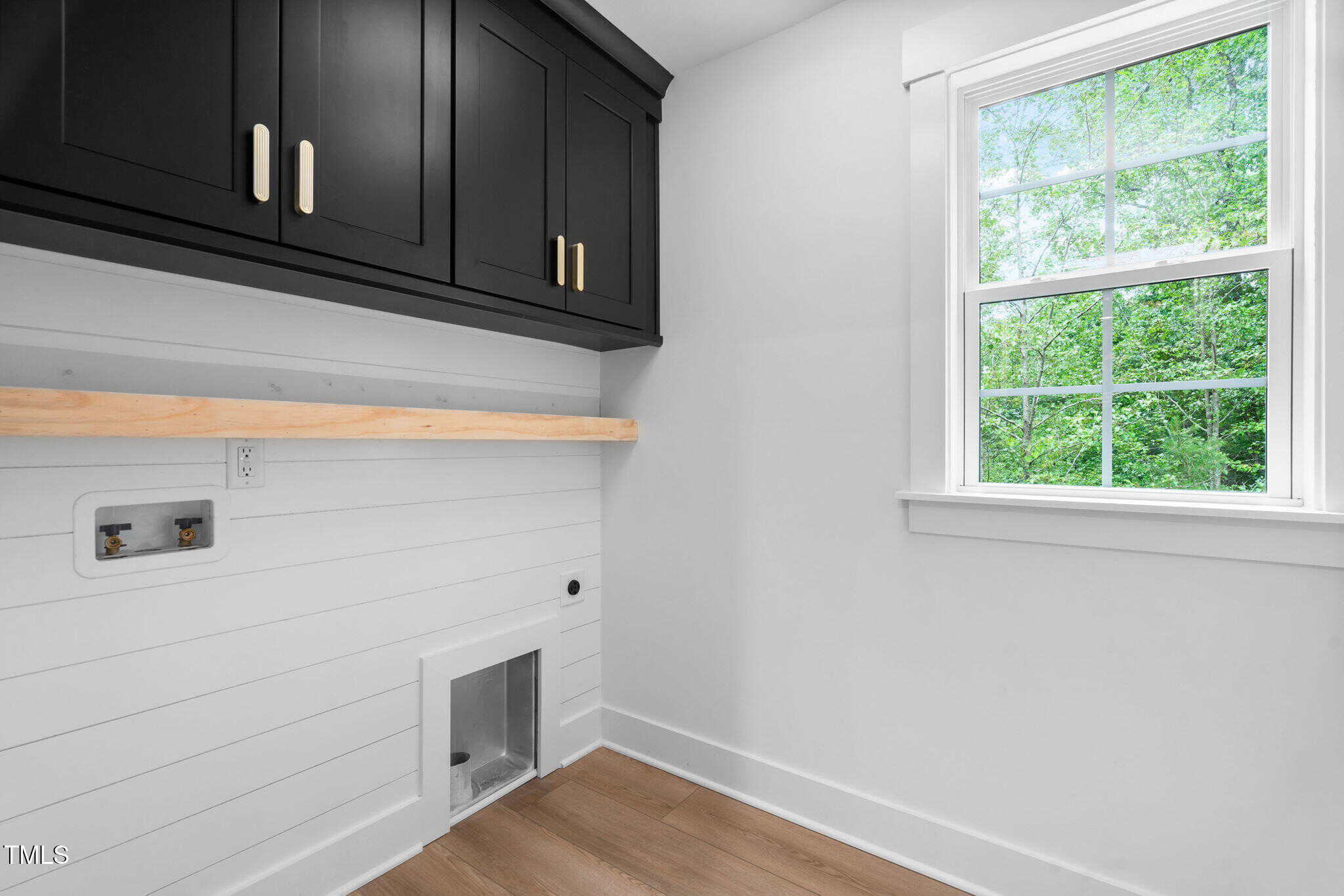 Large laundry room with cabinets and floating shelf