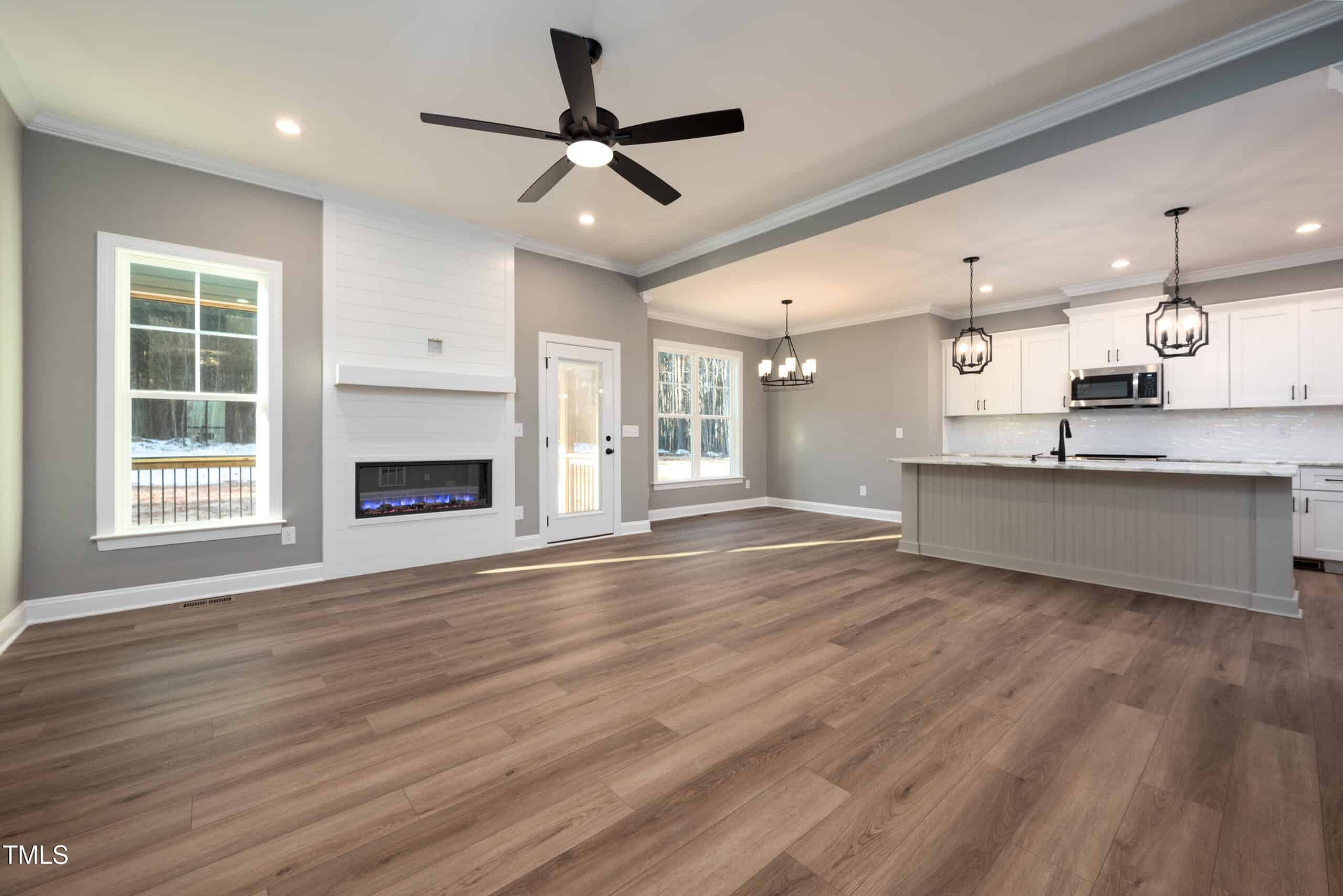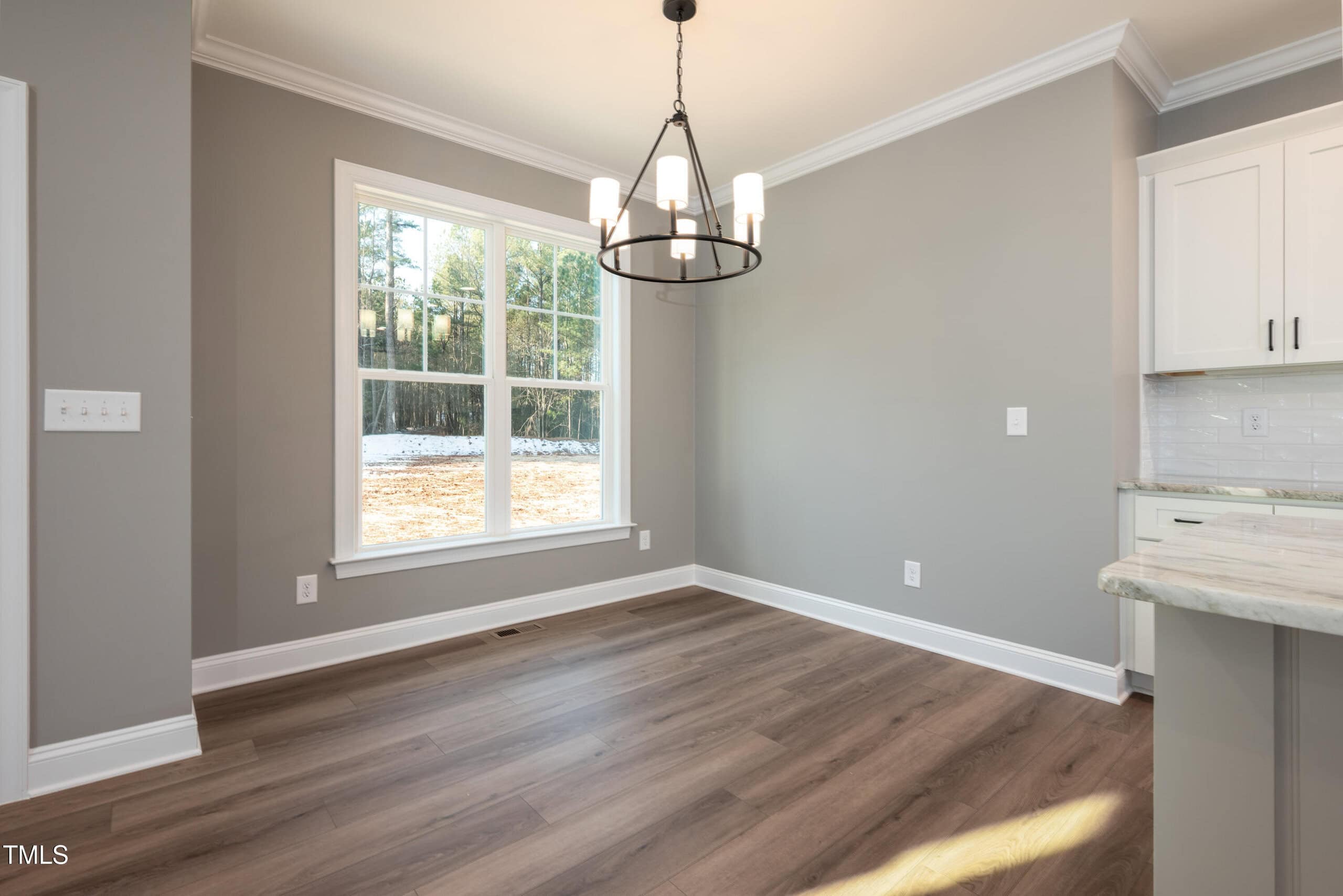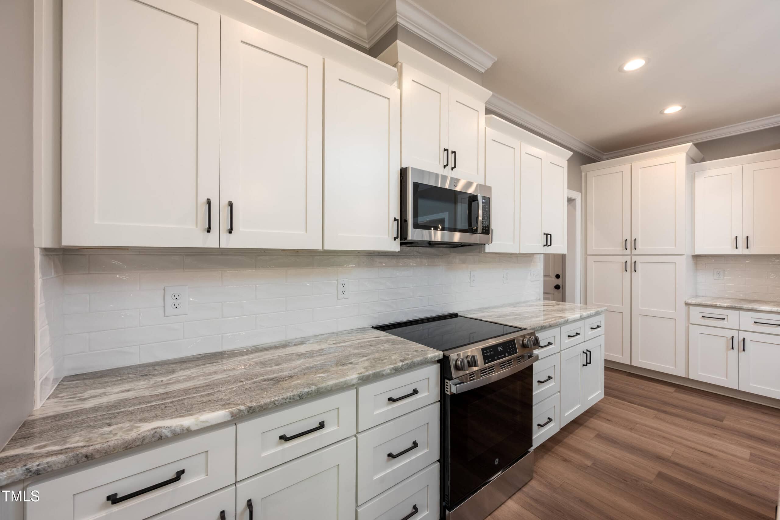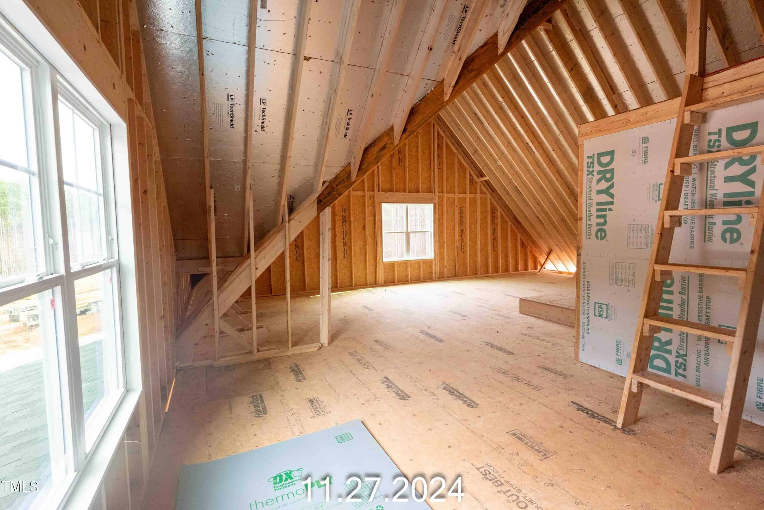 One and a half story ranch style home. Primary and Guest bedrooms on Main floor. Covered back porch with vaulted ceiling and ceiling fan. Breakfast nook and formal dining room. Open kitchen family room with wall mount electric fireplace on Shiplap accent wall and box mantle. Laundry room with shelf and Utility Sink. Guest bath with tub and Tiled shower walls with niche. Primary Bedroom with trey ceiling/Crown Primary Bath with large tiled walk-in shower and separate soaking Tub. Large walk in closet with wood shelving and sweater boxes, Dual vanity with granite top. 2nd floor with Large Bonus room, 3rd bedroom and Full bath. Plenty of extra walk-in storage space with room to expand.