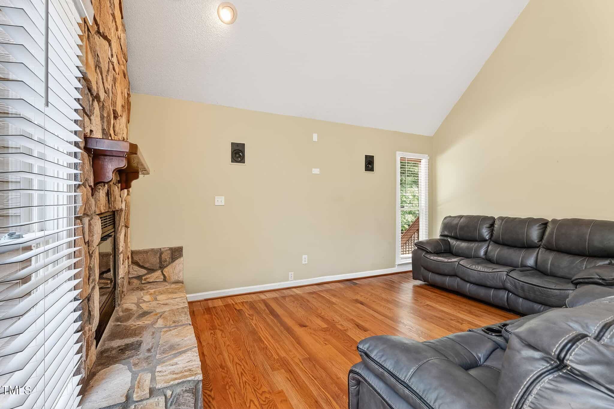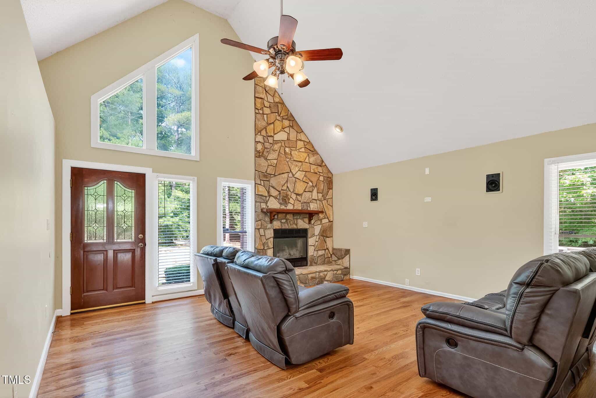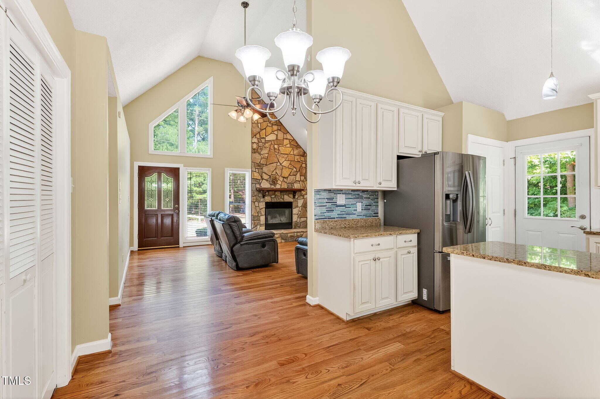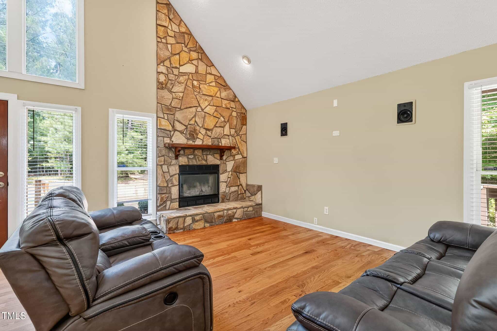 Another Lake Royale beauty with a backyard unlike any other! This custom 3 bedroom, 2 bathroom home has all you could need and more. The vaulted ceilings in the living room, plus the floor to ceiling stone fireplace is welcoming and cozy.