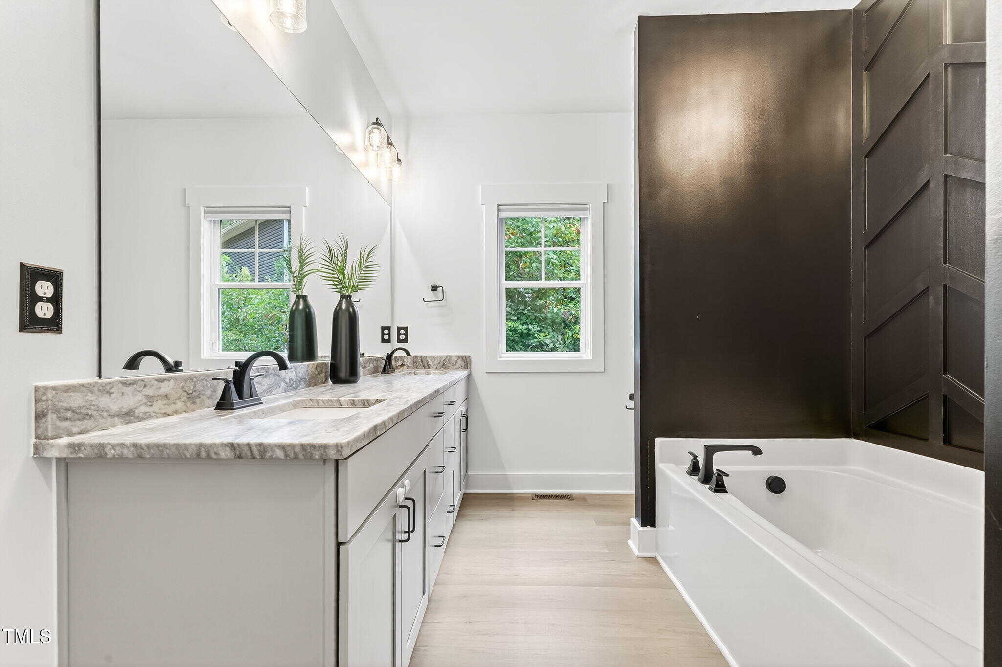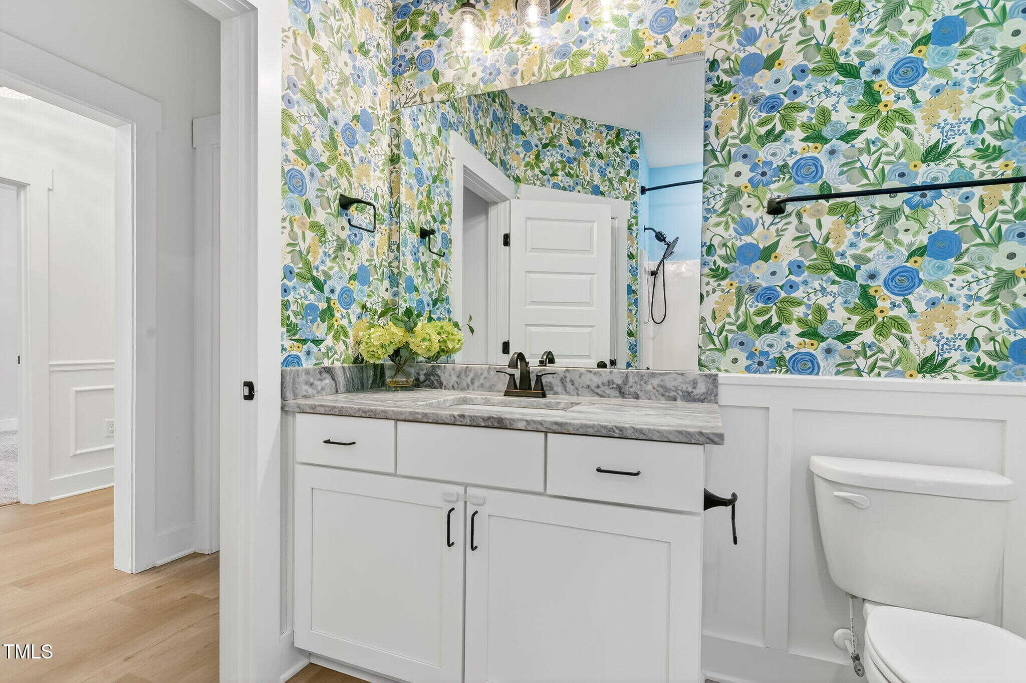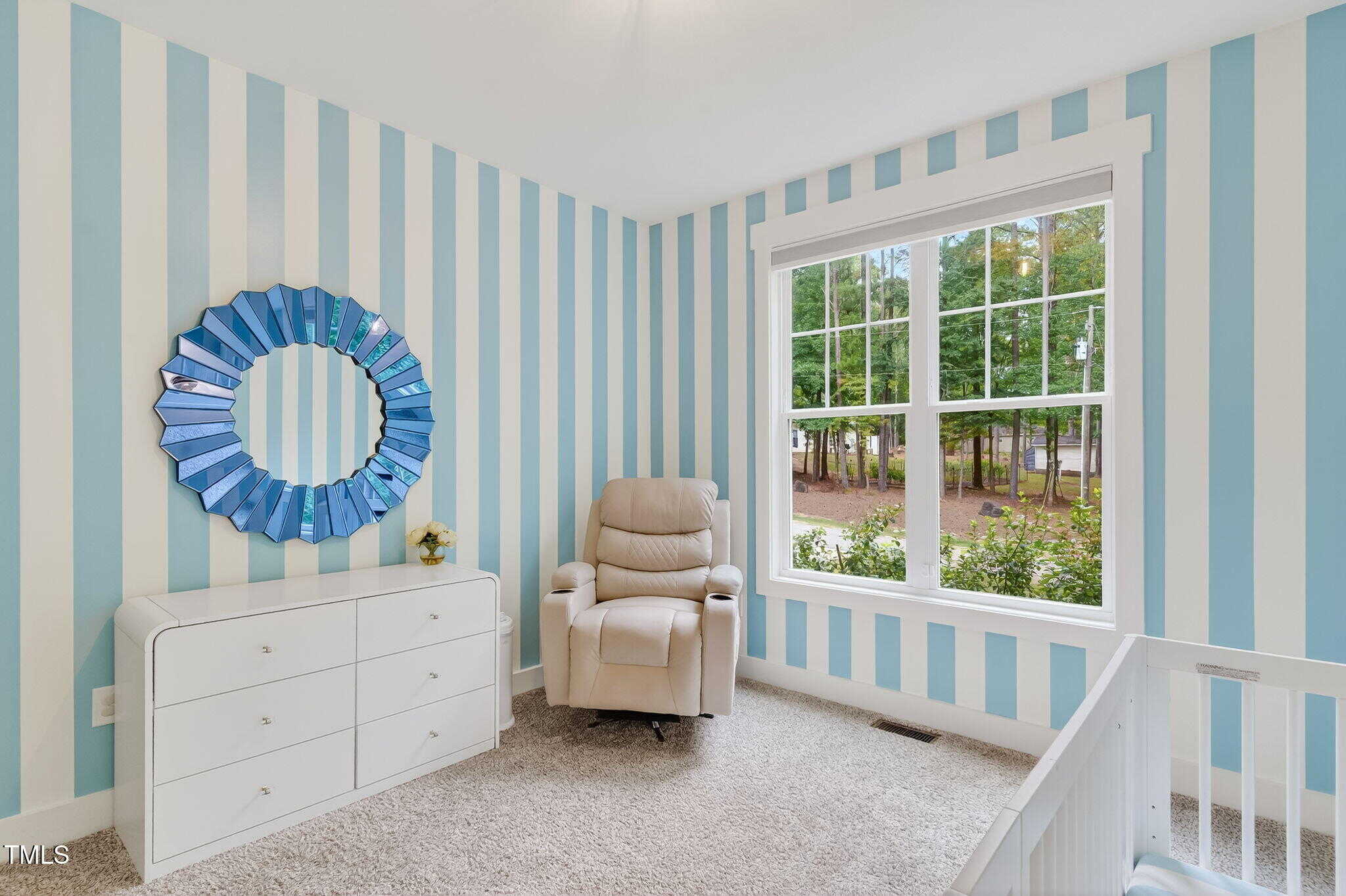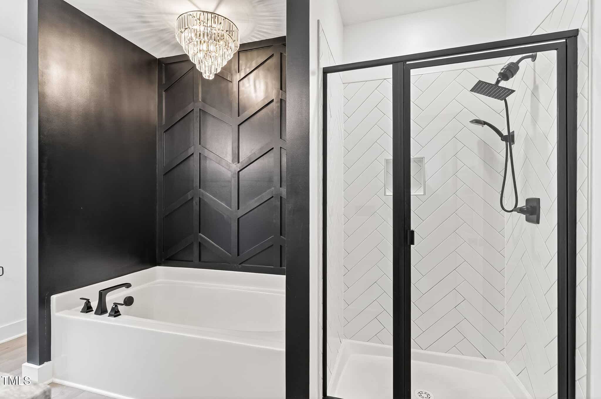 The primary bedroom welcomes you with tall ceilings, a walk-in closet with custom built-ins, and a stunning accent wall. The primary bathroom is a true retreat with a full tile shower, and a chandelier + accent wall combo that you’ll have to see to believe. Both secondary bedrooms host oversized windows and excess closet space.