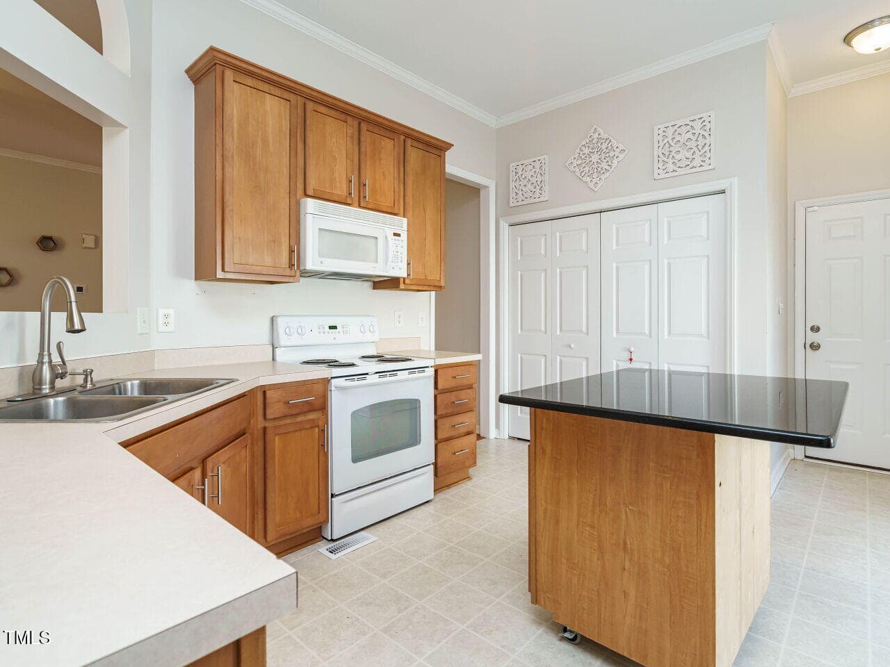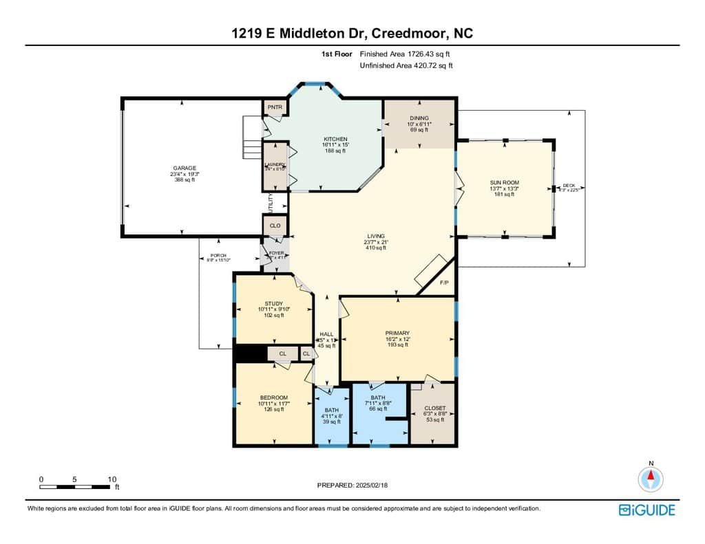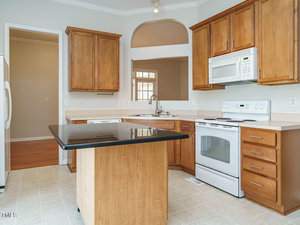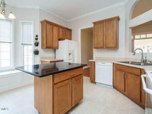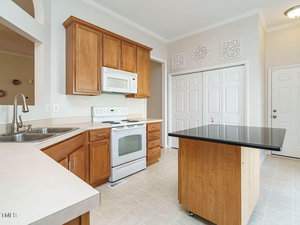 Designed with entertaining in mind, the spacious living room flows seamlessly into a bright sunroom, featuring six sliding glass doors—perfect for enjoying North Carolina’s mild spring and fall days. The kitchen is equipped with ample cabinetry, a pantry, an eat-in breakfast area, and an open view into the living room. A separate dining room adds flexibility for gatherings.