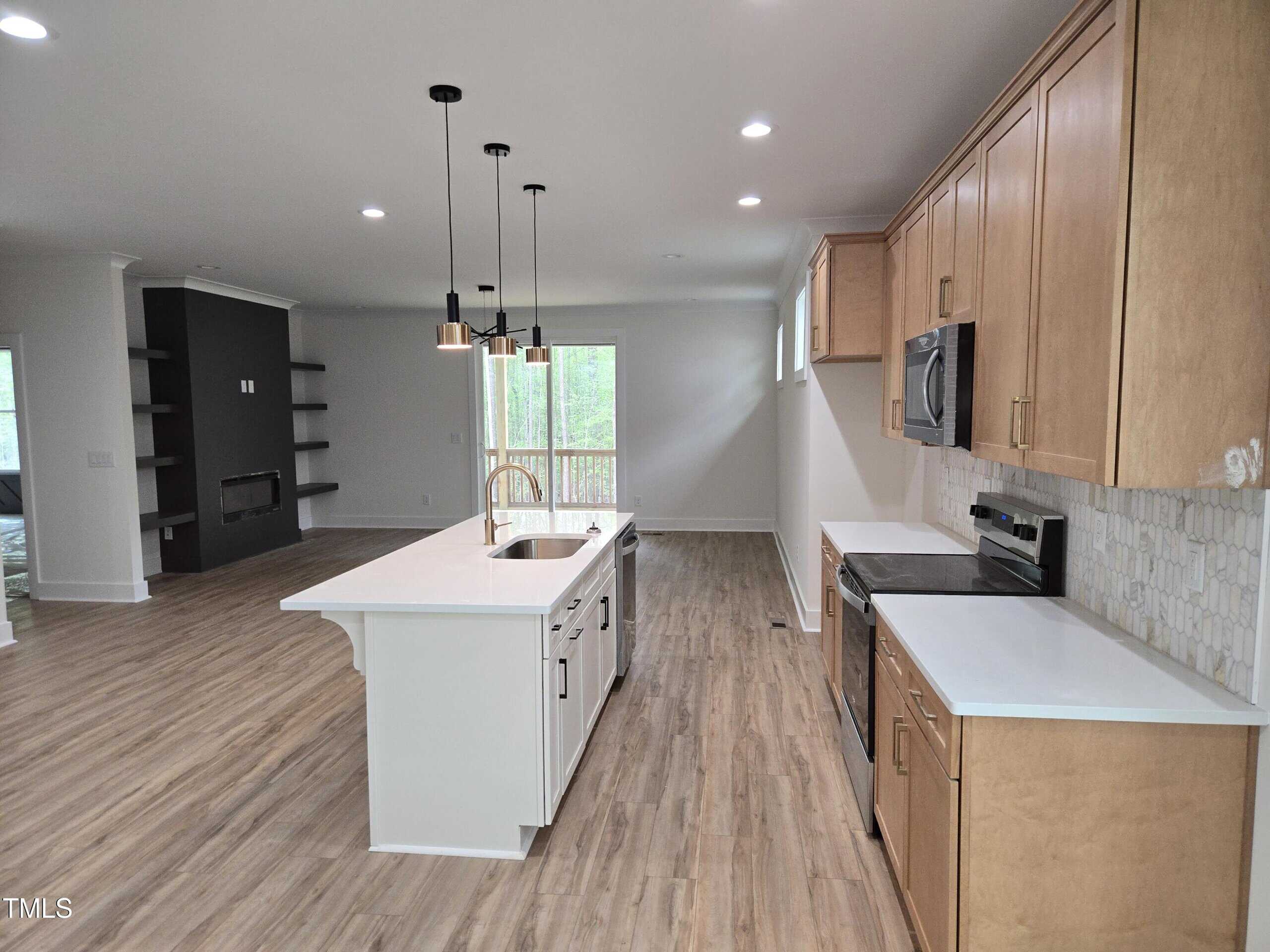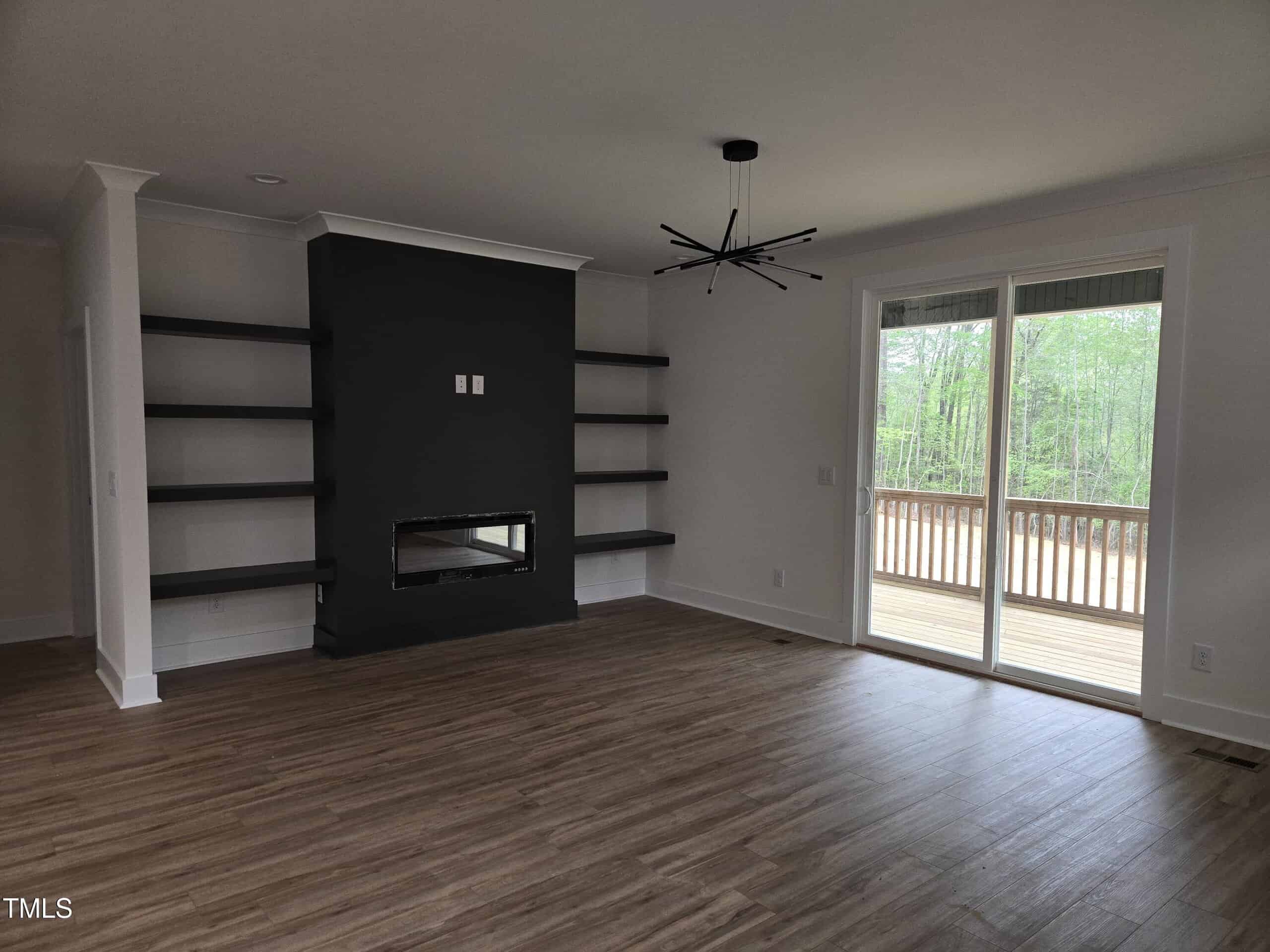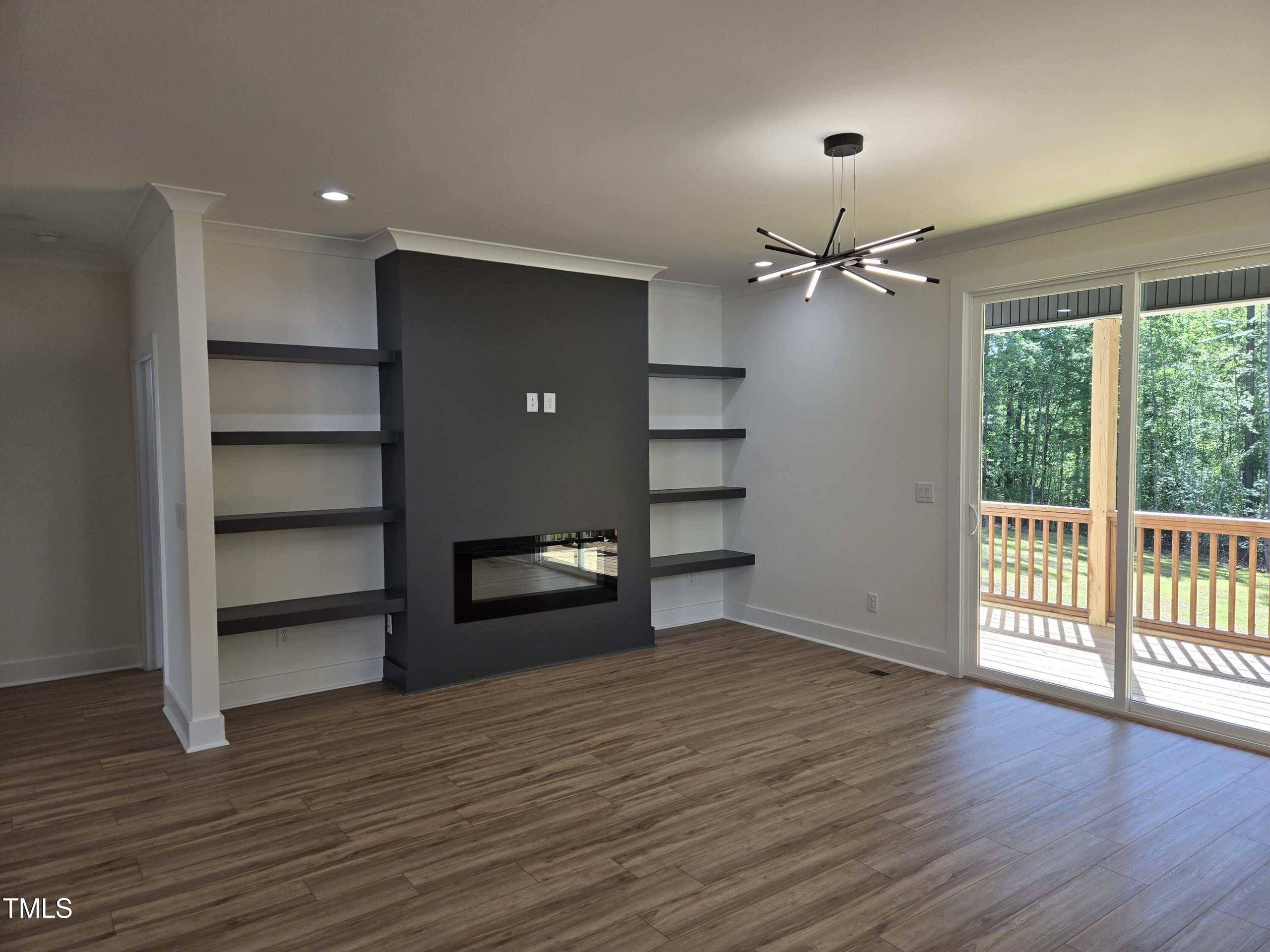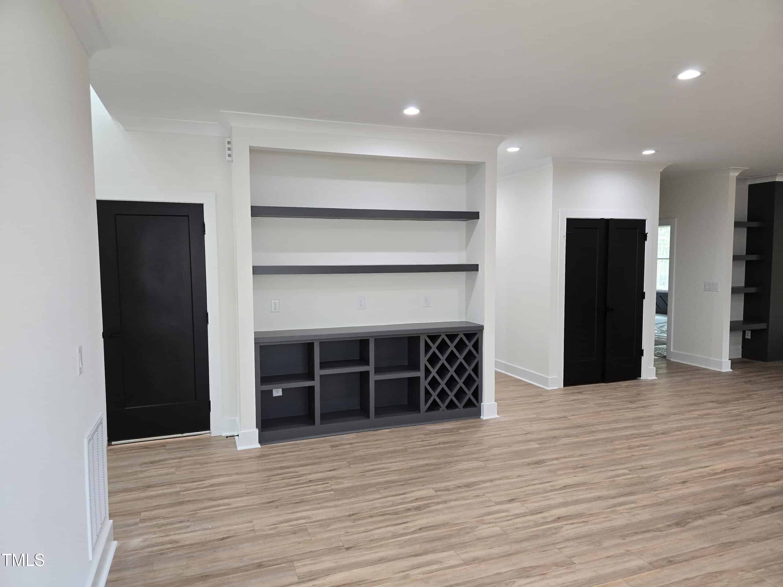 Mid Century Modern home by Lilium Homes. Open concept plan with split bedroom design. Custom trim work throughout home. LVL vinyl and carpet. Floating shelves in family room. Center island with seating. Primary suite with large walk in shower double vanities and large walk in closet. Accent wall in primary bedroom. Custom shelves in dining area. 2 car garage