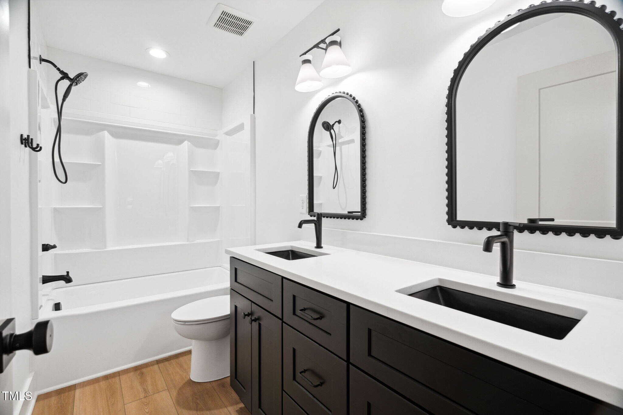 Upstairs the primary suite features a stunning tiled shower (rain head + handheld), framed mirrors, sconces, private water closet with Smart toilet and Walk-In Closet with custom shelving. Don’t miss the Large laundry room with cabinets and floating shelf! Two spacious bedrooms with a full bath (double vanity) and Huge bonus room—perfect for a theater, gym, or game room.
