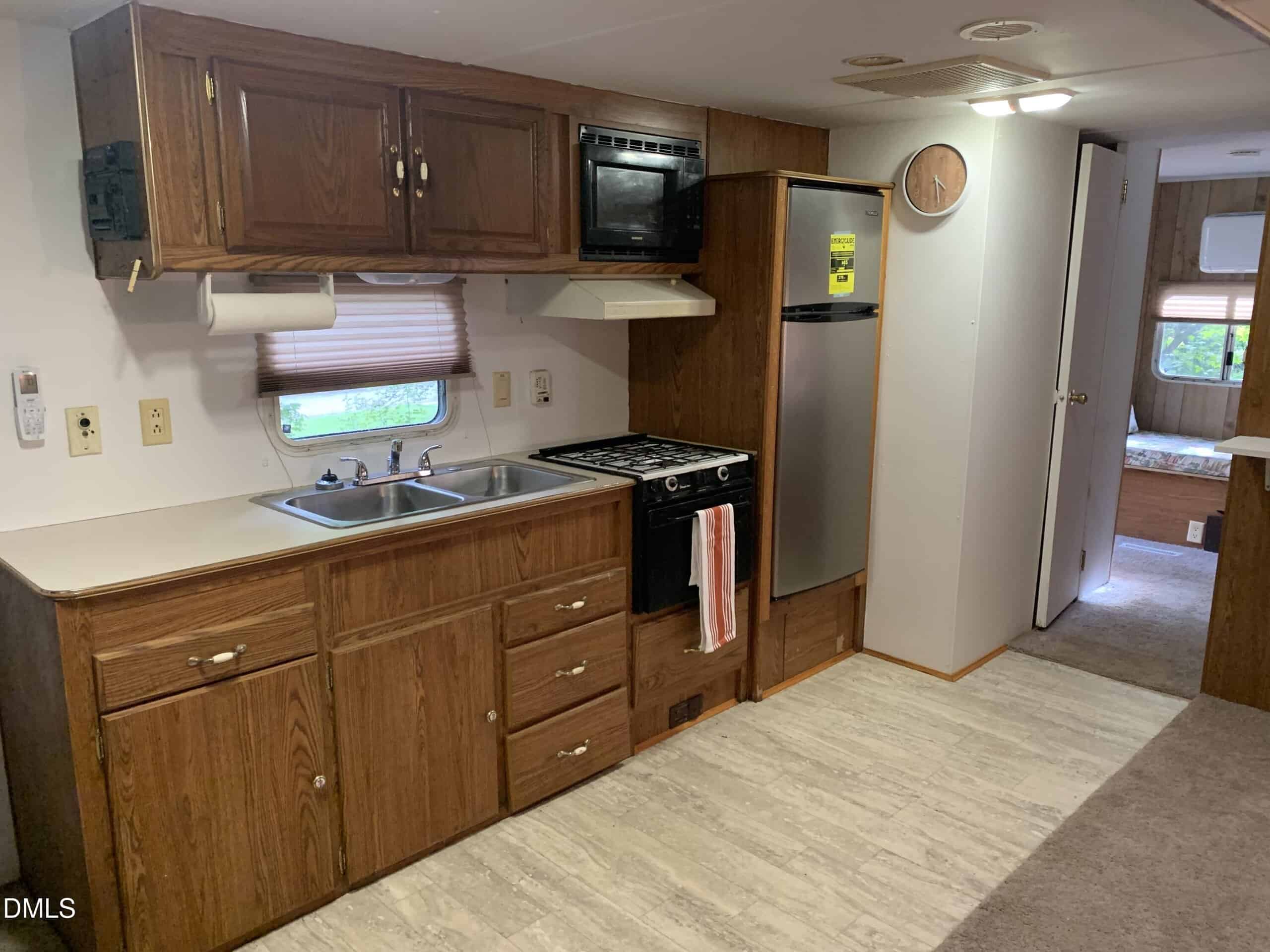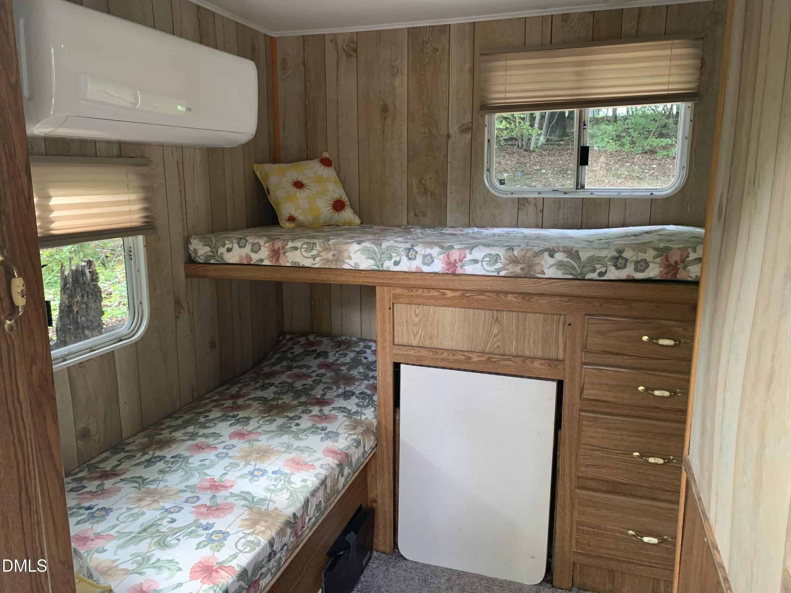 The Backyard is private and backs up to Green Space. Kitchen has Newer Refrigerator and is open to the Living Space. The main sleeping area offers a Double Bed with night stands and storage closets. The Second Sleeping area has 2 Bunk Beds with Built in dresser drawers.