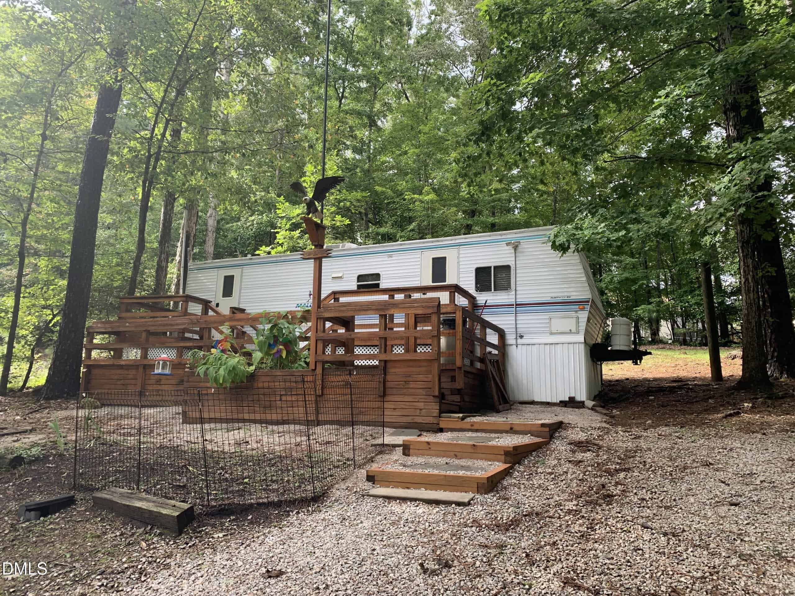 A Great Weekend Retreat at Lake Royale. Beautiful Lot conveniently located close to the Boat Ramp, Bath house, Basketball court and Lake Store. This lot offers lots of shade for those hot summer days and nights. The Backyard is private and backs up to Green Space. Kitchen has Newer Refrigerator and is open to the Living Space. The main sleeping area offers a Double Bed with night stands and storage closets. The Second Sleeping area has 2 Bunk Beds with Built in dresser drawers. Newer Mini Split Heat and A/C, New Electric Panel. A Separate water meter. Enjoy your evenings on the expansive Deck. Plenty of Parking plus Room to Park an additional Camper. Storage Building out Back for your extras. 1999 Mallard with Bump-out. Such a Convenient location.