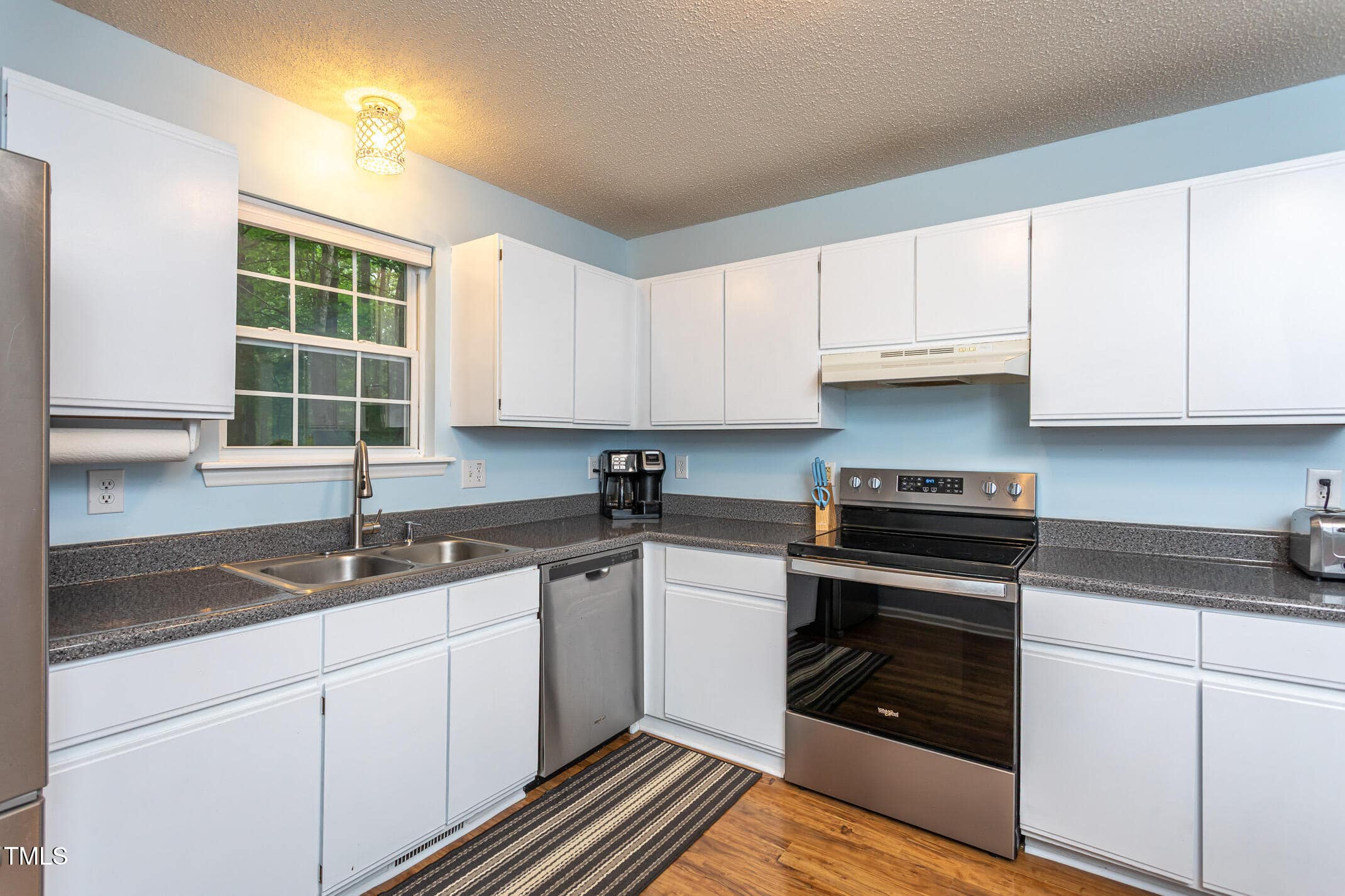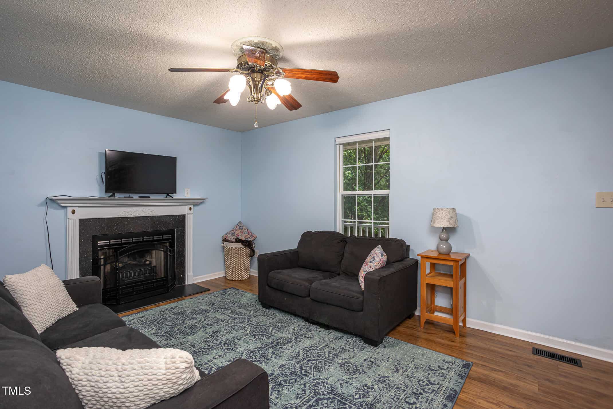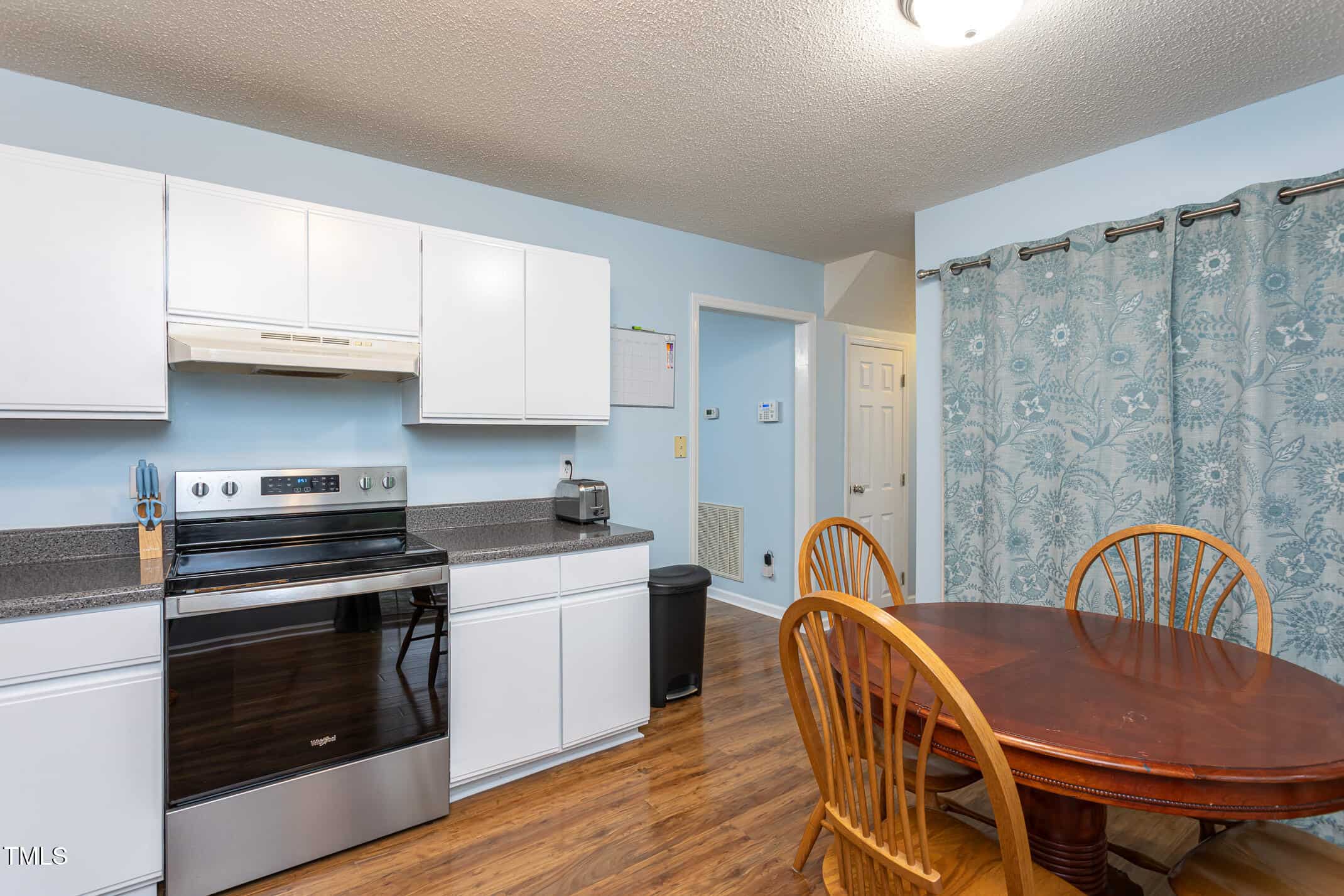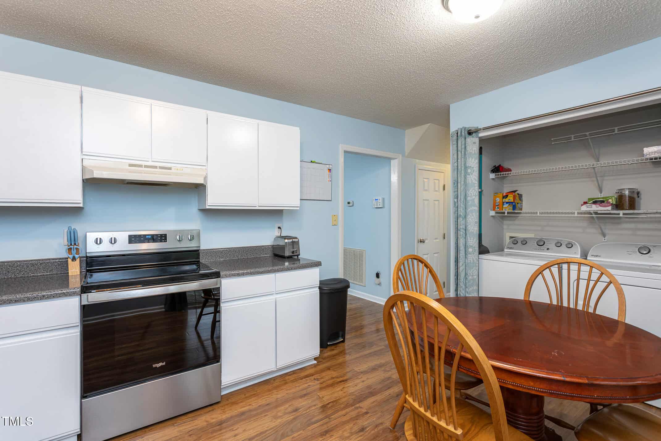 The cozy living room features a wood-burning fireplace and beautiful laminate floors. The eat-in kitchen is equipped with stainless steel appliances, painted cabinets, a pantry, and a convenient laundry area.