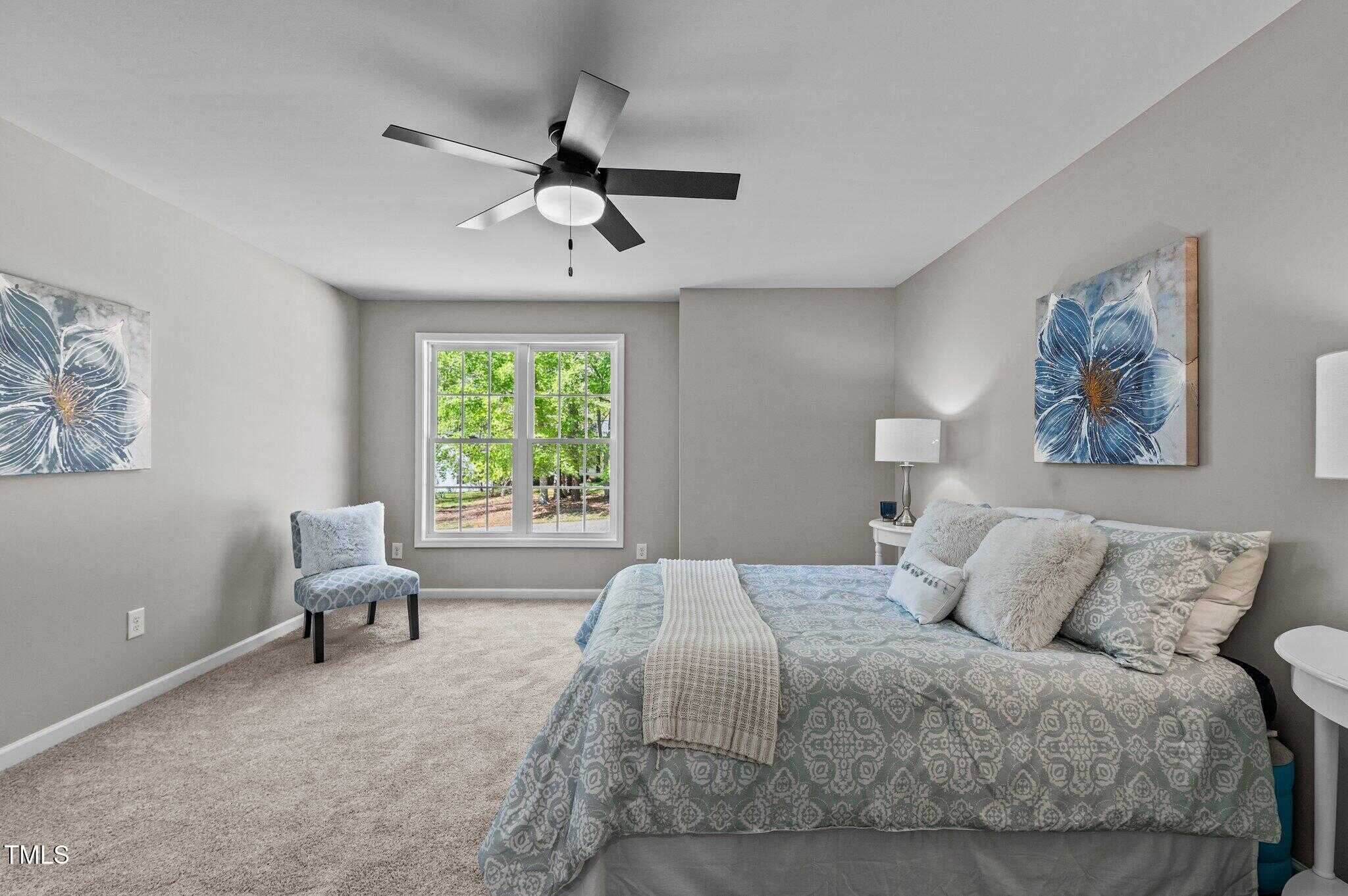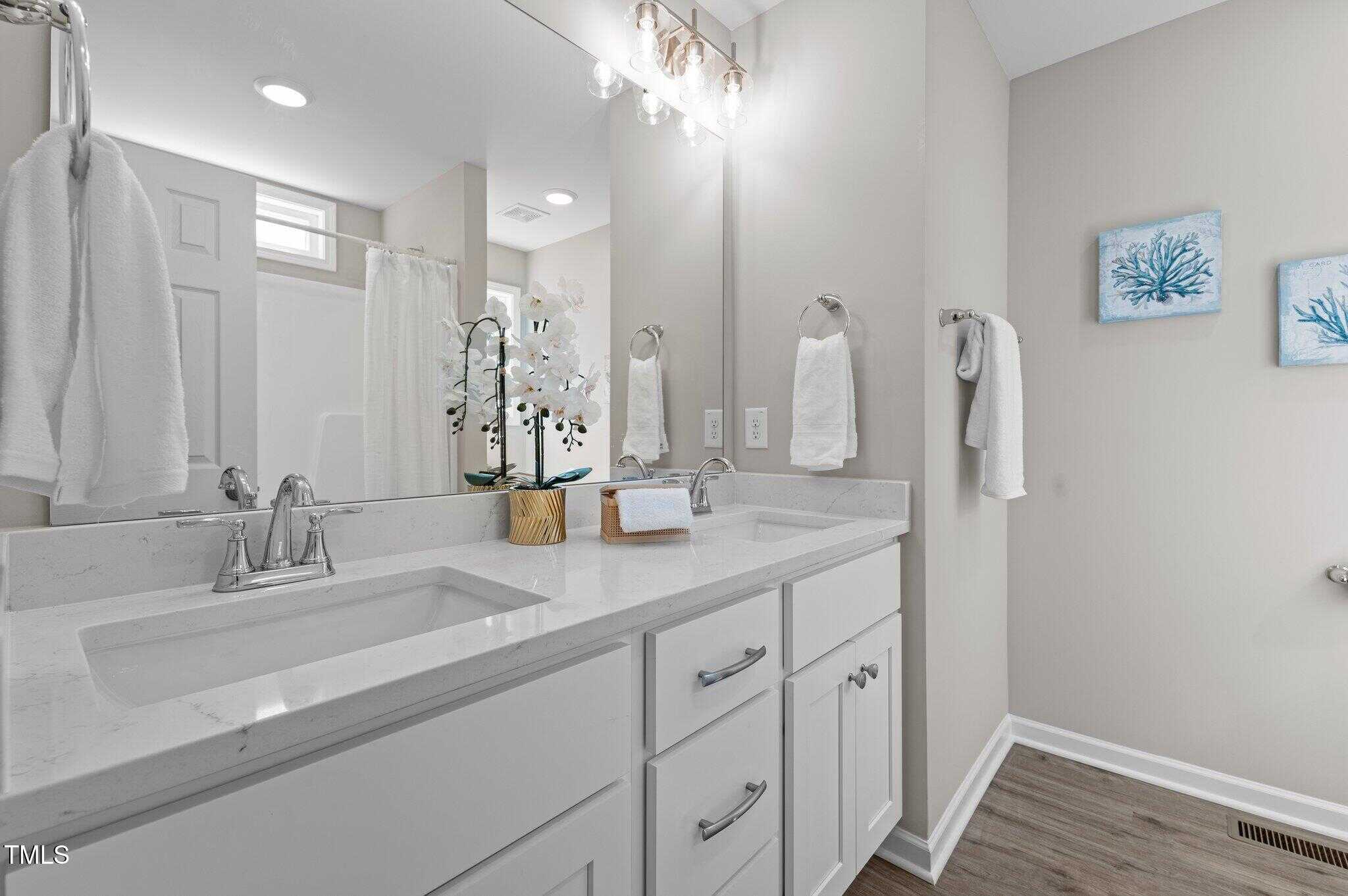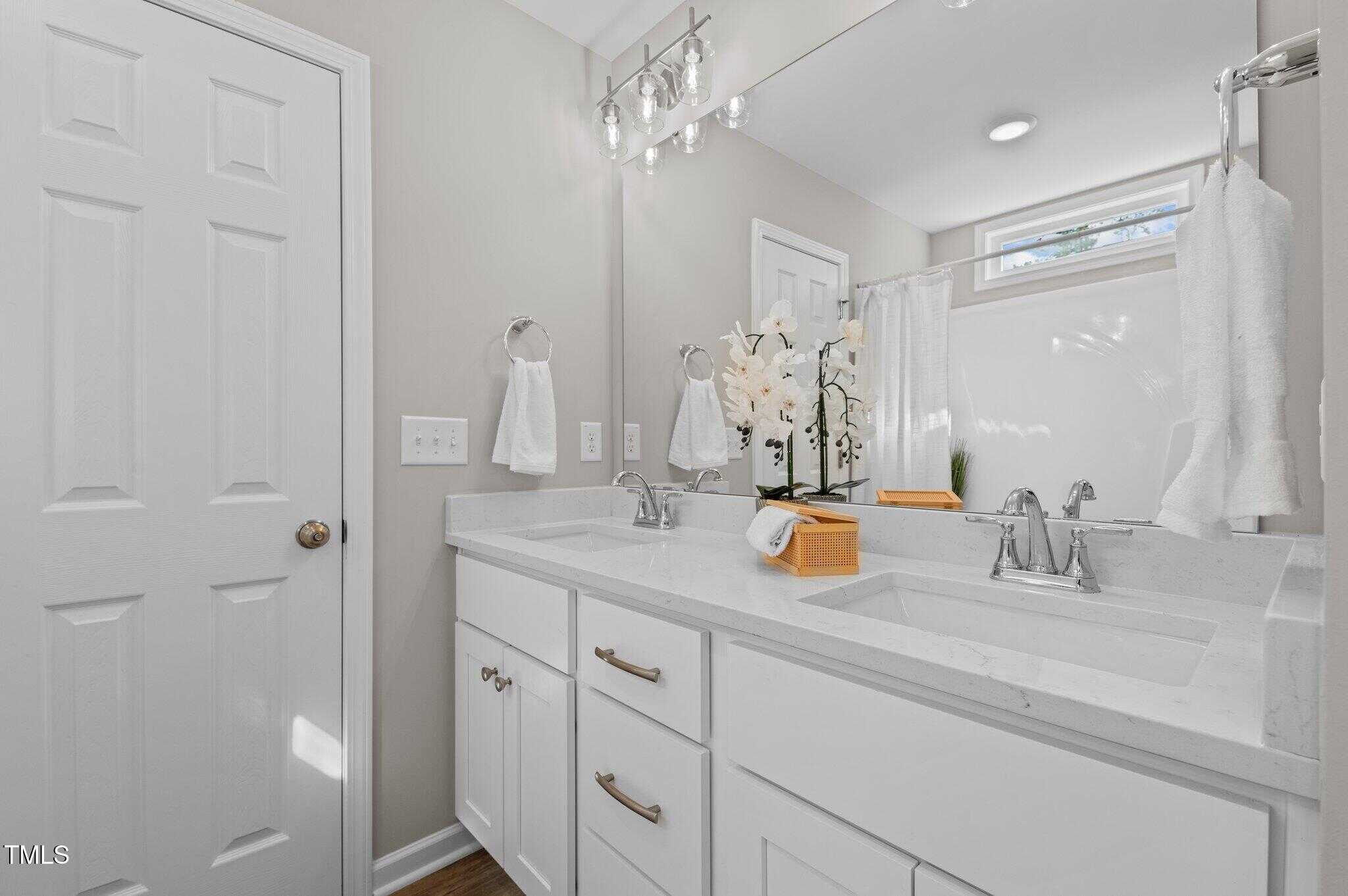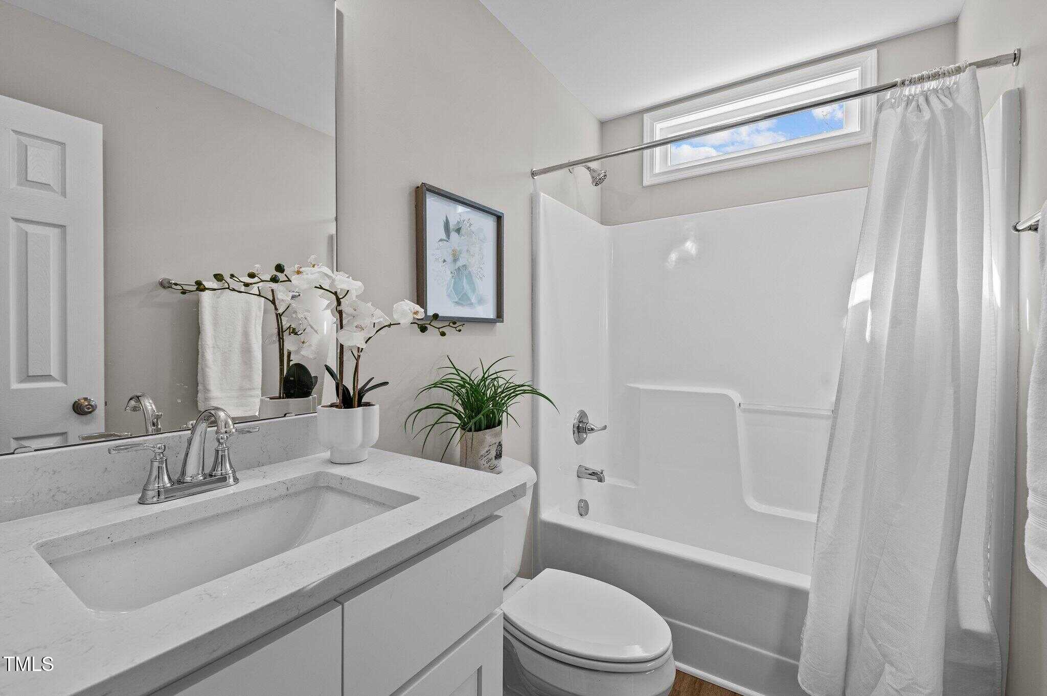 The primary suite is a private sanctuary with his and hers separate walk-in closets and a spa-inspired bath with dual vanities and a walk-in shower. Each secondary bedroom is generously sized and includes its own walk-in closet, offering plenty of space for everyone. The hall bathroom shines with natural light thanks to a transom window over the tub/shower combo.