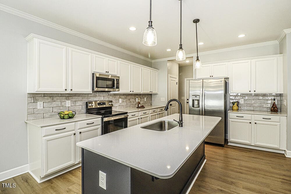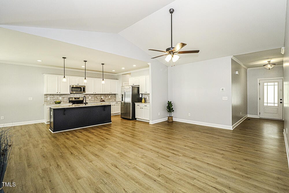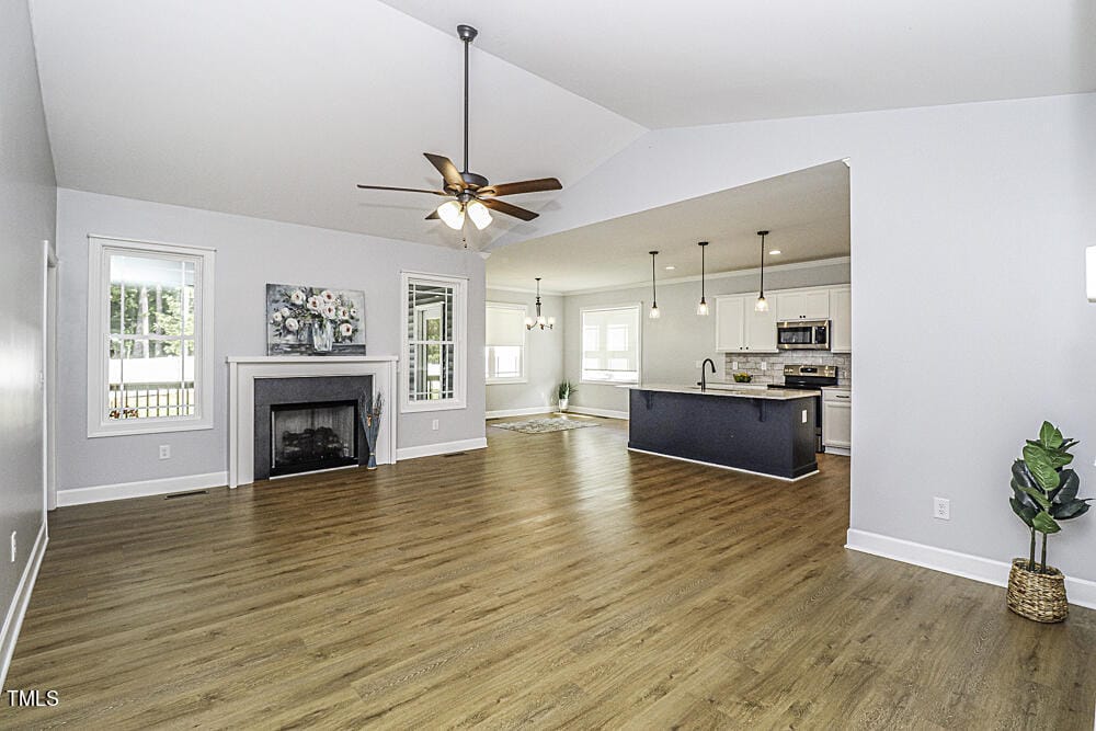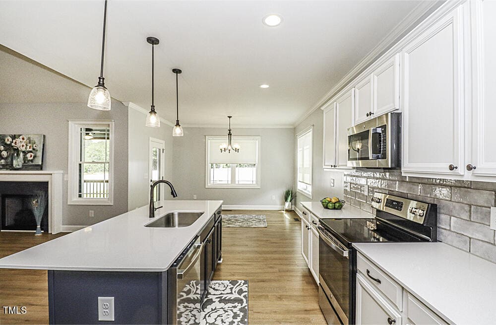 Gourmet Kitchen offers elegant quartz countertops, stainless steel appliances, a spacious work island/breakfast bar with a deep undermount sink, soft-close drawers, and a spacious eat-in dining area. Great Room showcases vaulted ceilings, a cozy gas fireplace, and luxurious vinyl plank hardwood flooring. Desirable open, split floor plan enhances the home’s flow and functionality.