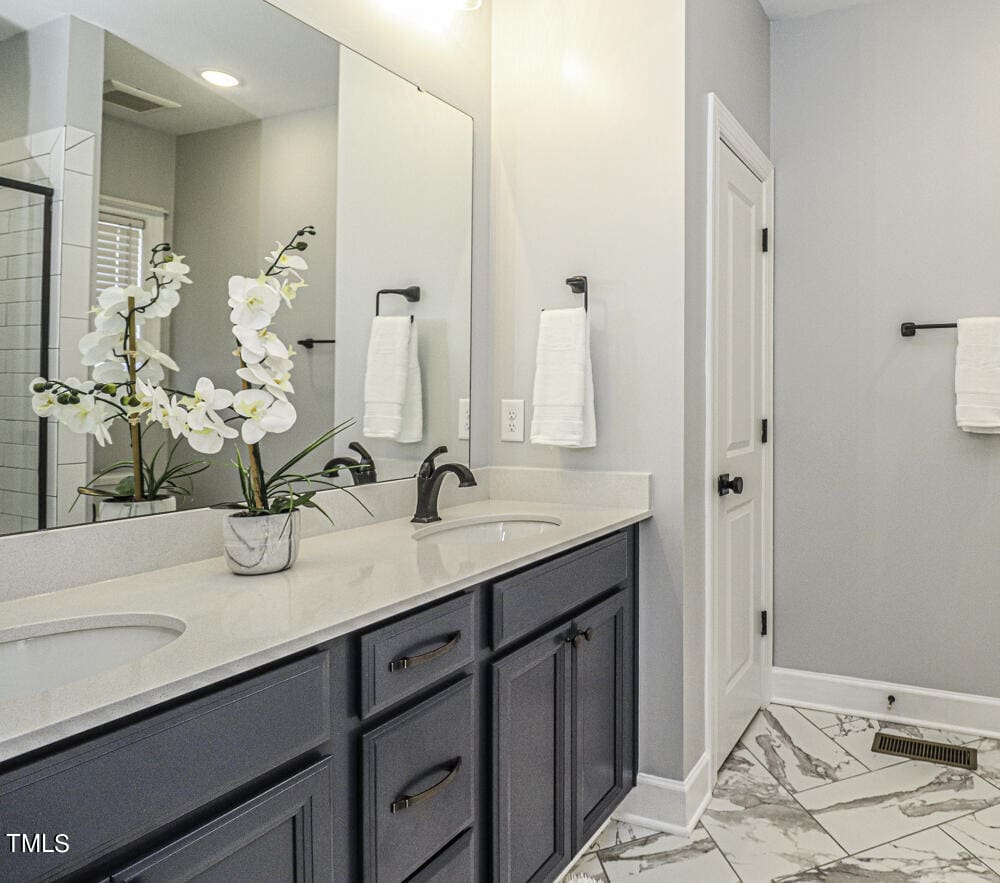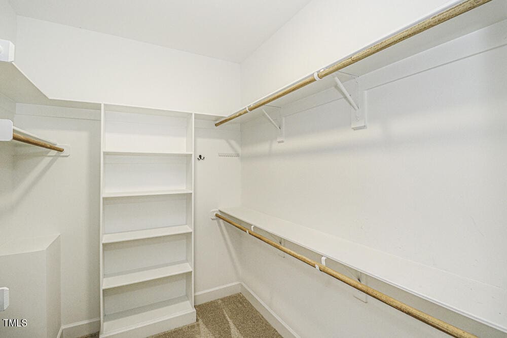 Owner’s retreat with a large walk-in closet featuring custom shelving. Luxurious owner’s bath offers marble ceramic tile flooring, elegant tile walk-in shower with an accent niche and bench, and his/her quartz vanities. Bedrooms 2 and 3 include double reach-in closets and 9-foot ceilings.